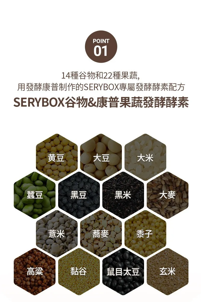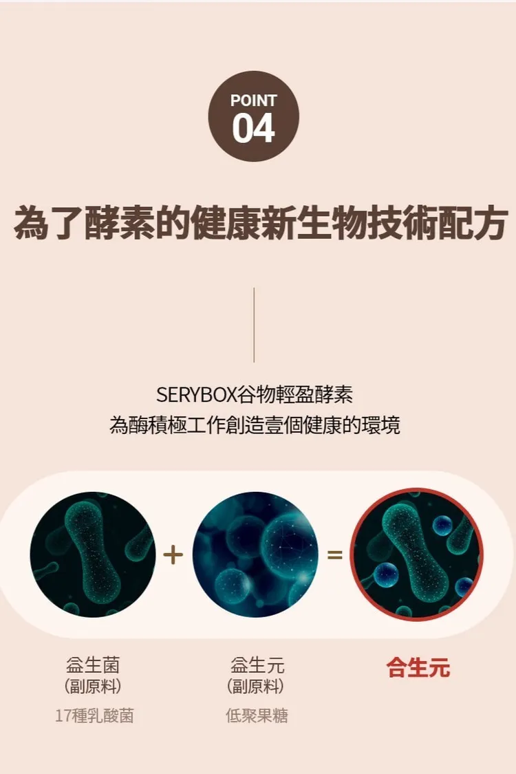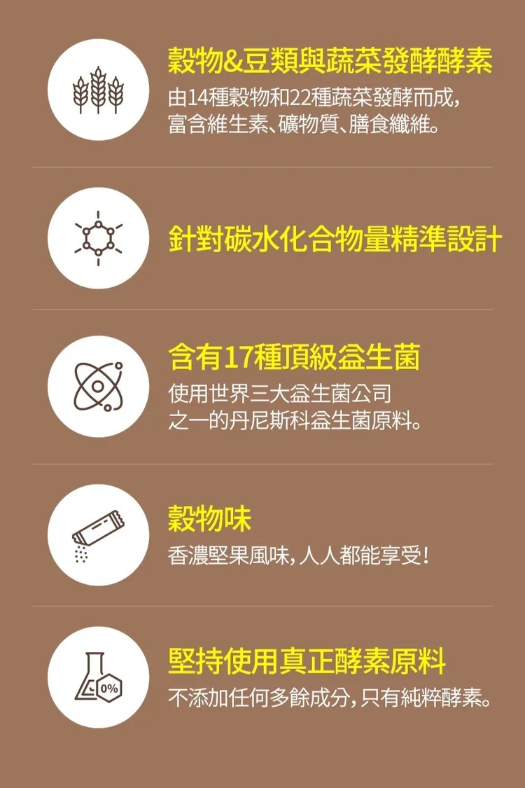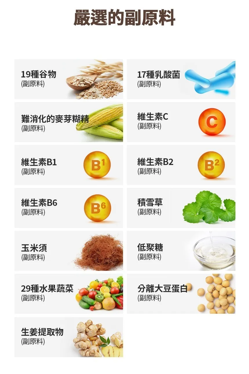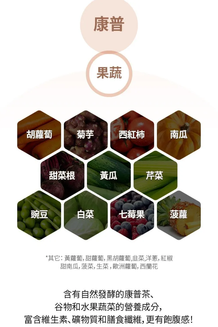 成份 : 14種穀物+22種康普蔬果發酵酵素+17種高級益生菌