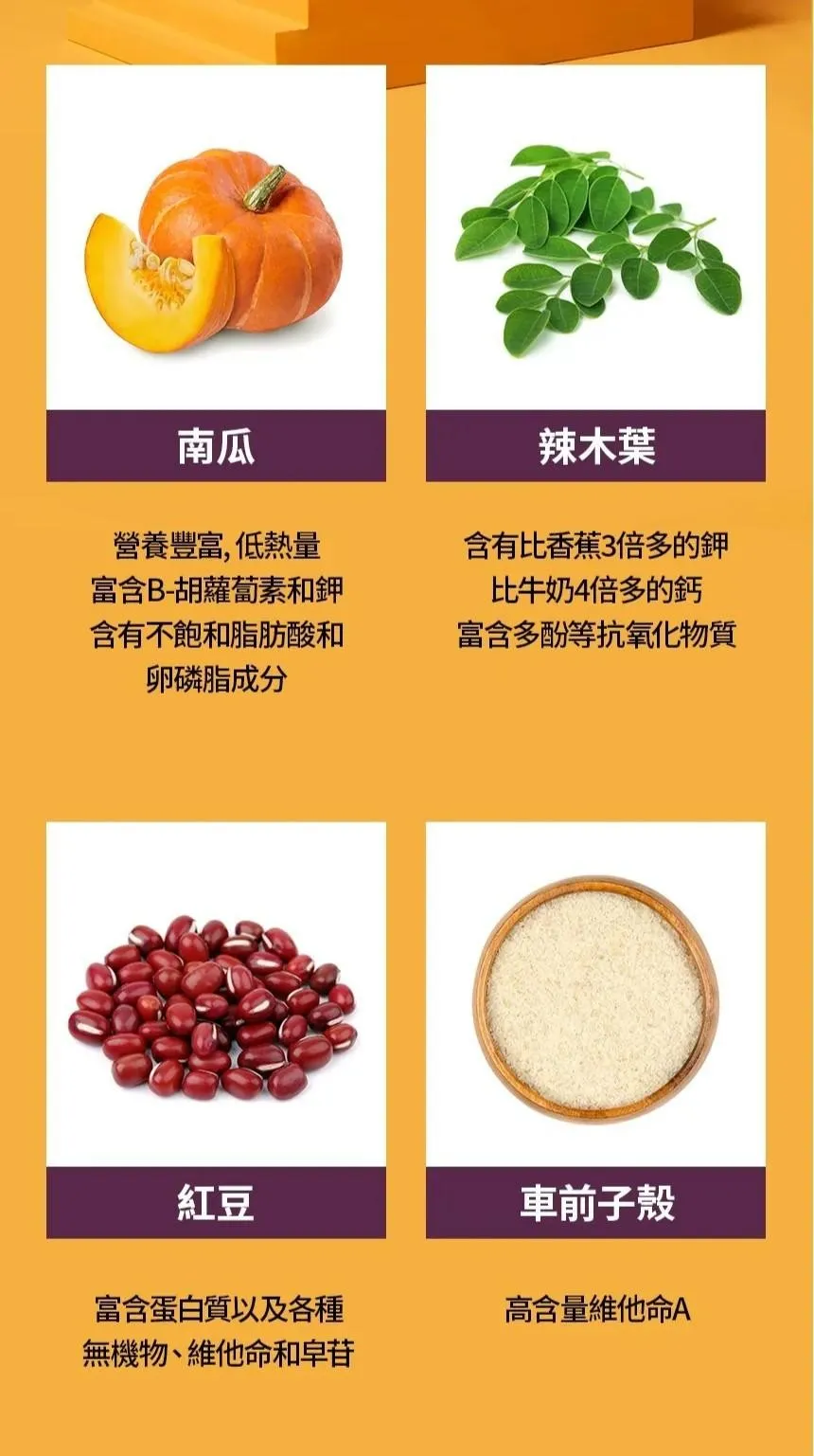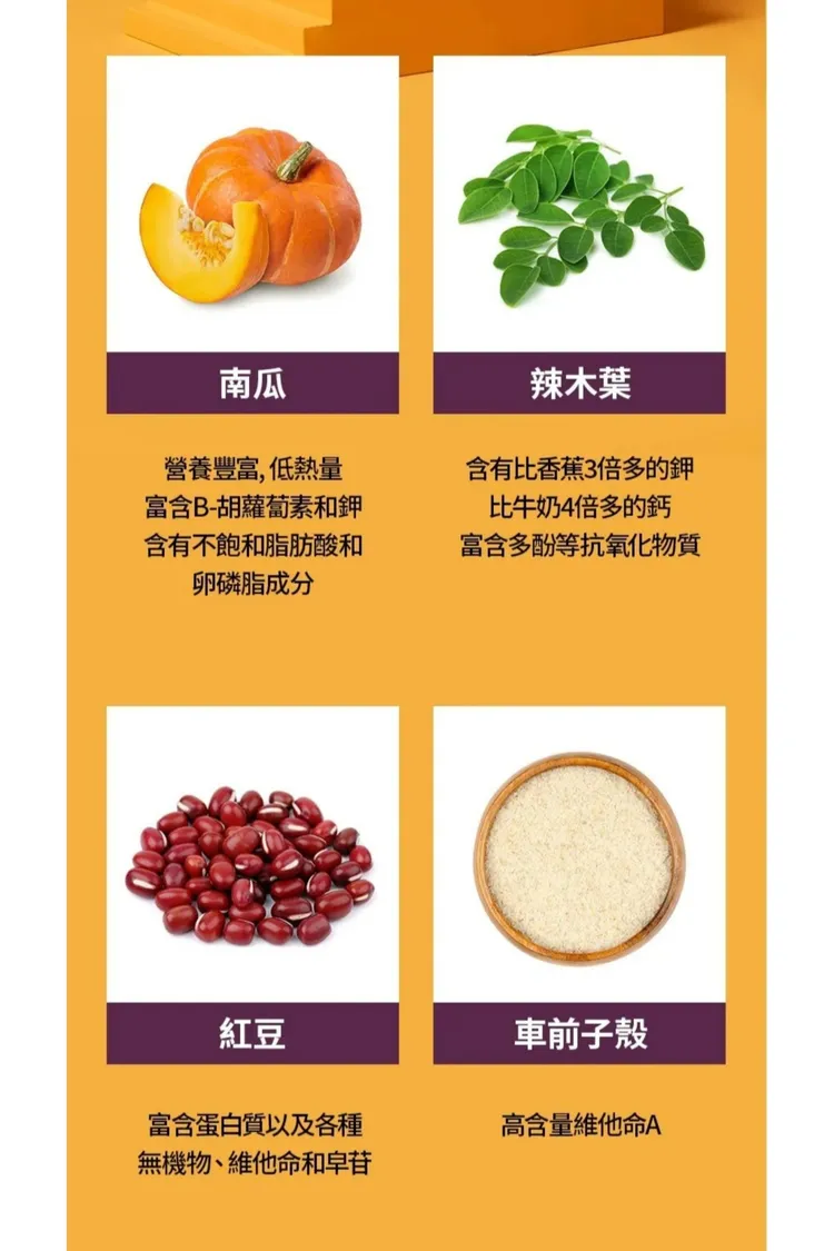 成份 : 黃瓜+辣木葉+紅豆+車前子殼+玉米鬚+仙人掌+黃芪+蒼朮+茯苓+扁豆