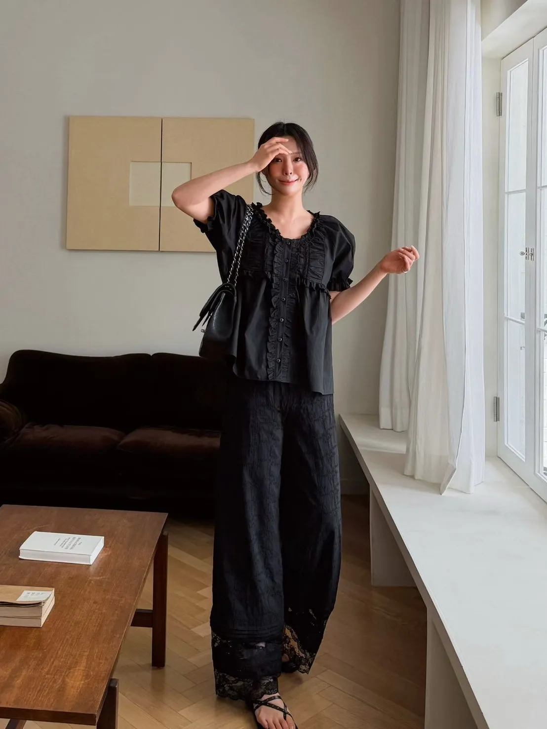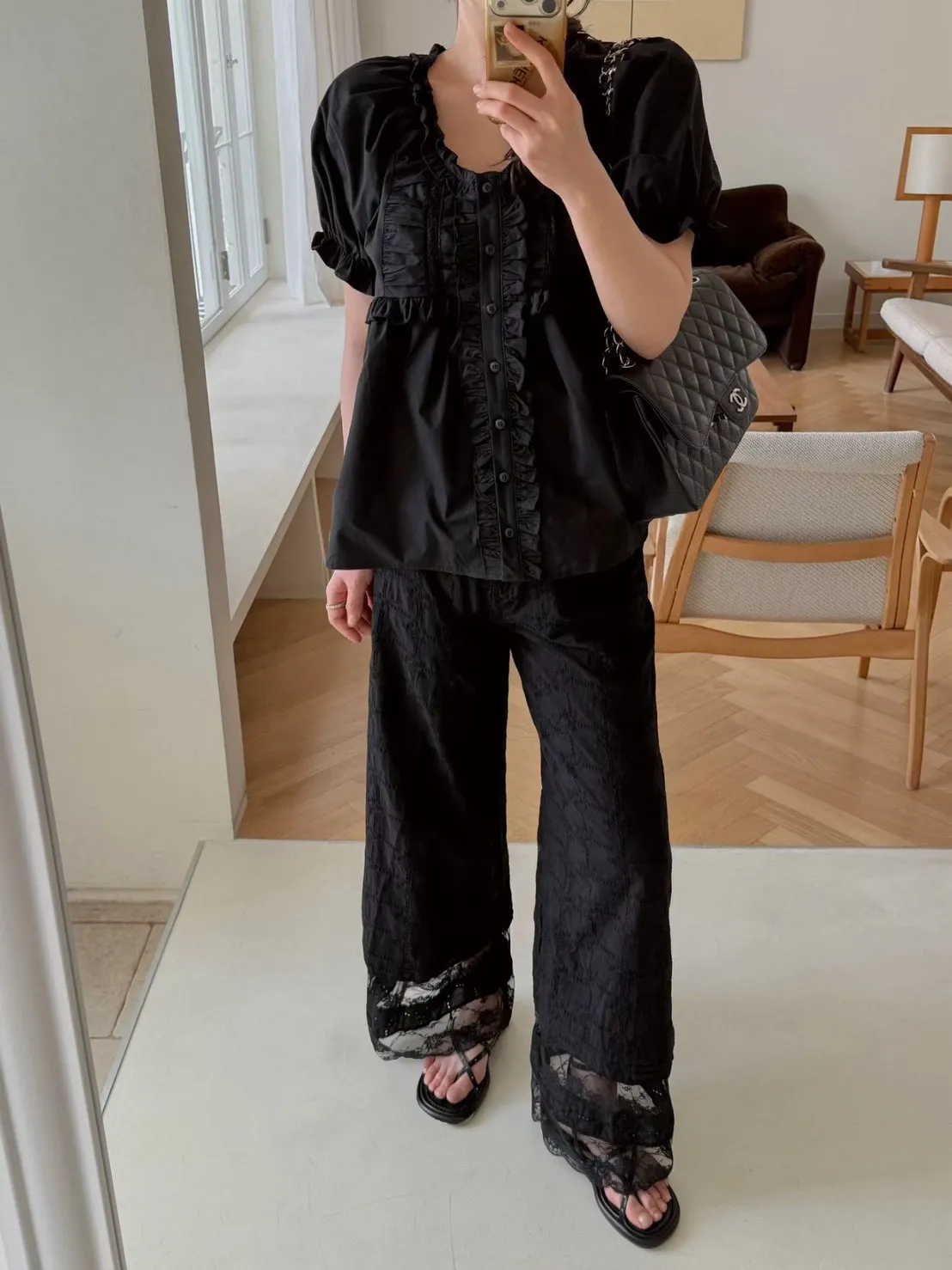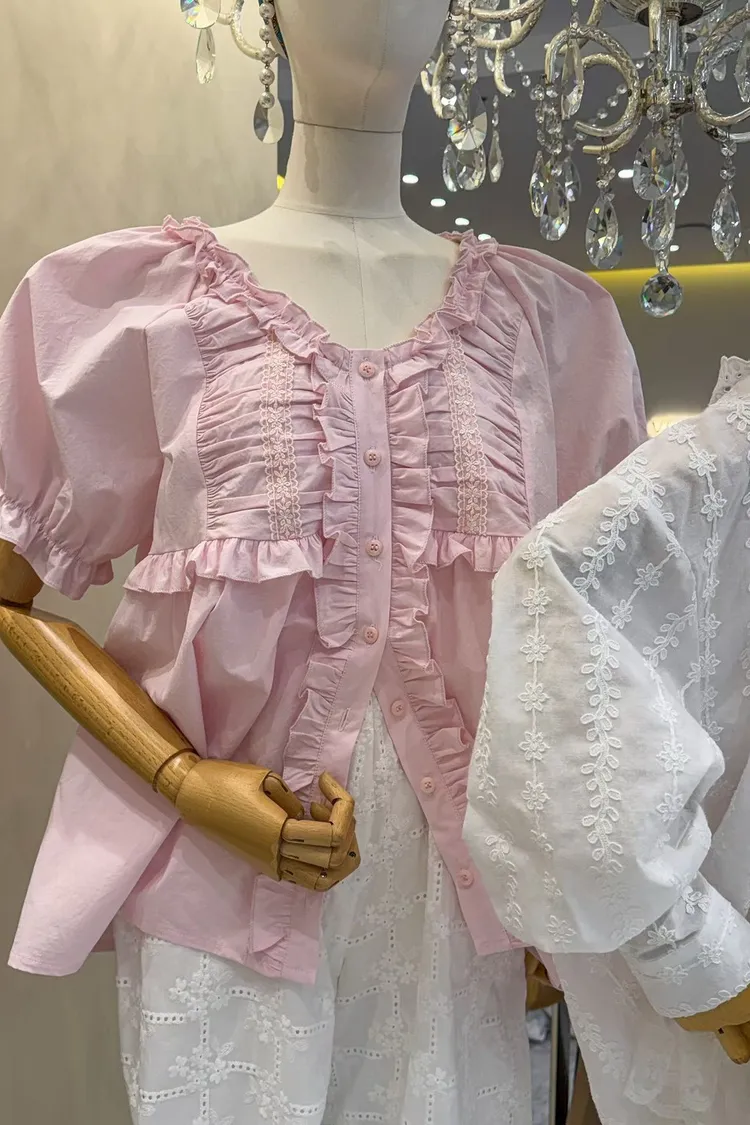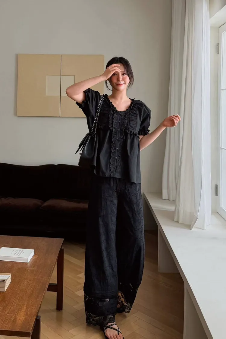 棉 胸前蕾絲抓皺 袖口彈性 寬鬆舒適 背後細緻抓皺 孕媽咪友善