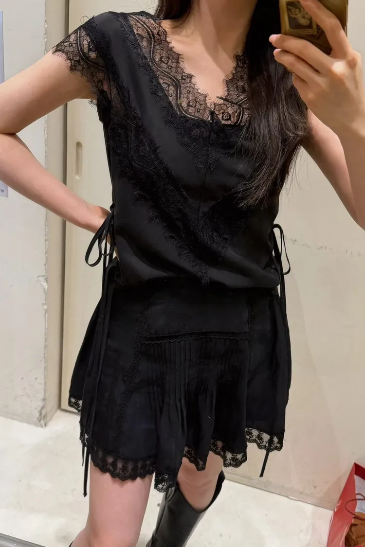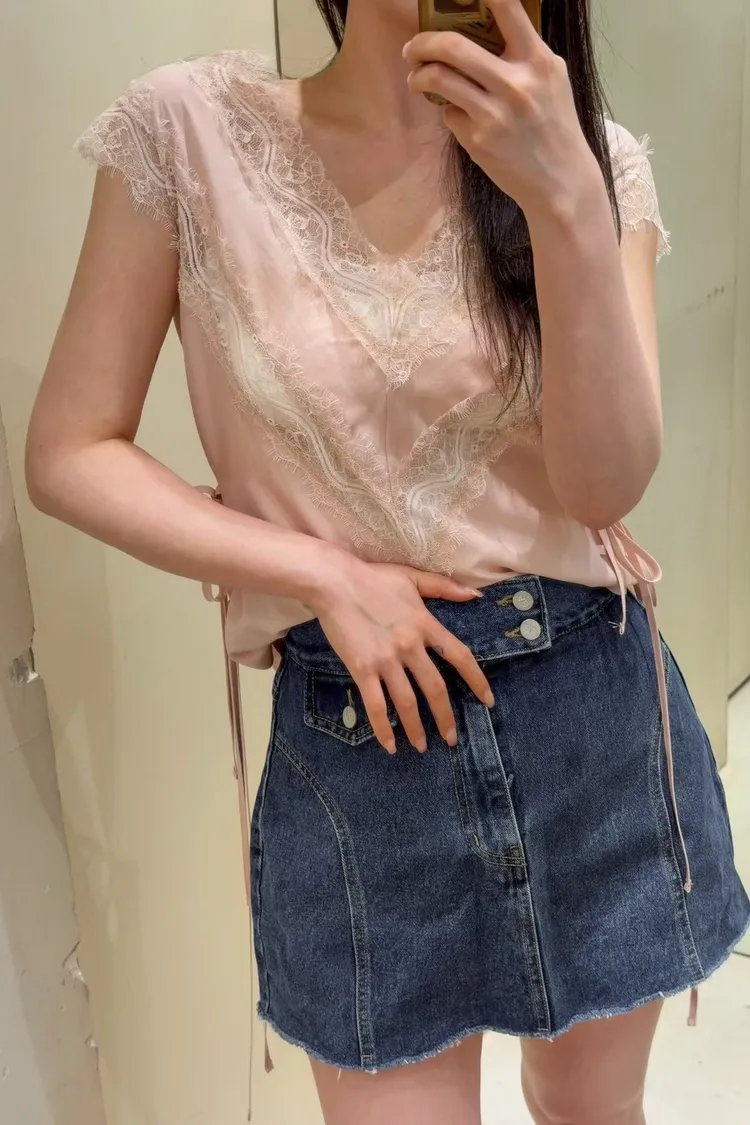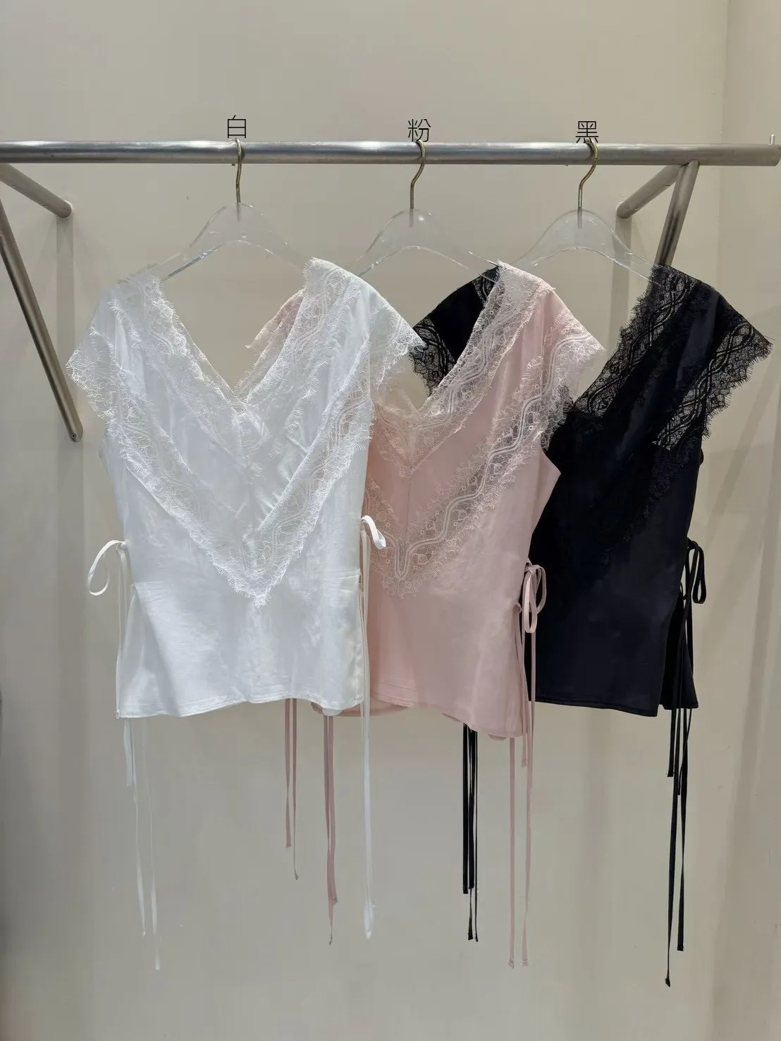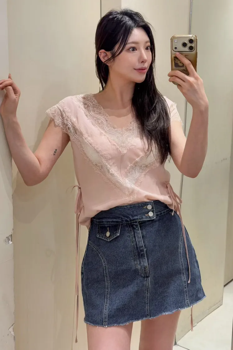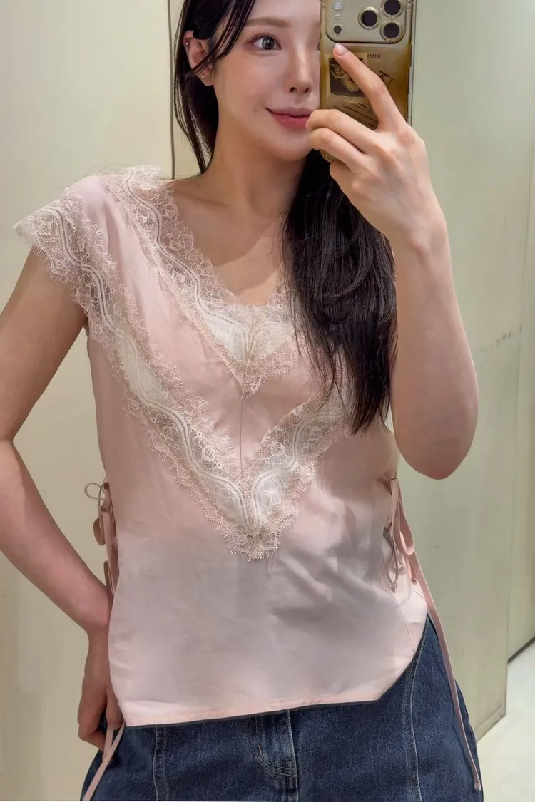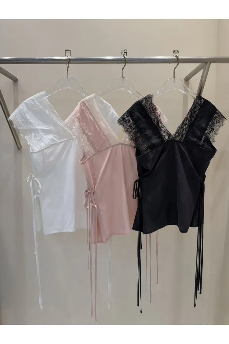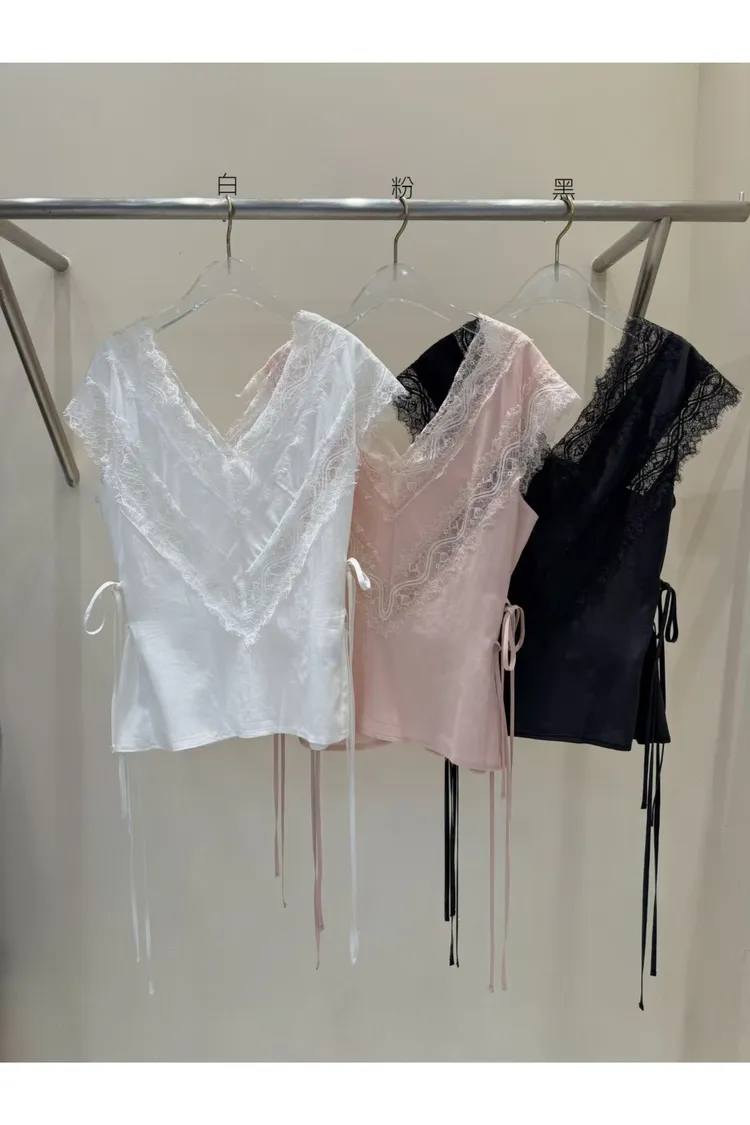 天絲100% 緞面光澤 蕾絲V領 視覺透光 側腰雙綁帶