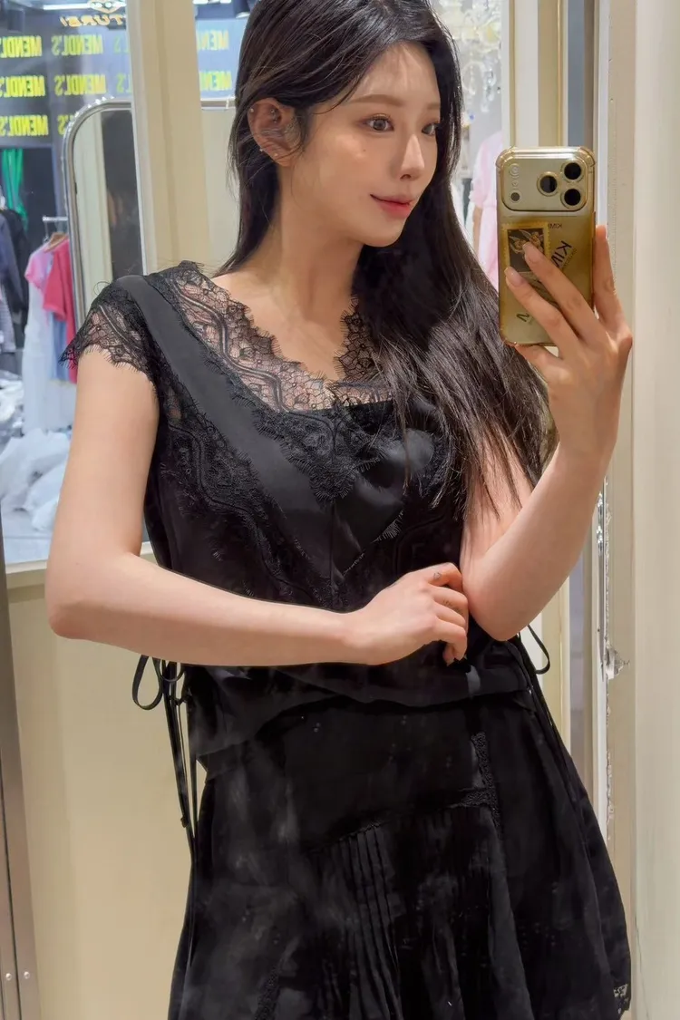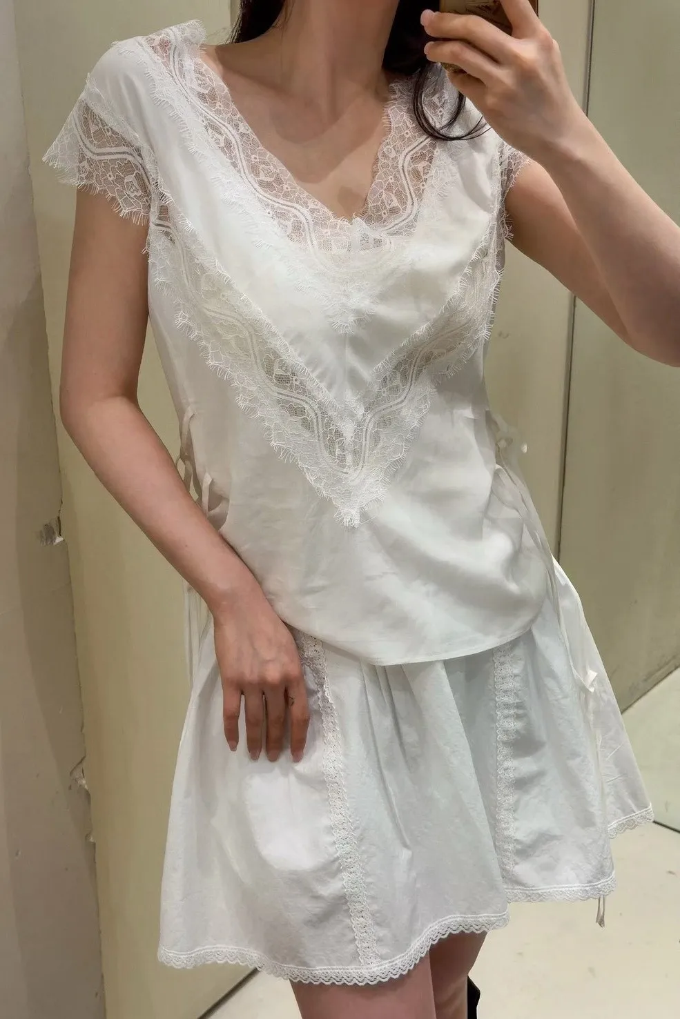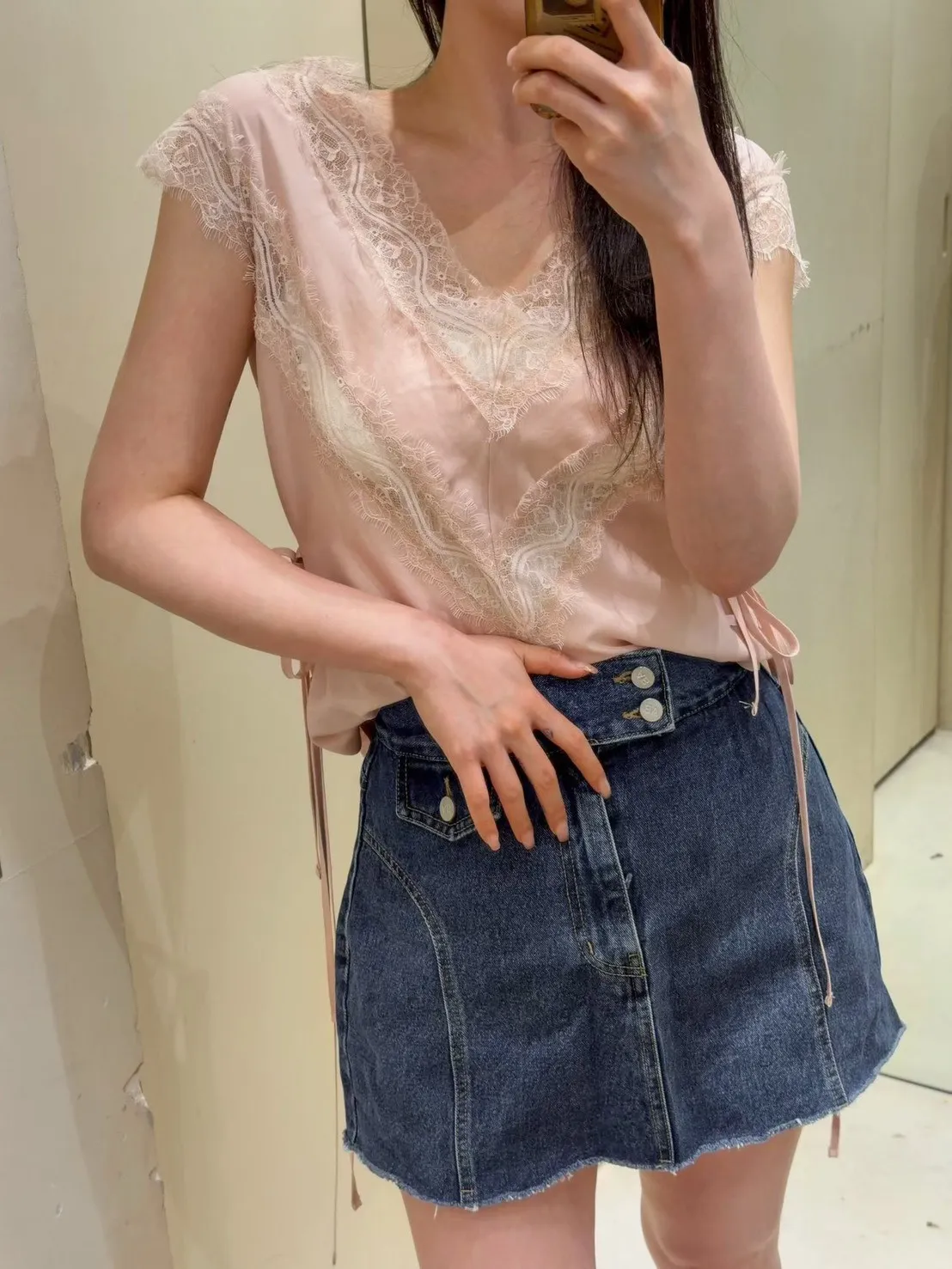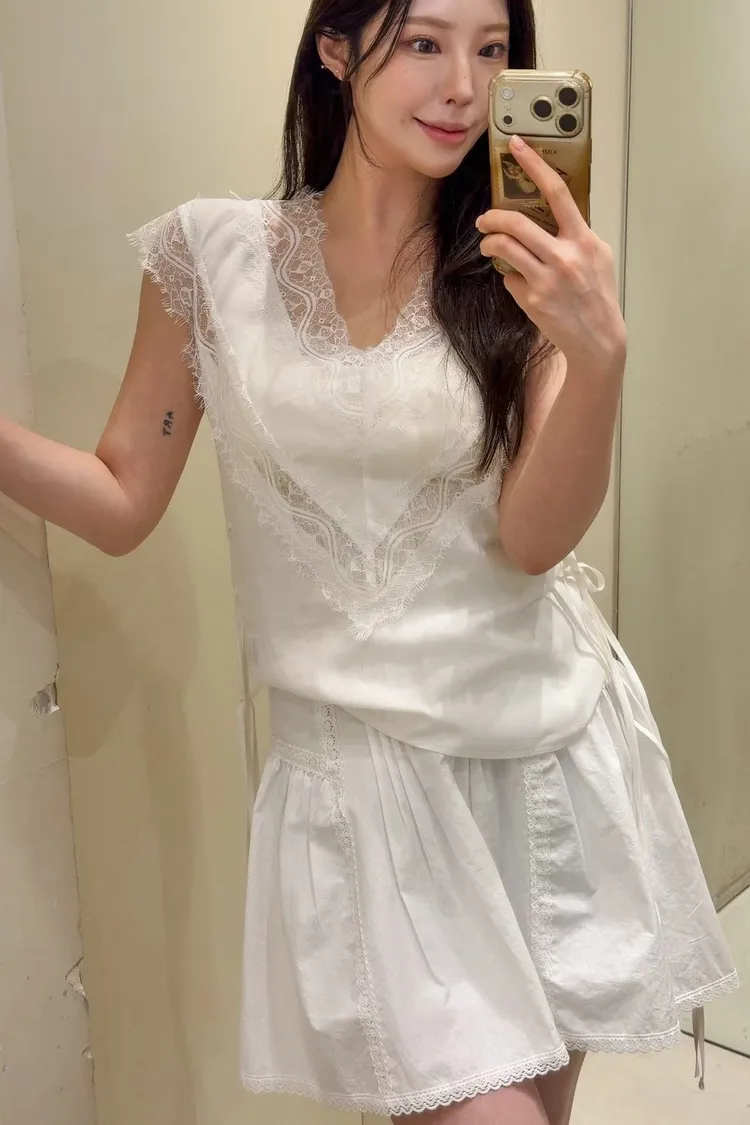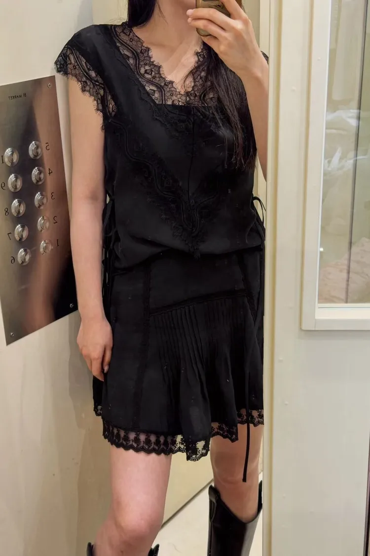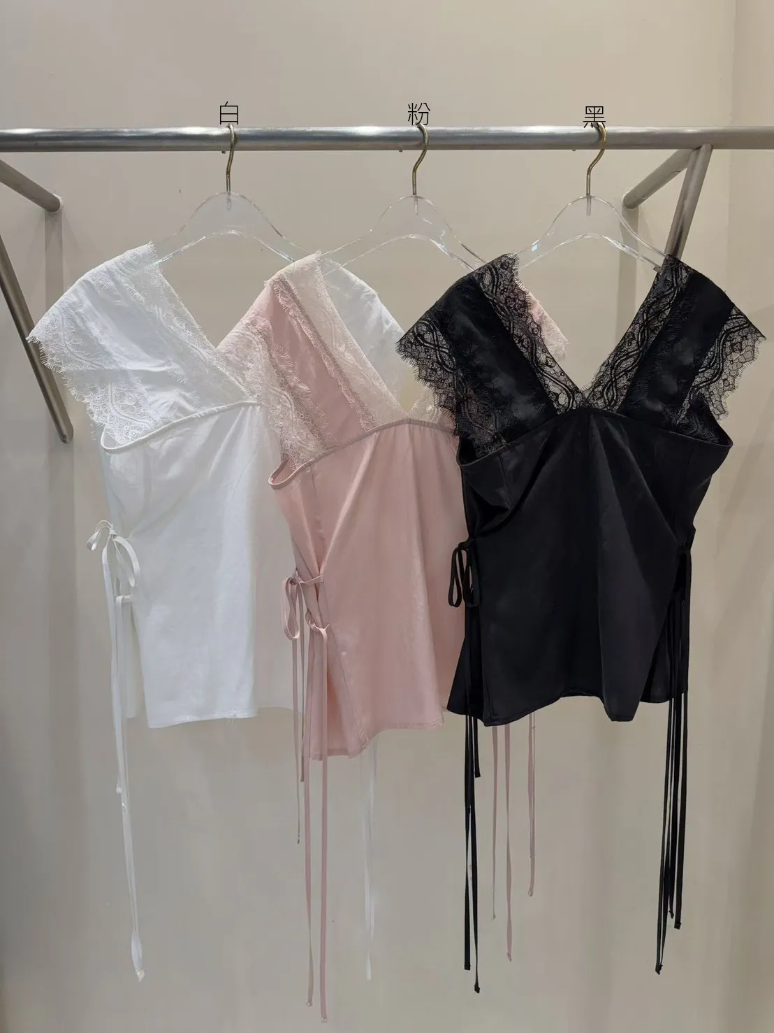 天絲100% 緞面光澤 蕾絲V領 視覺透光 側腰雙綁帶