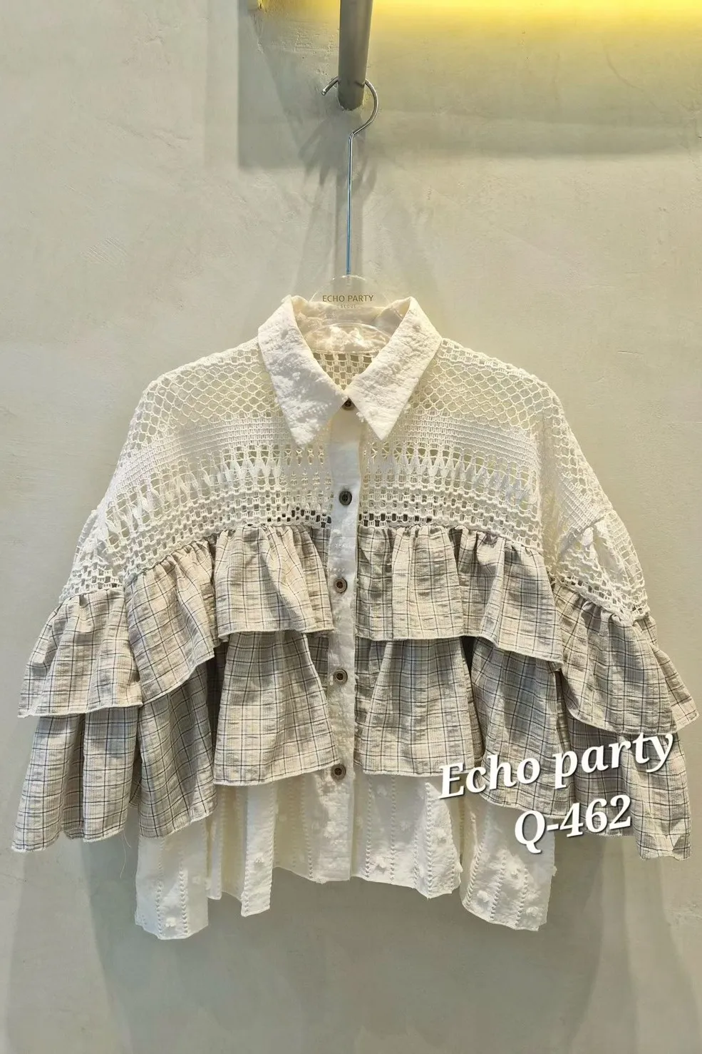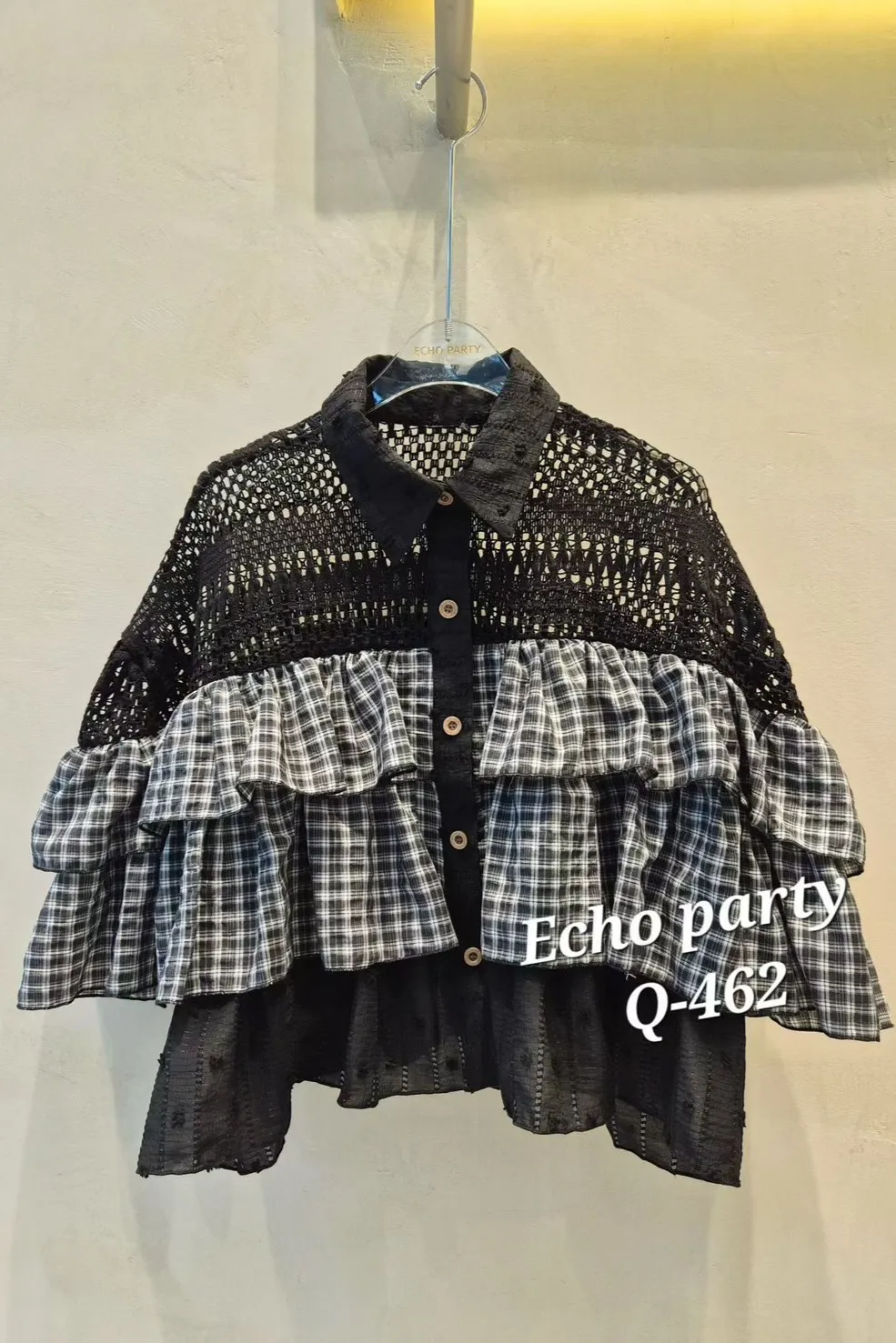 棉+雪紡 薄款面料 視覺漸層 簍空多層次 木頭釦 親膚舒適