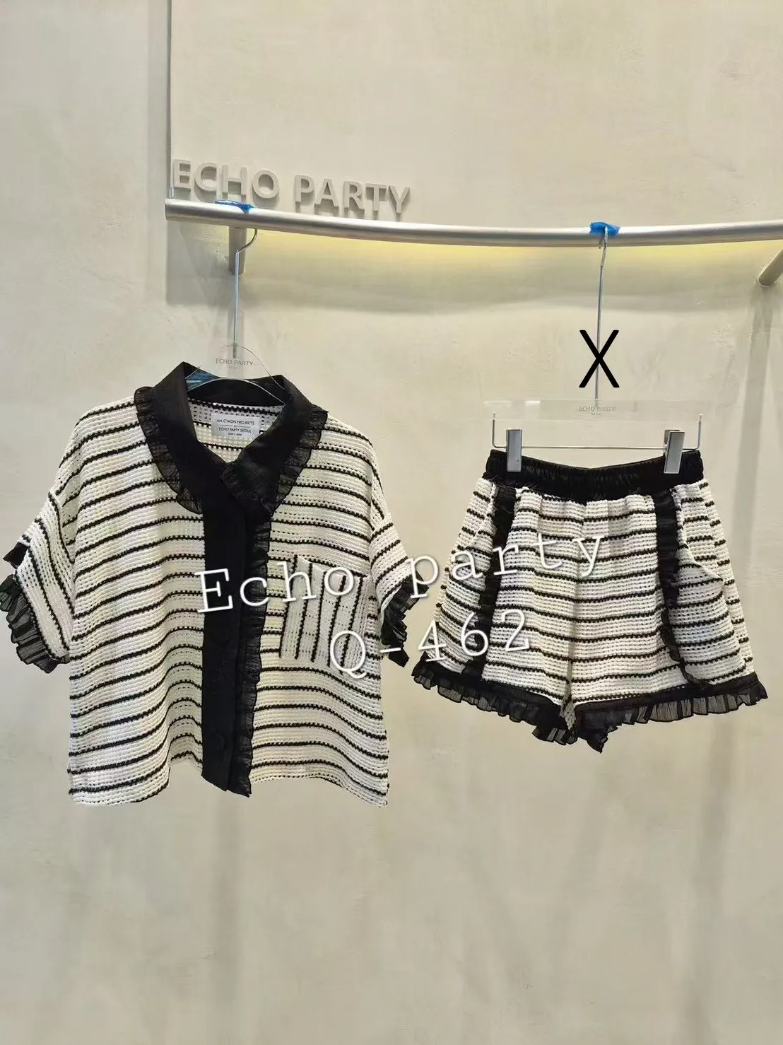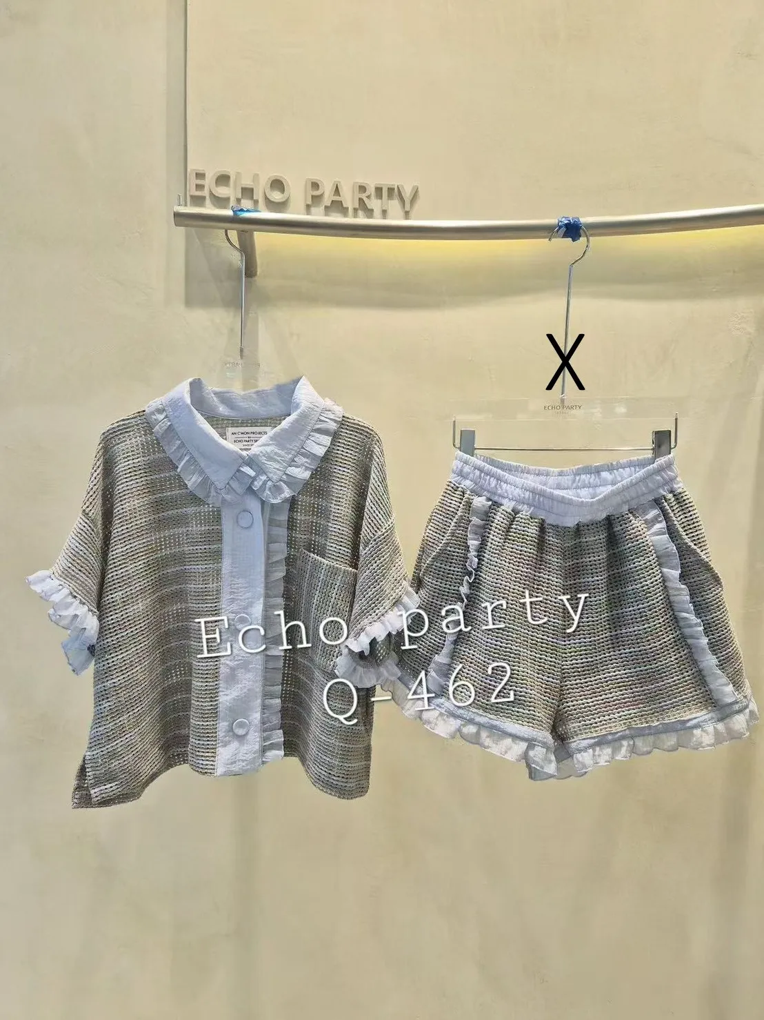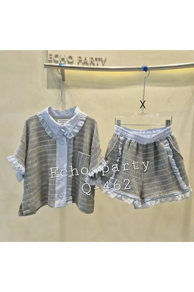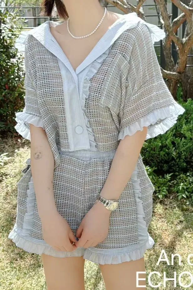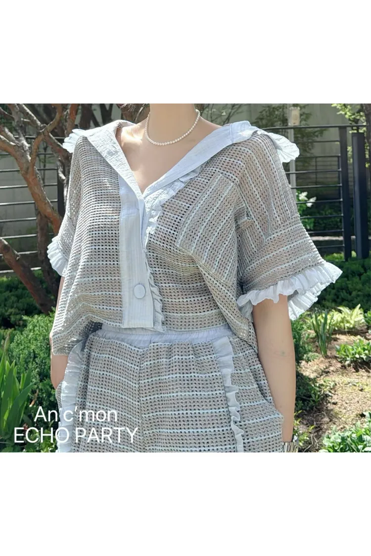 棉+雪紡+聚酯 材質很舒服 細洞簍空 領口荷葉 排釦穿脫