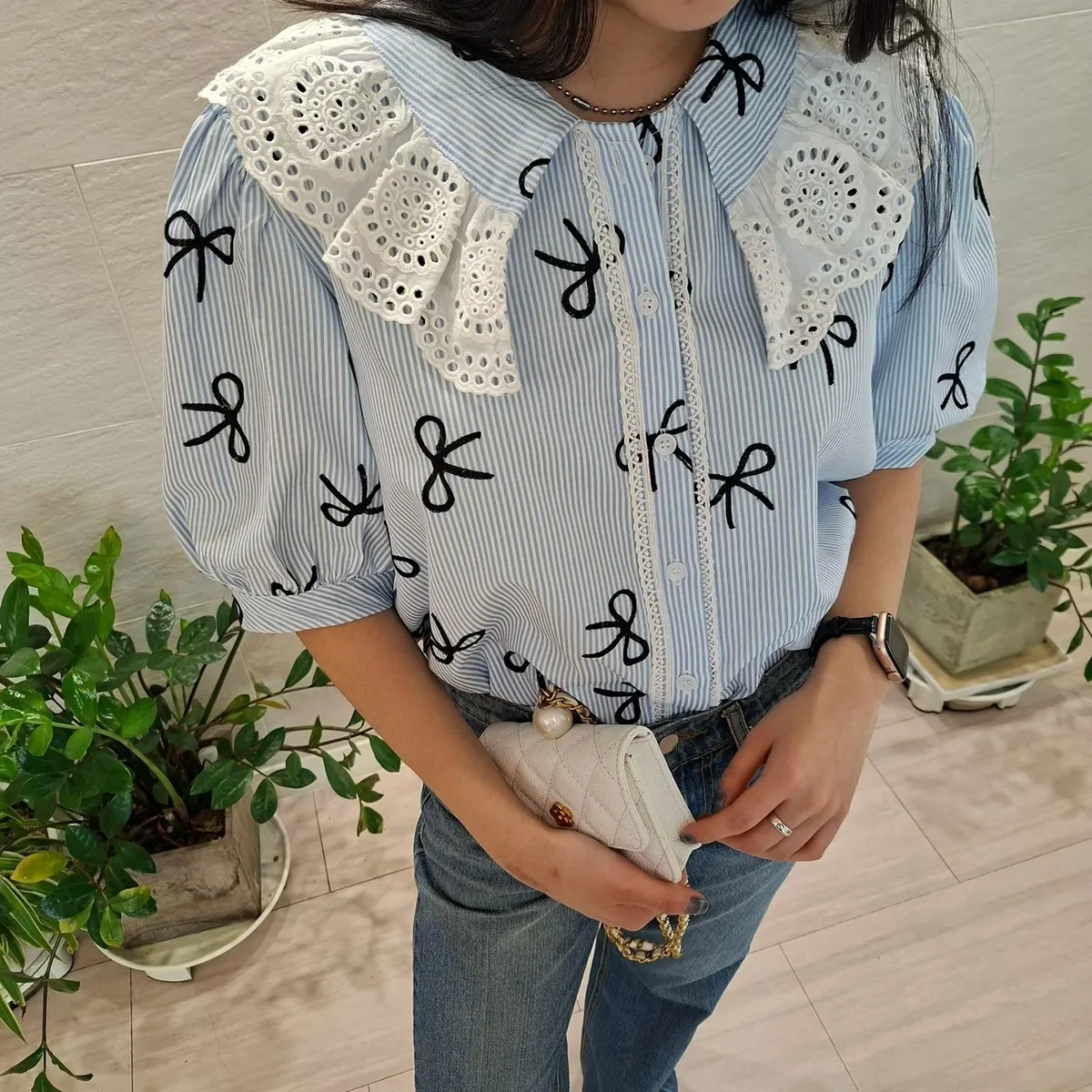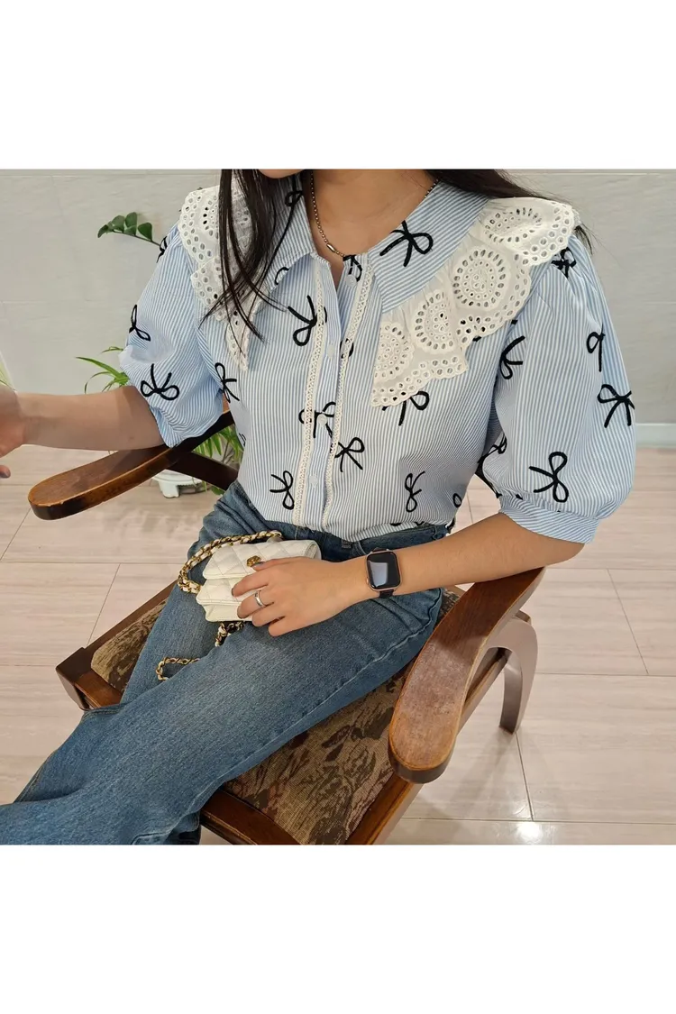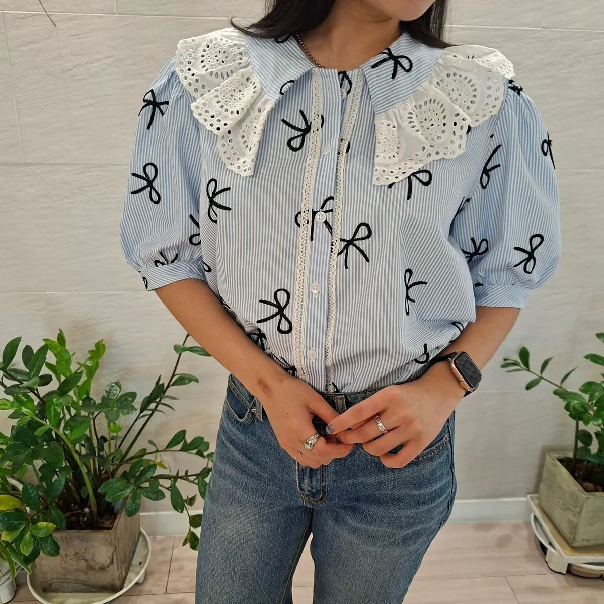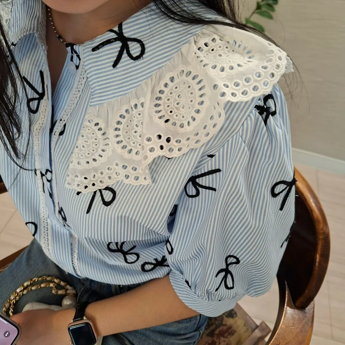 棉+縲縈 推薦款 蝴蝶結 燒花蕾絲翻領 排釦穿脫 L號友善