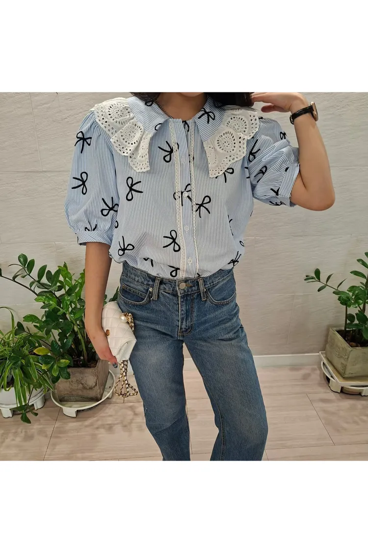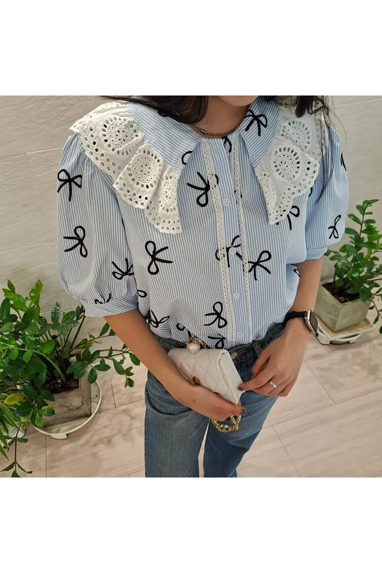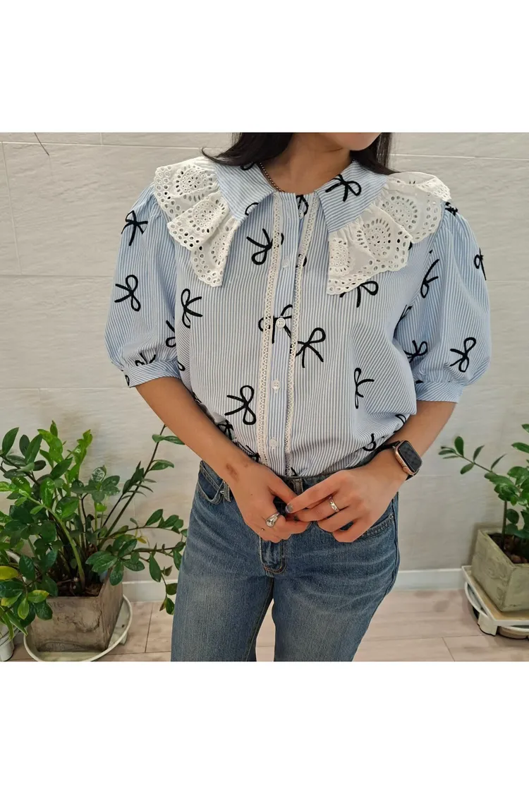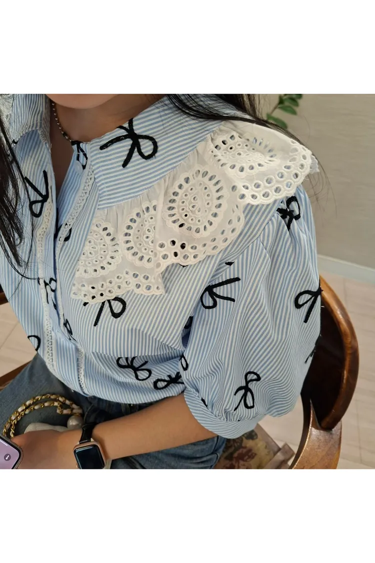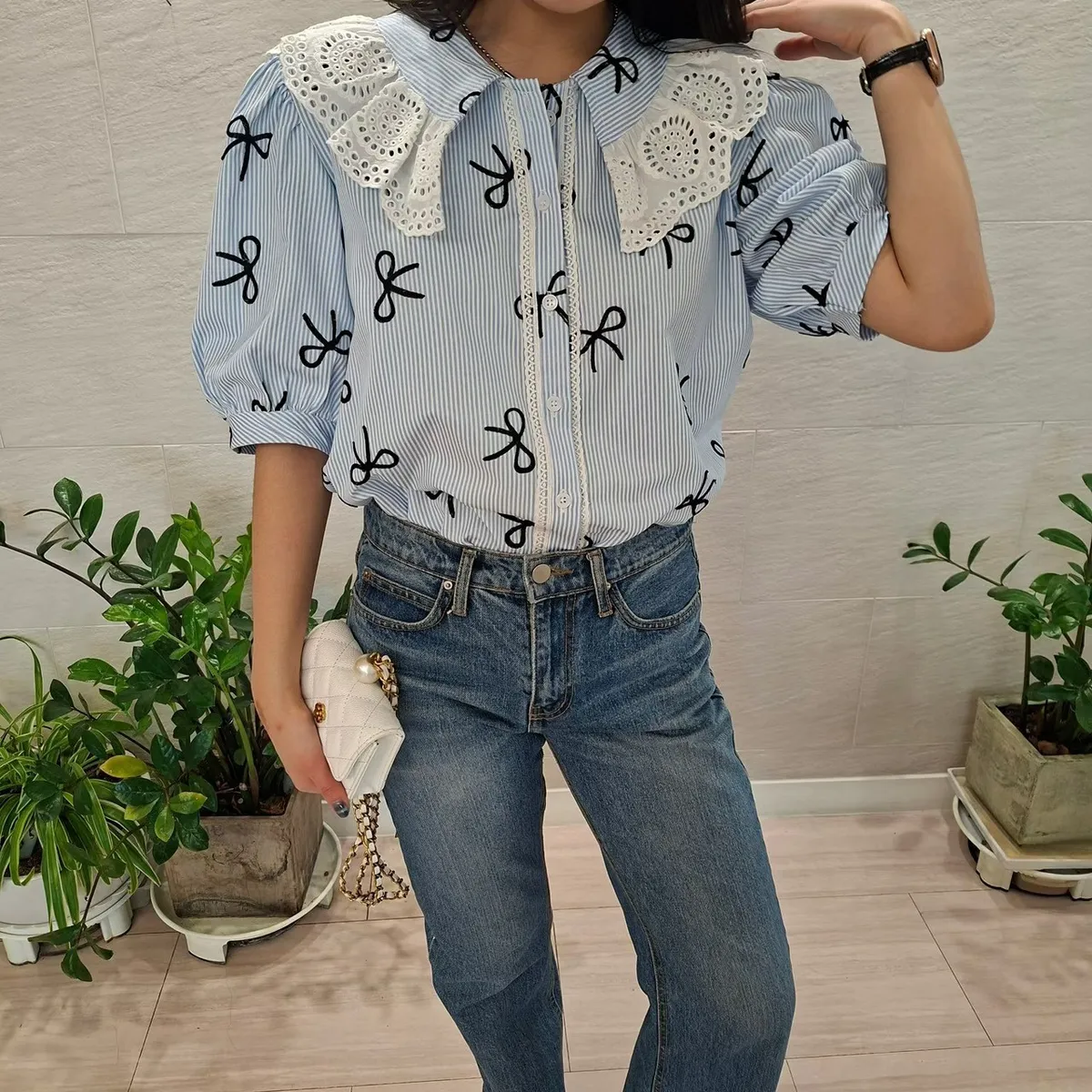 棉+縲縈 推薦款 蝴蝶結 燒花蕾絲翻領 排釦穿脫 L號友善