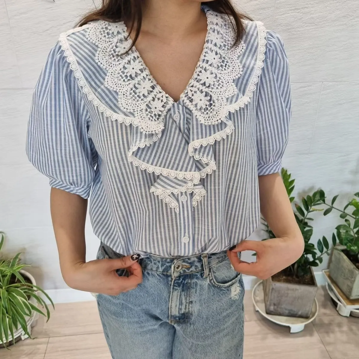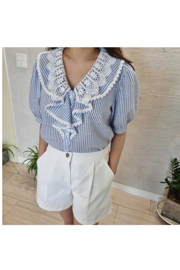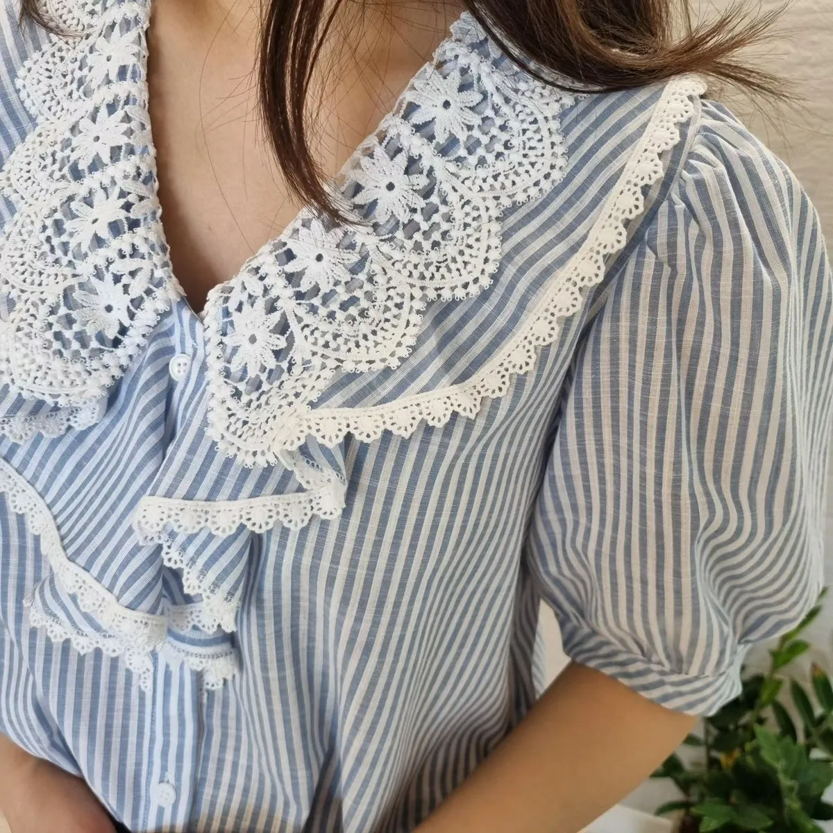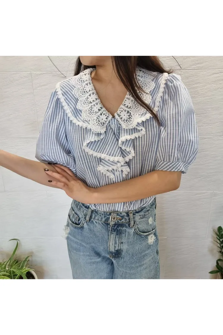棉+聚酯 透氣舒適 排釦穿脫 胸前寬荷葉波浪 清爽直條紋
