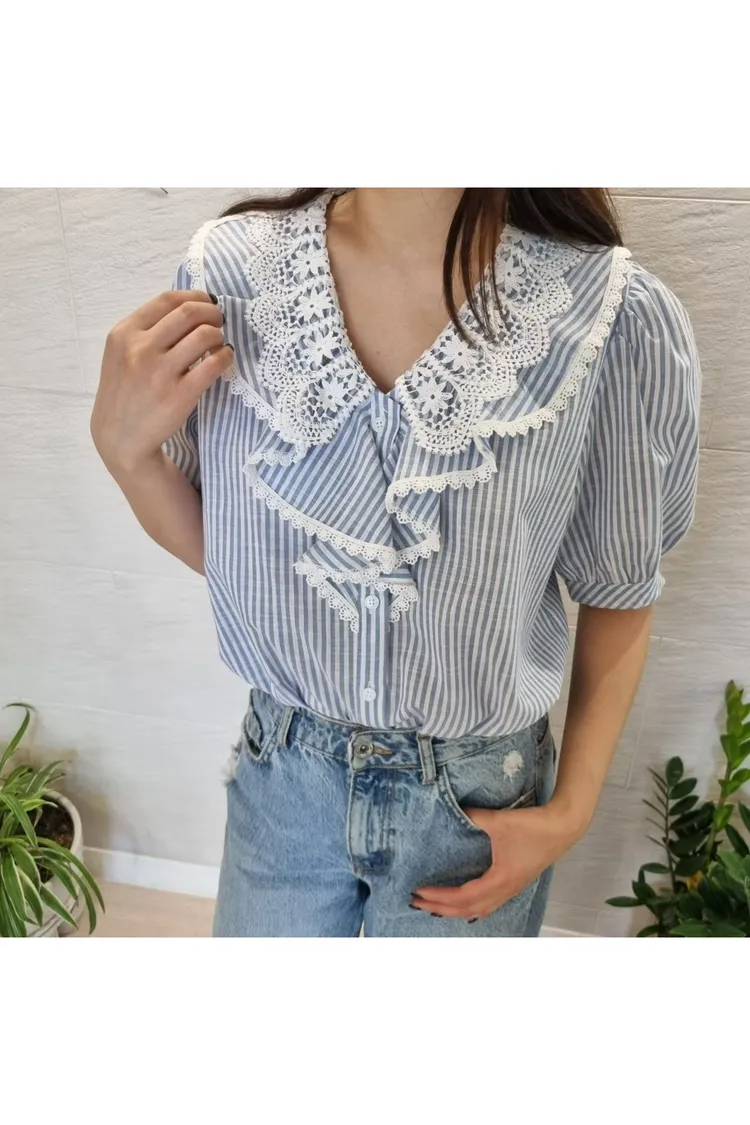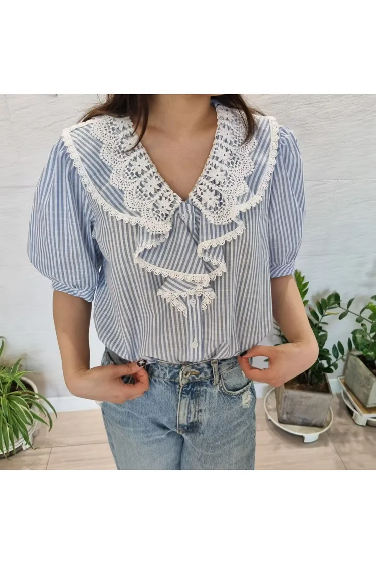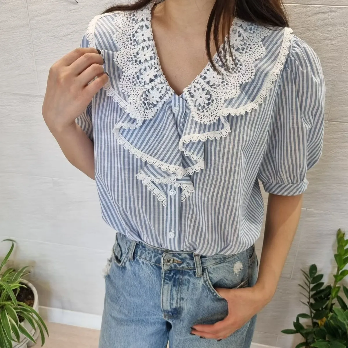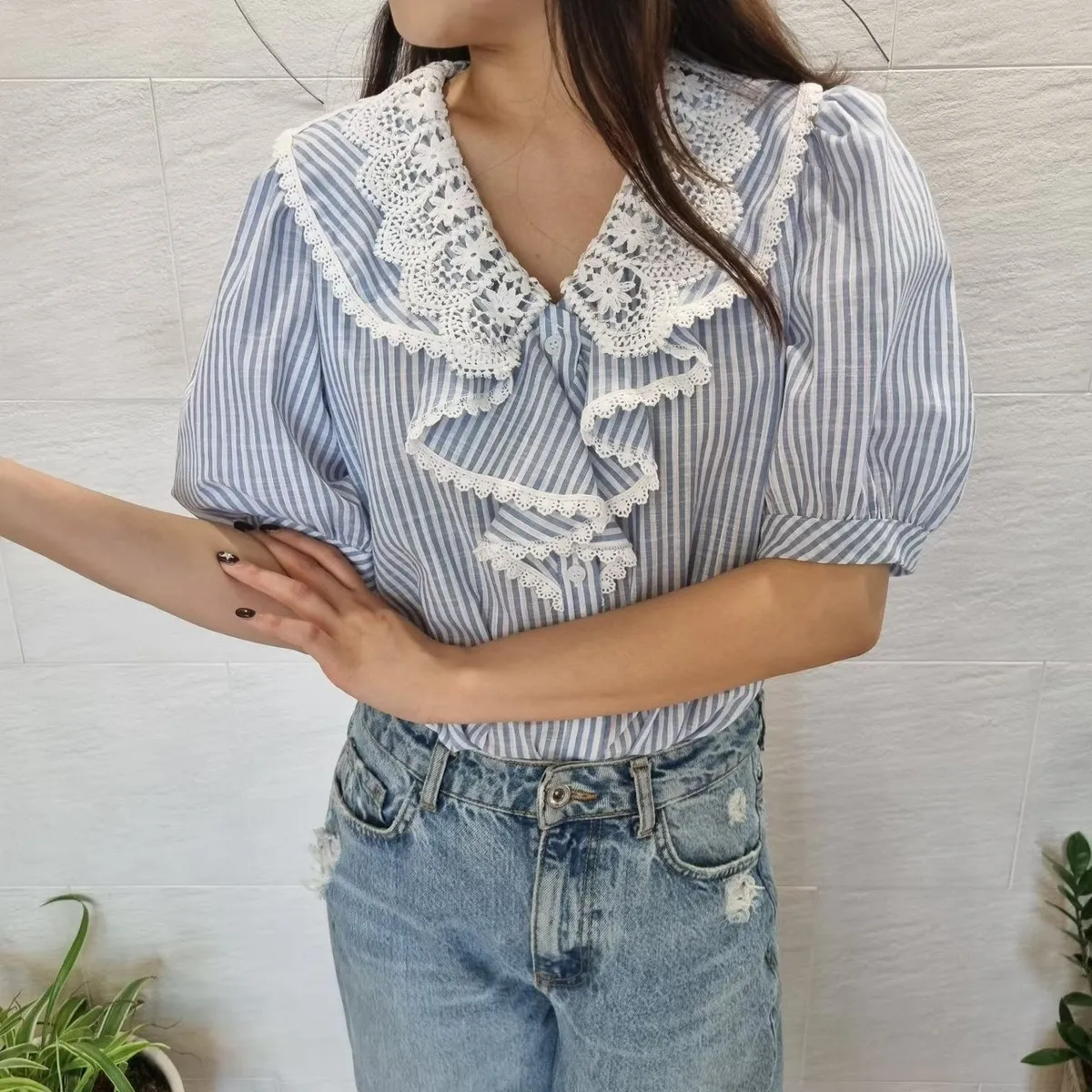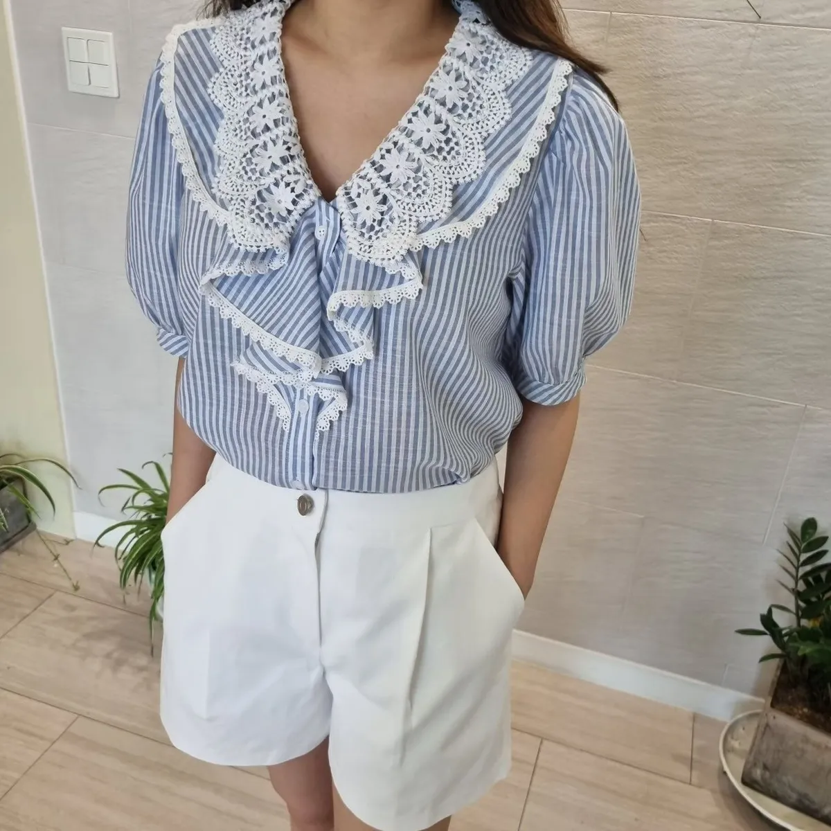 棉+聚酯 透氣舒適 排釦穿脫 胸前寬荷葉波浪 清爽直條紋