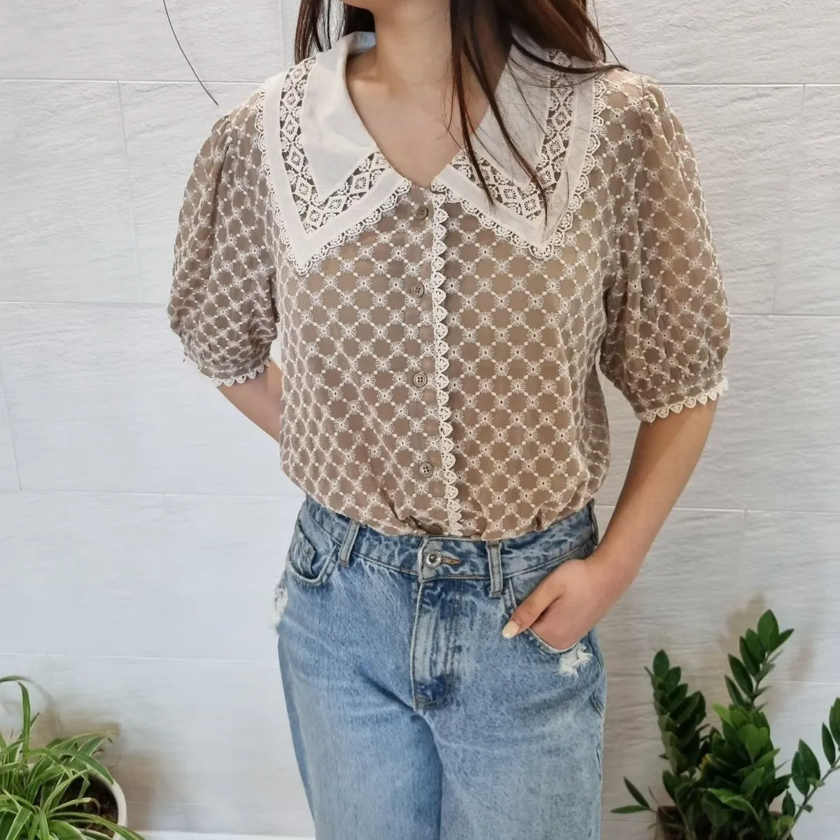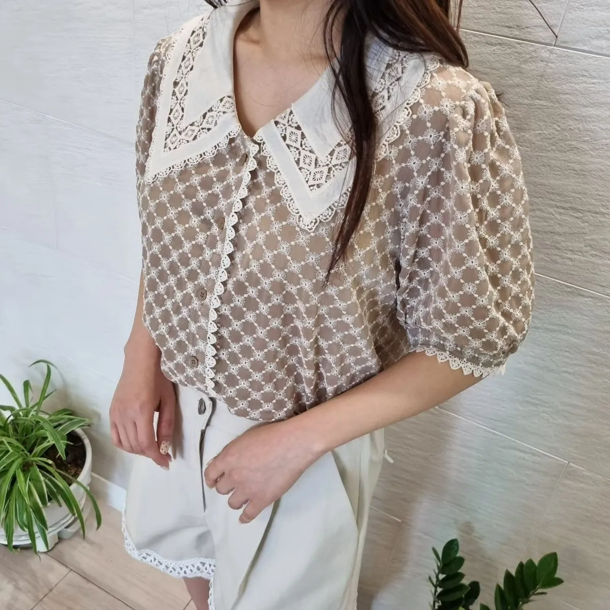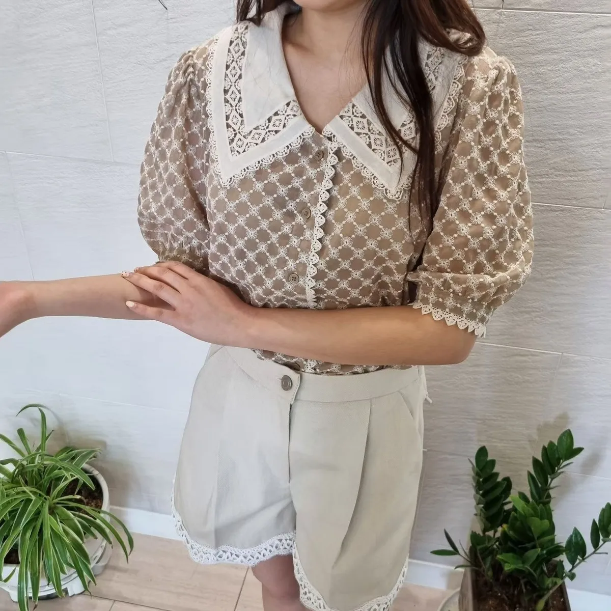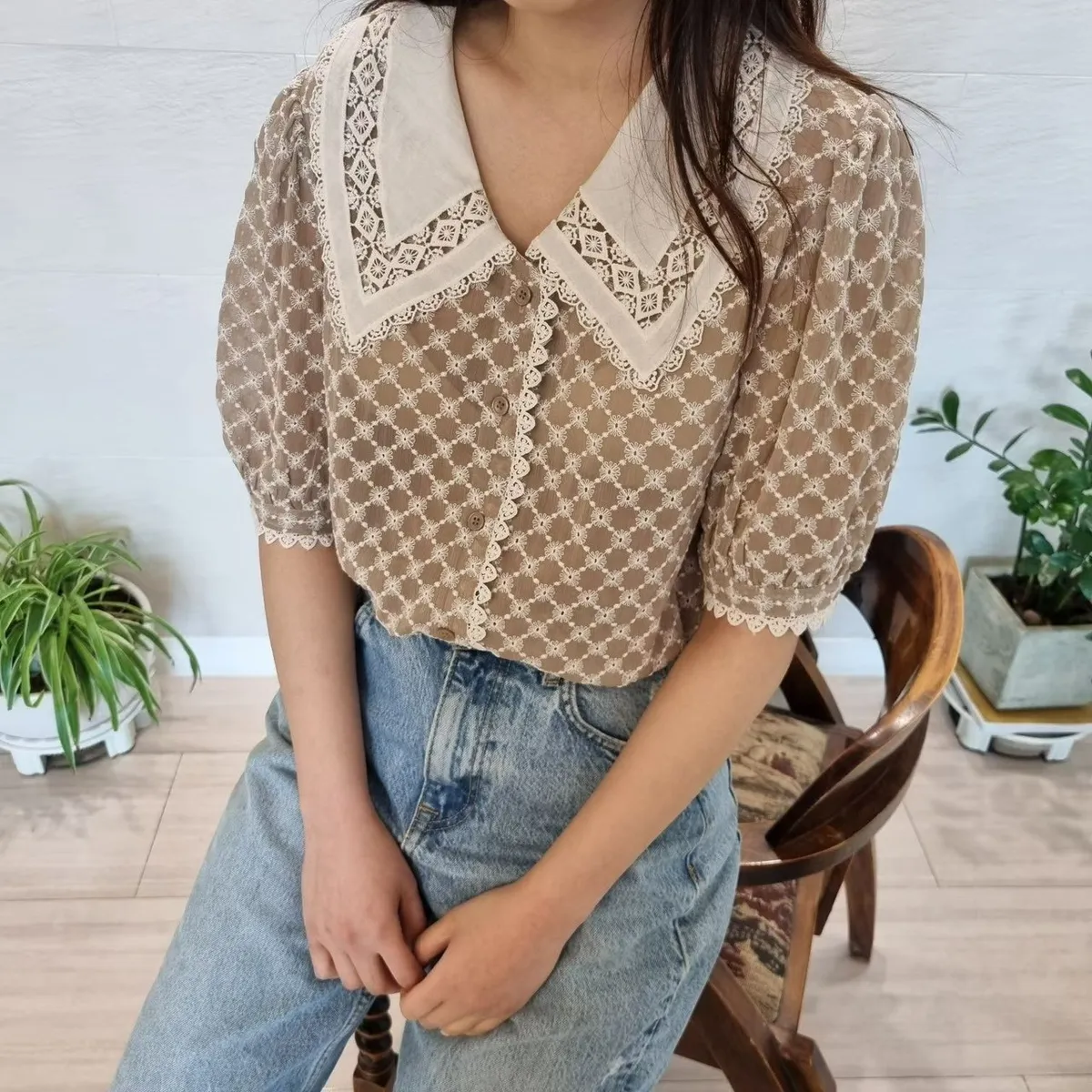 雪紡 薄款面料 蕾絲大翻領 精緻刺繡 排釦蕾絲滾邊 建議室內穿