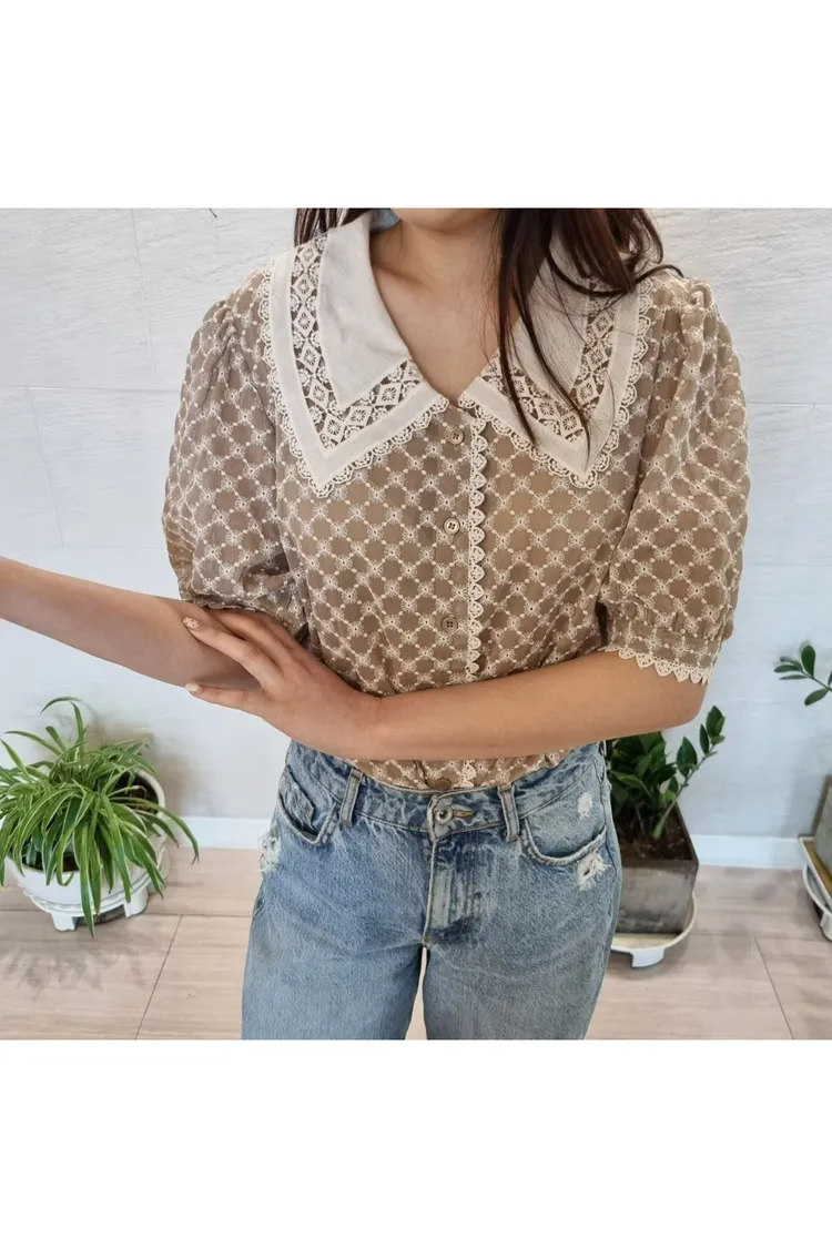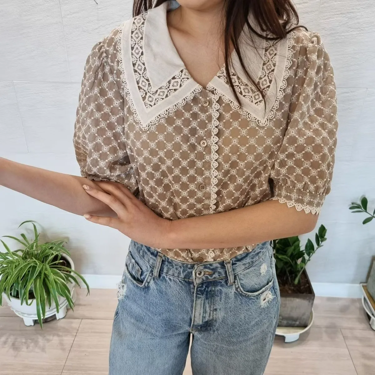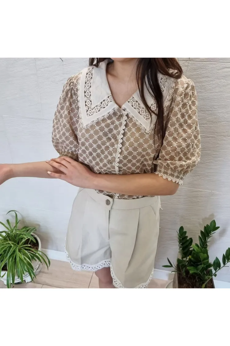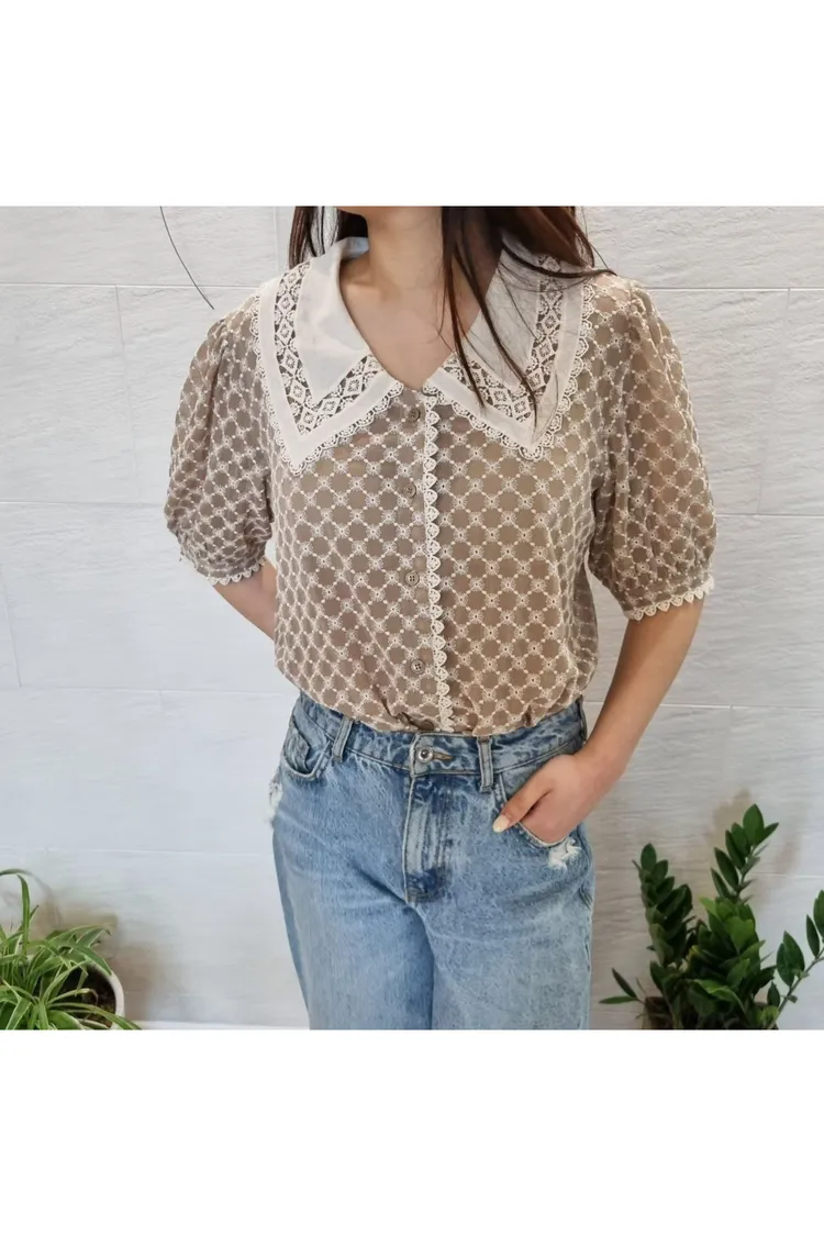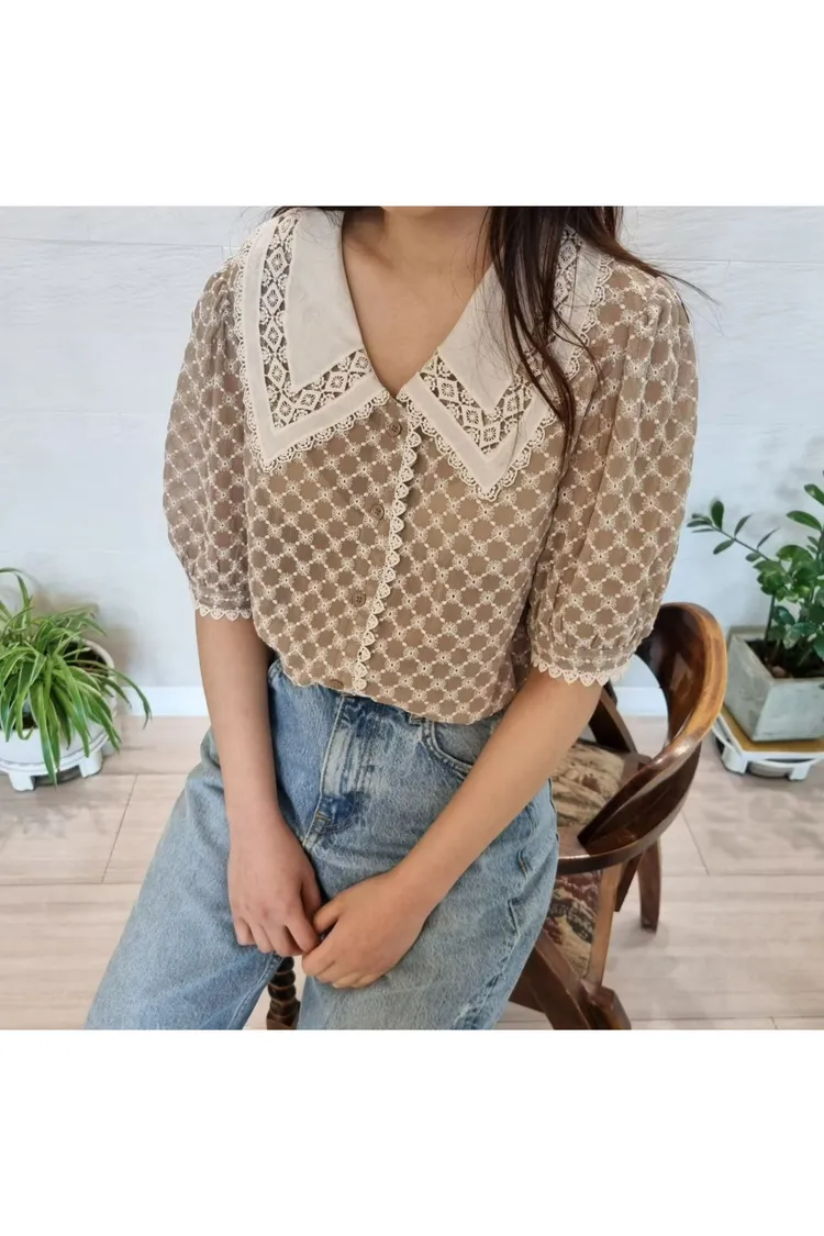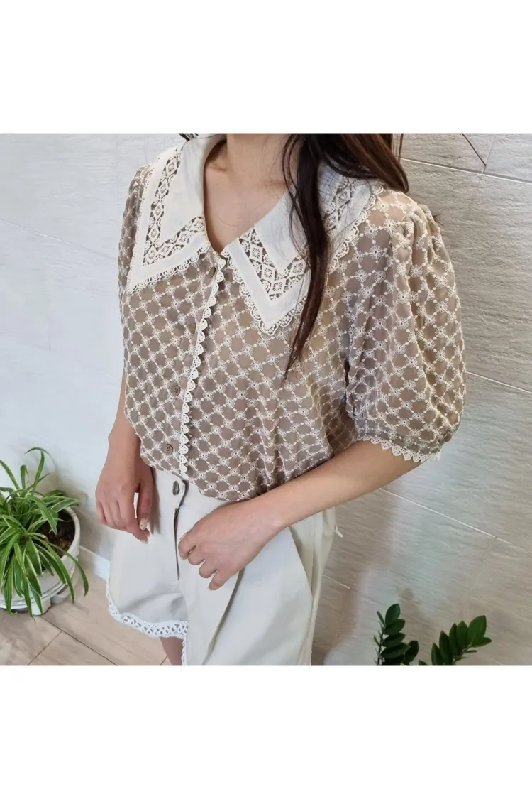 雪紡 薄款面料 蕾絲大翻領 精緻刺繡 排釦蕾絲滾邊 建議室內穿