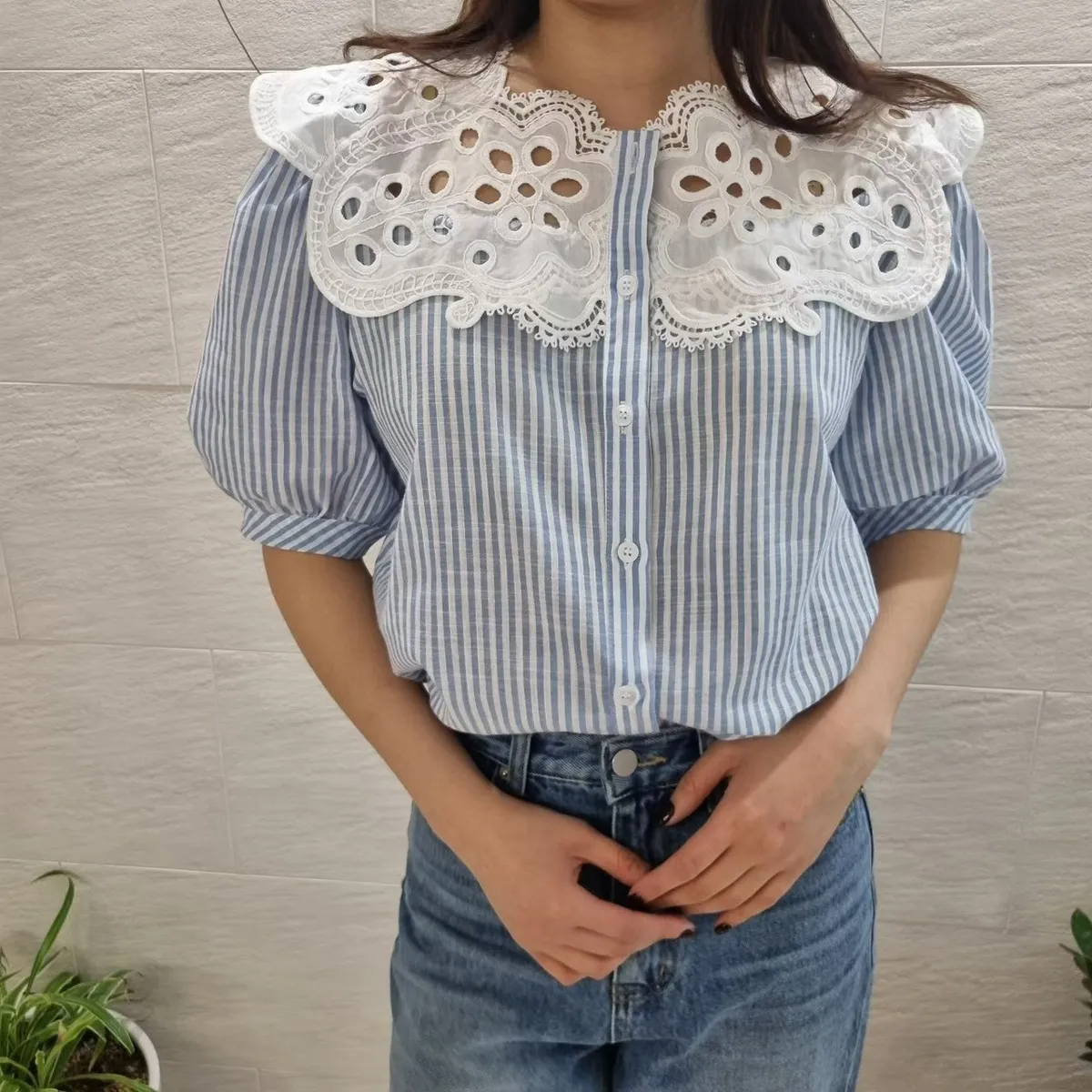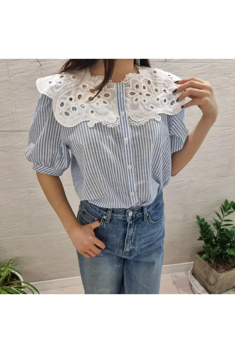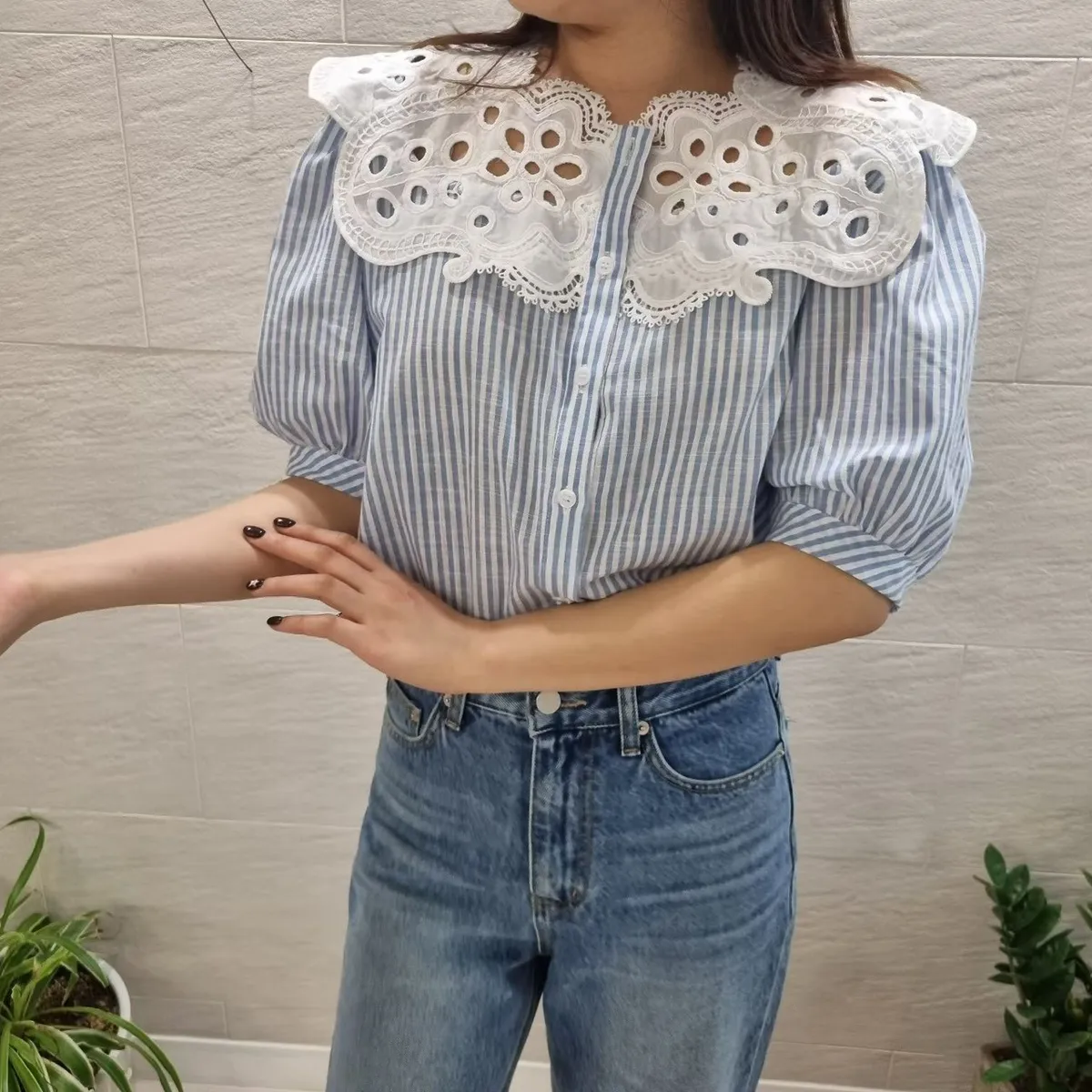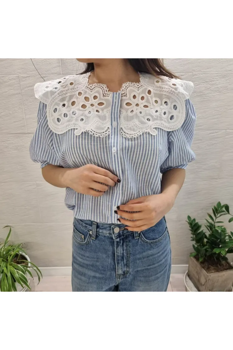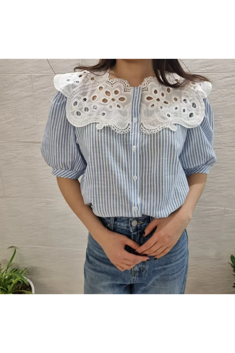棉 蝴蝶翅膀蕾絲 排釦穿脫 天藍直條紋 透氣舒適