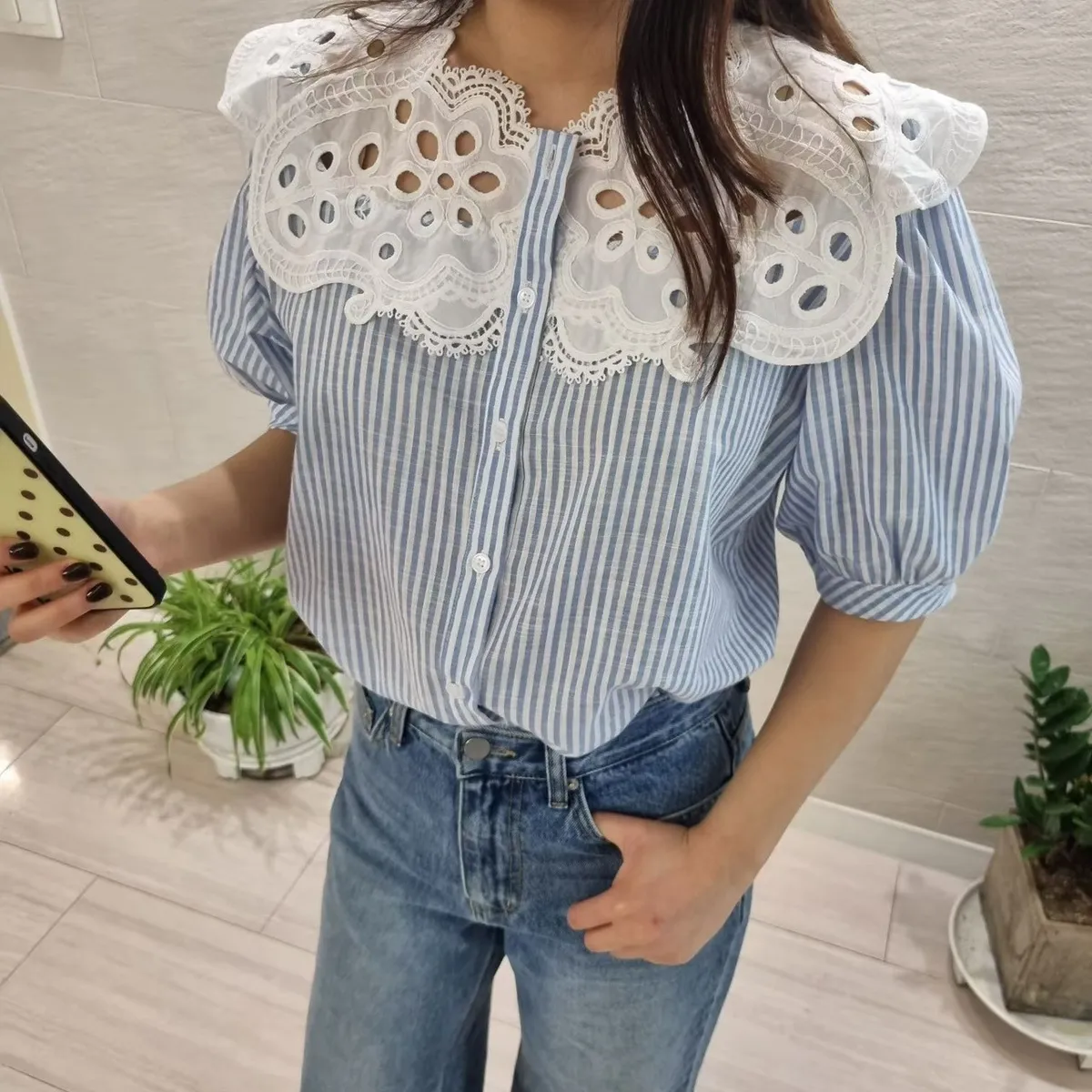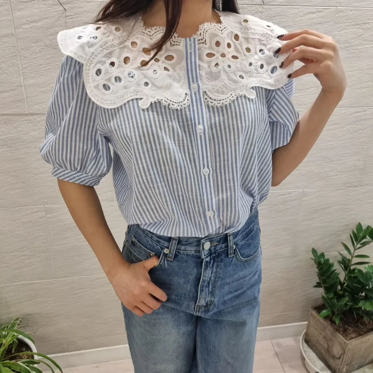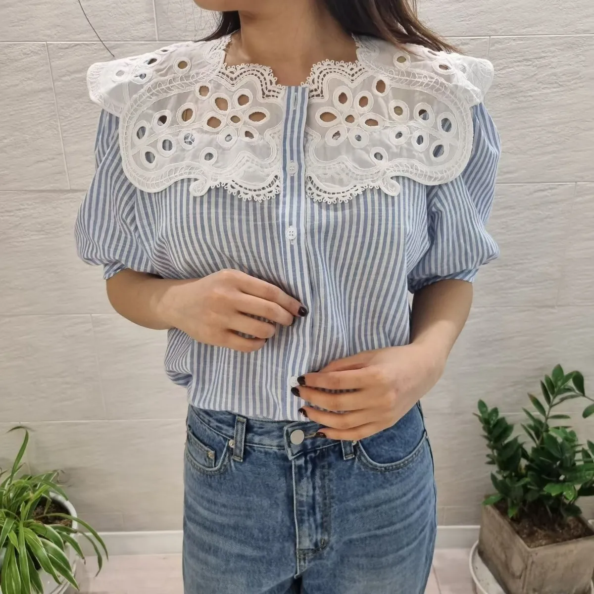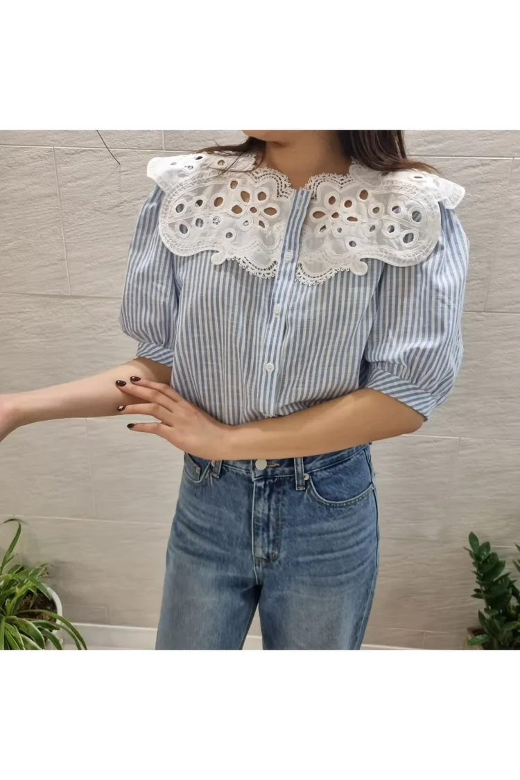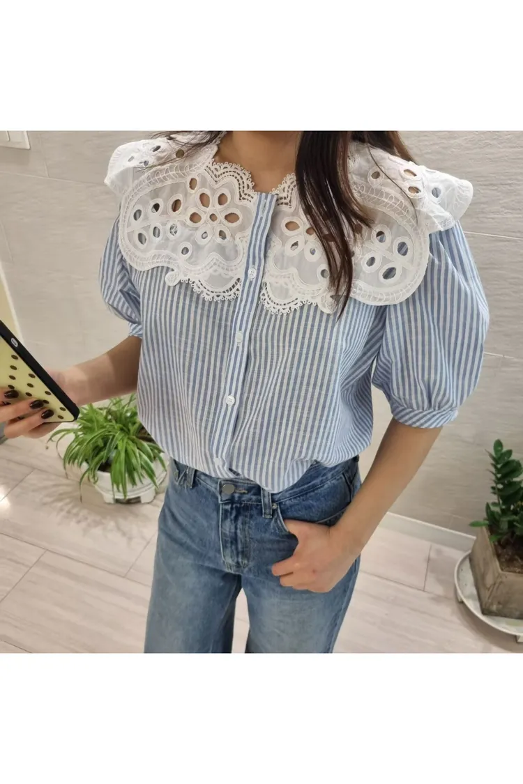 棉 蝴蝶翅膀蕾絲 排釦穿脫 天藍直條紋 透氣舒適