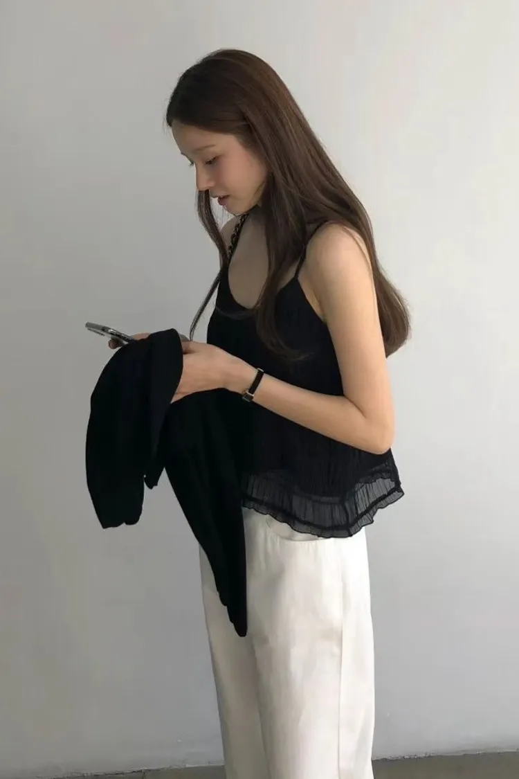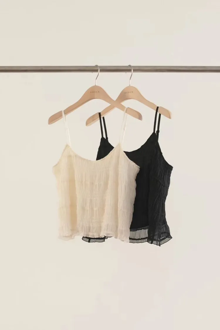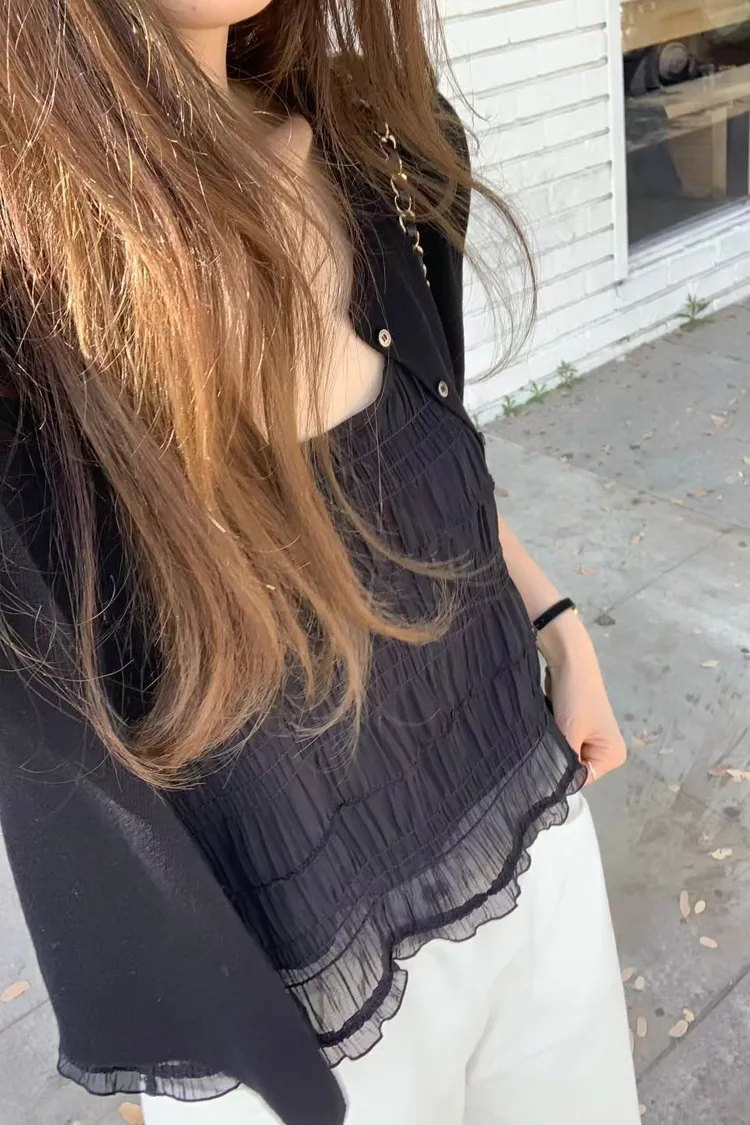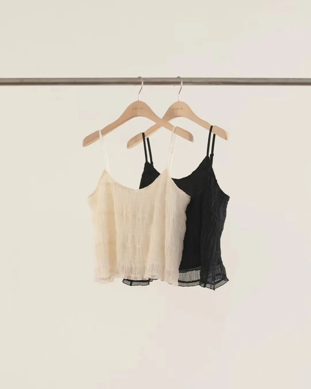 聚酯 薄款微透 有彈性 肩帶可調 下擺荷葉 細皺紋裡 有內裡
