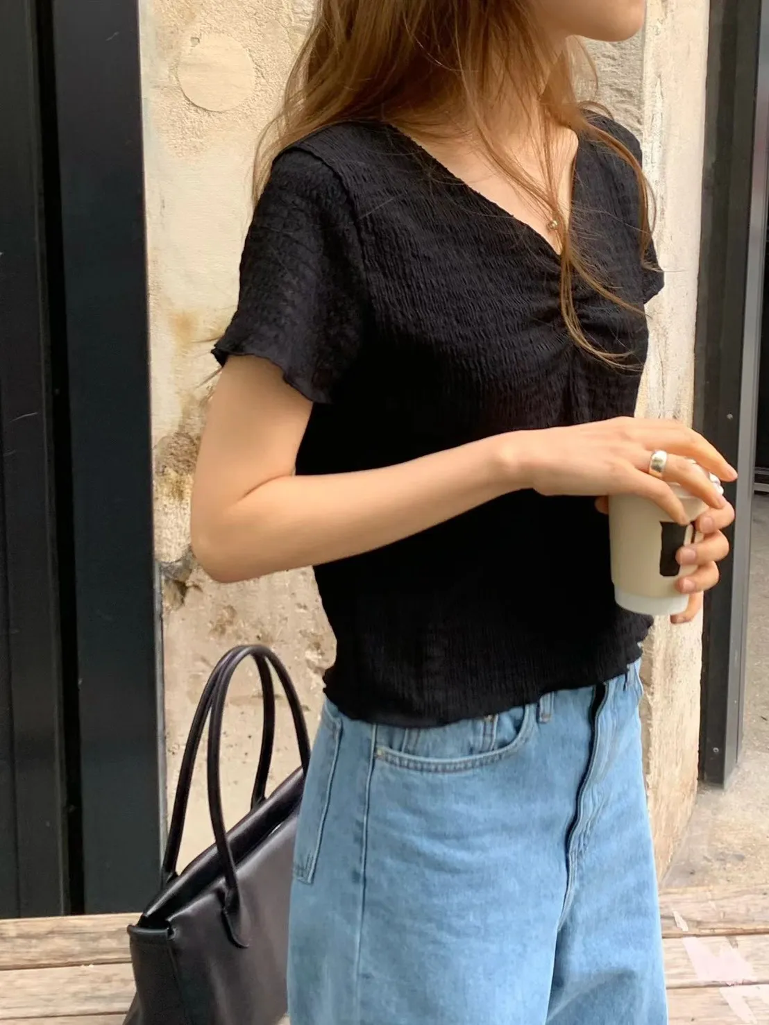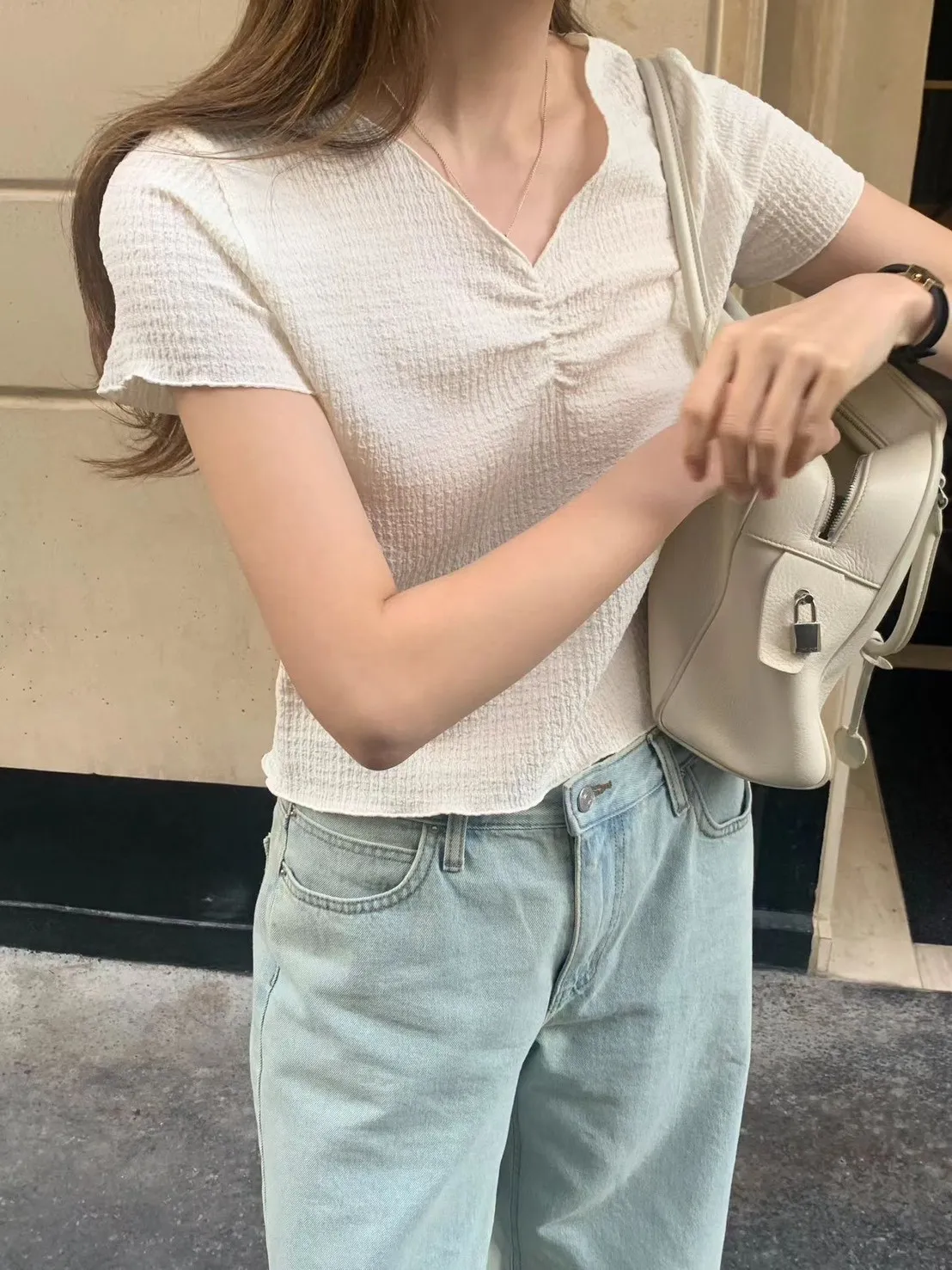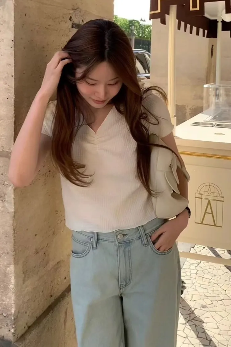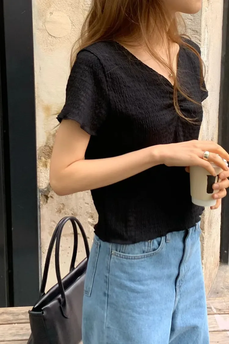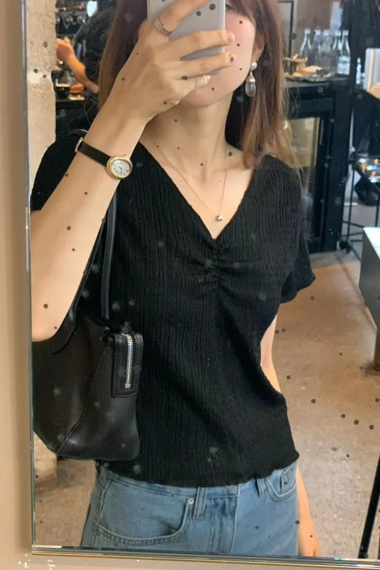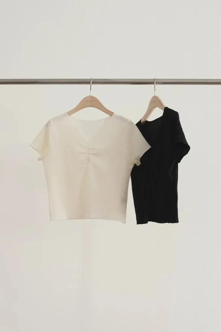 聚酯+彈力 V領設計 美胸抓皺 細皺紋裡 有彈性