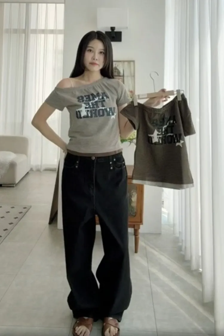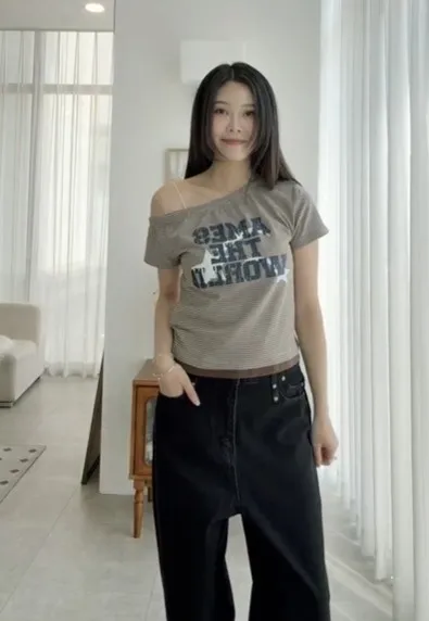 PK520推薦款潮牌Ames斜露單肩條紋T 淺咖 深咖 官網價$829 線上價$799