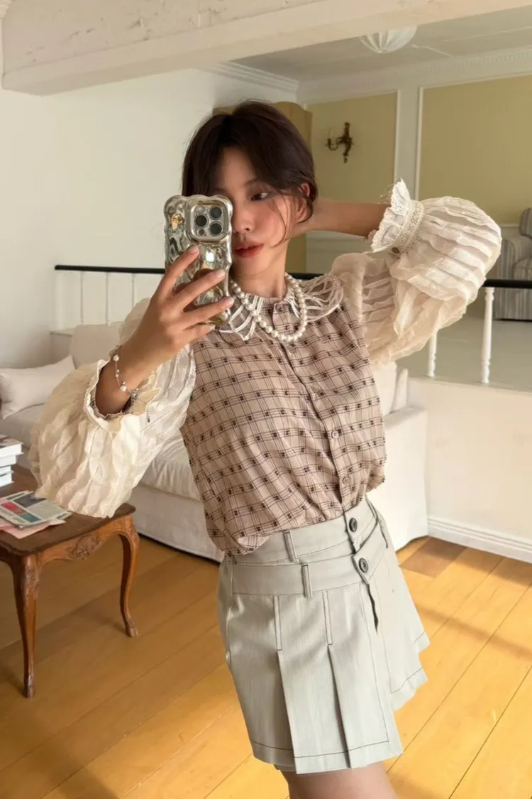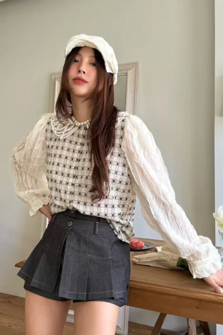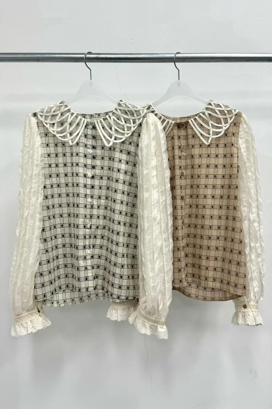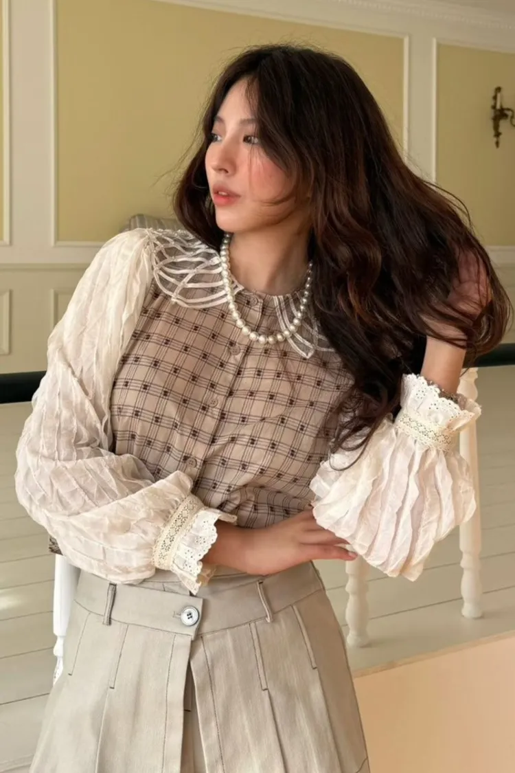 棉+雪紡紗 手袖蕾絲 雪紡紗袖 蕾絲透光翻領 拼接