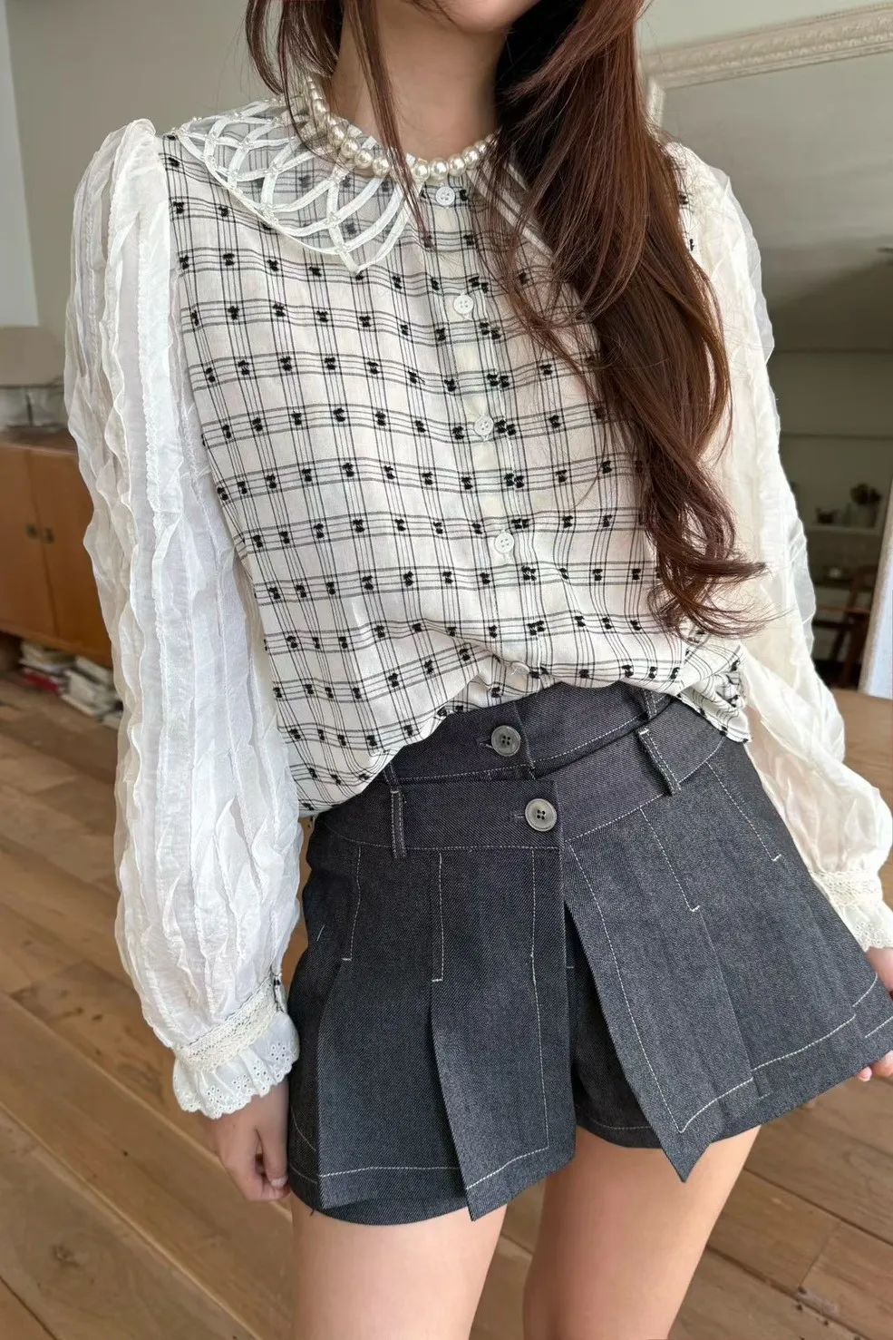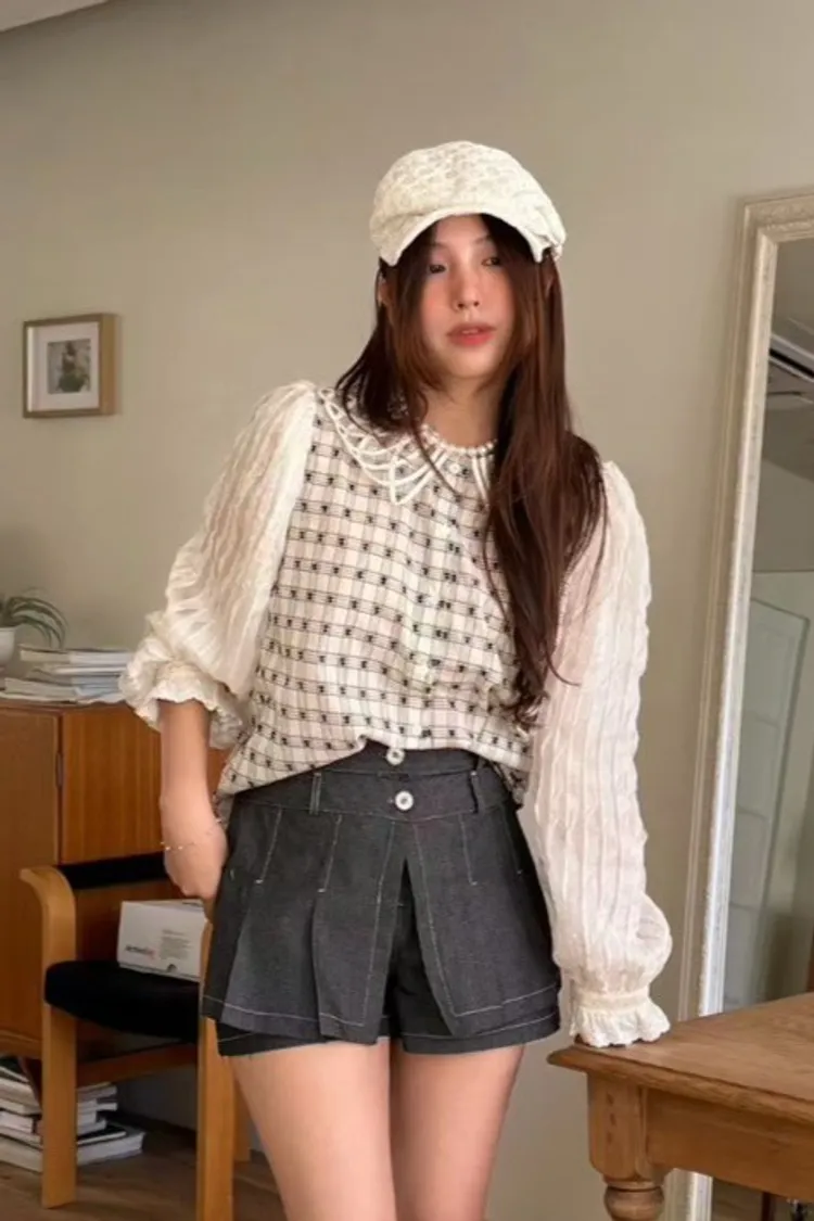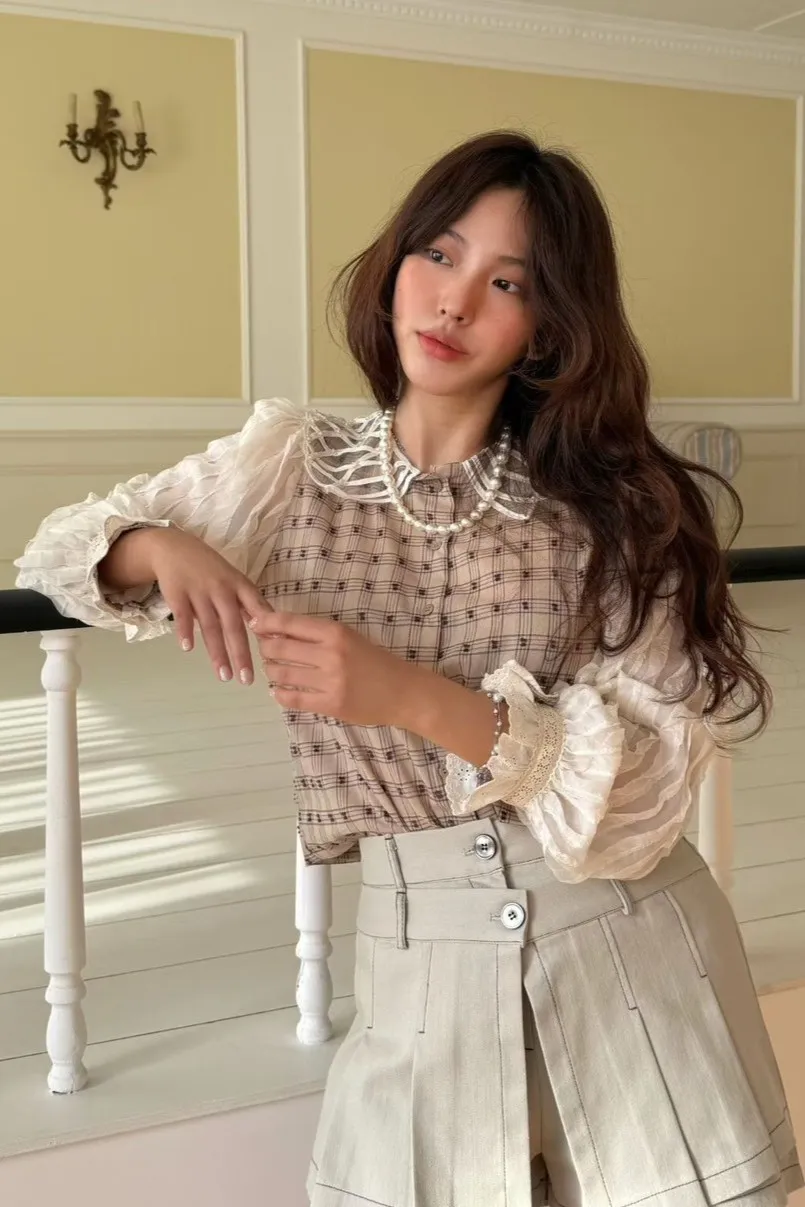 棉+雪紡紗 手袖蕾絲 雪紡紗袖 蕾絲透光翻領 拼接
