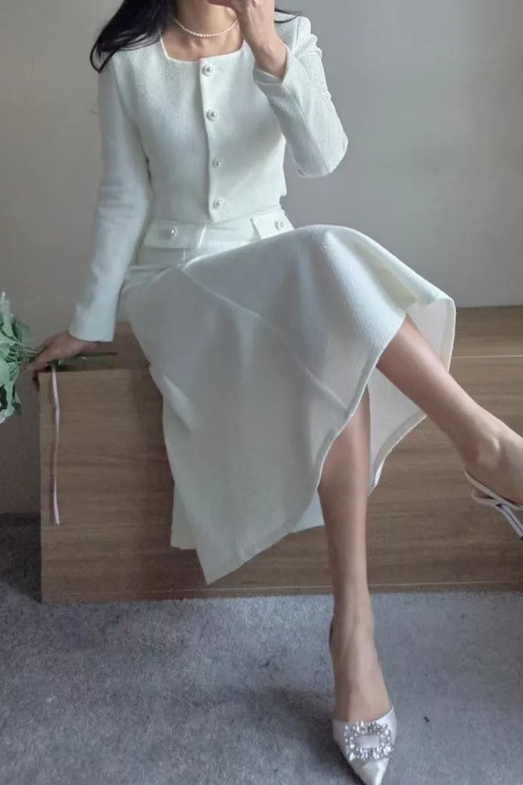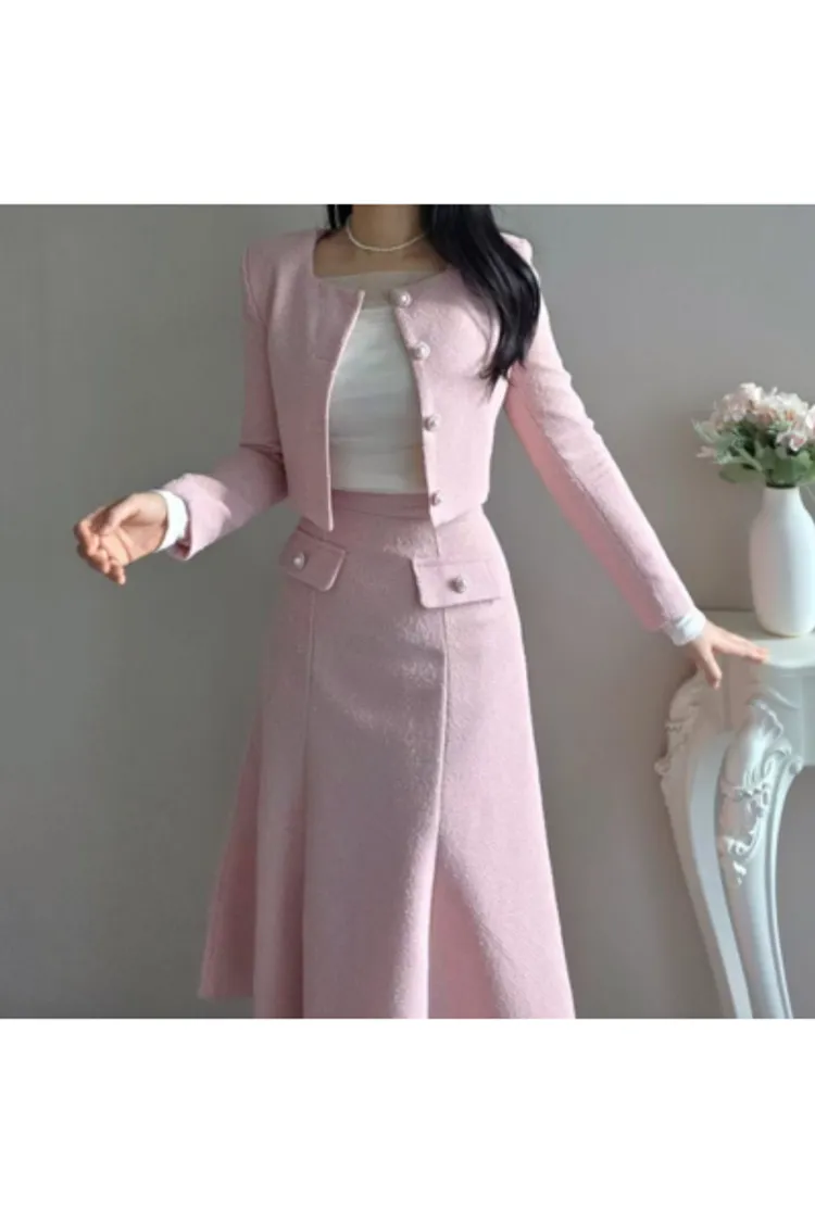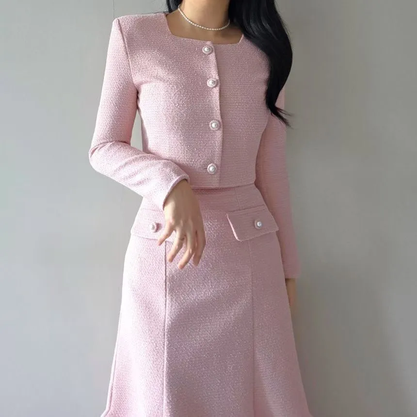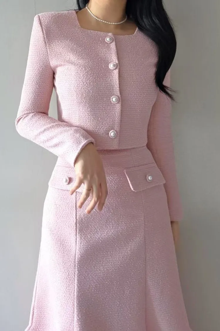 棉+聚酯 珍珠釦 小香風典雅面料 細閃銀絲線 短版好比例 珍珠釦