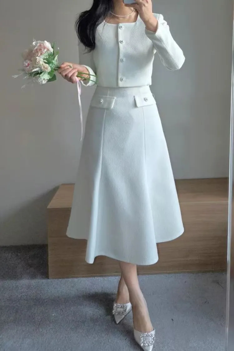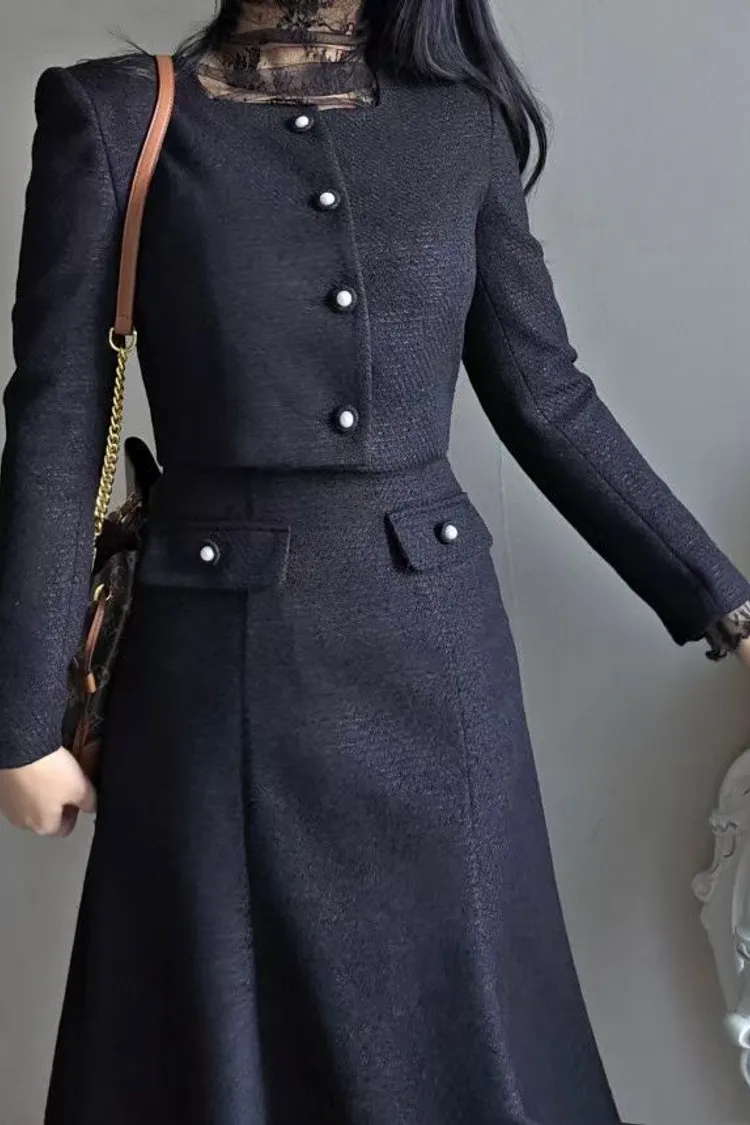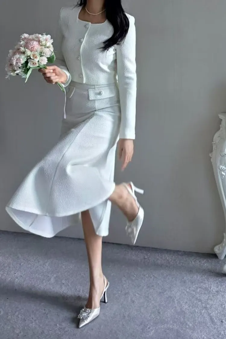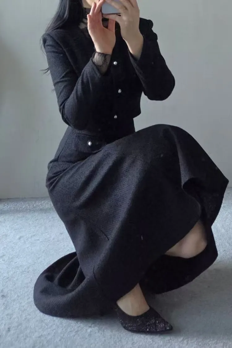 棉+聚酯 小香風典雅面料 細閃銀絲線 微高腰版 面料偏薄款 側拉鍊穿脫