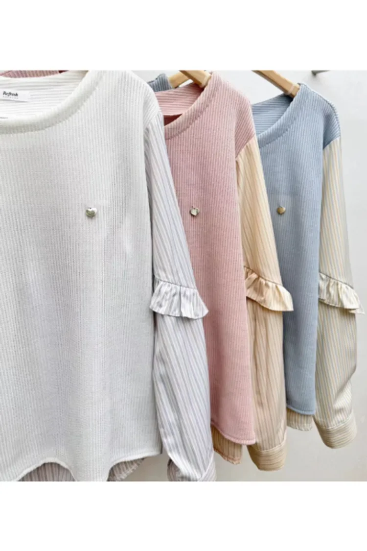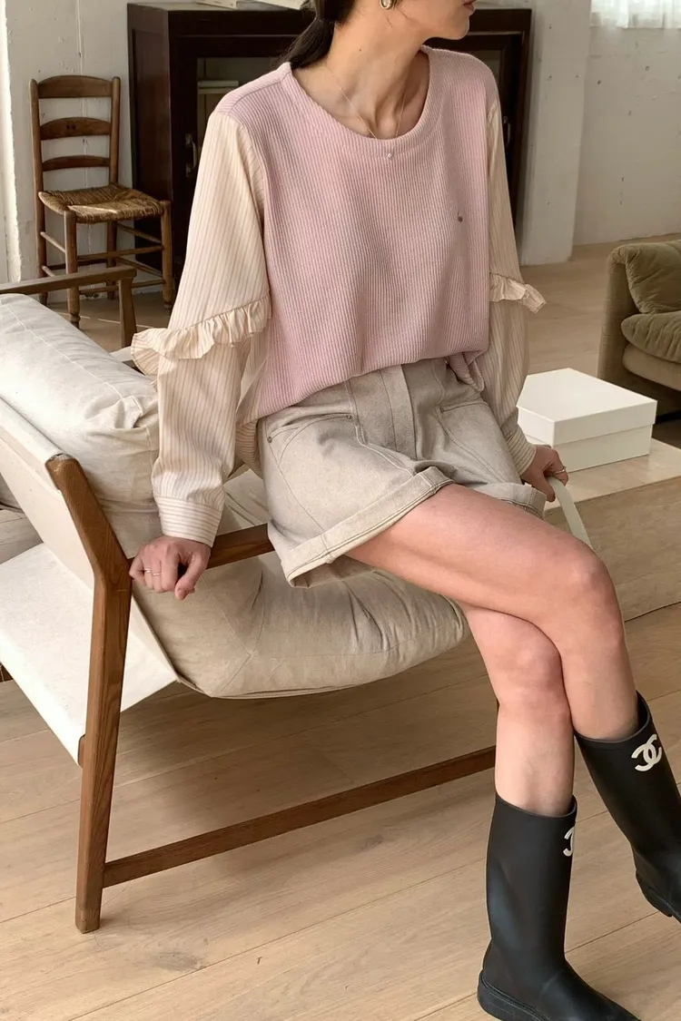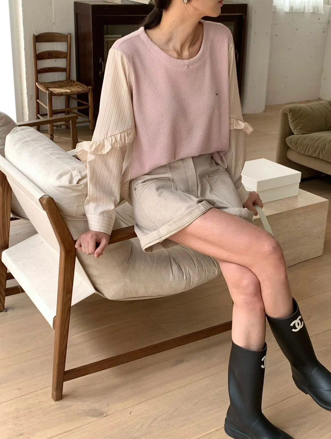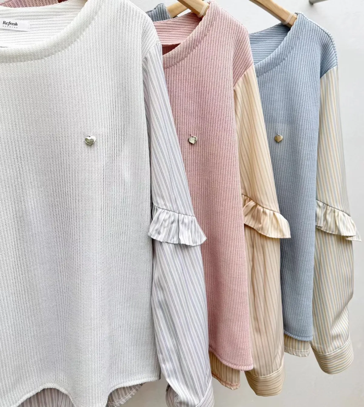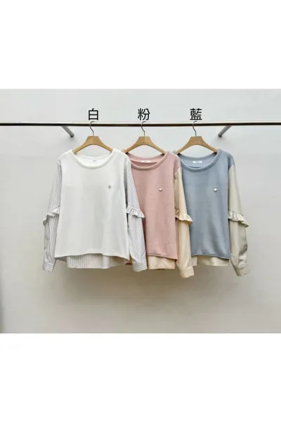 天絲+聚酯 親膚舒適 薄款坑條棉 細條紋理 荷葉手肘 小銀標