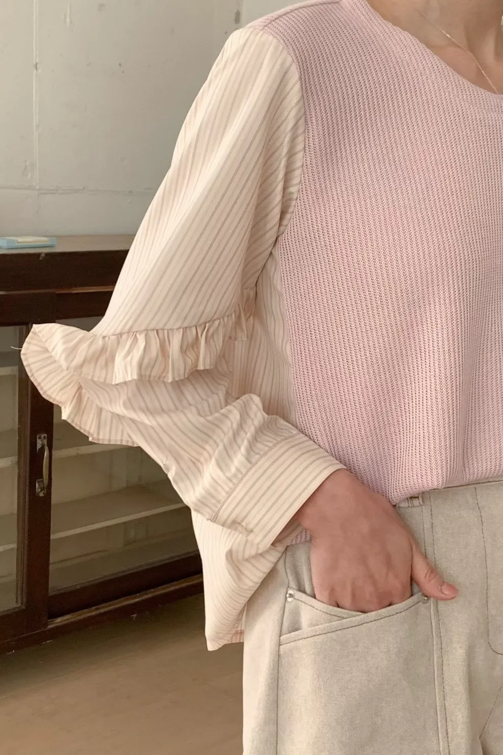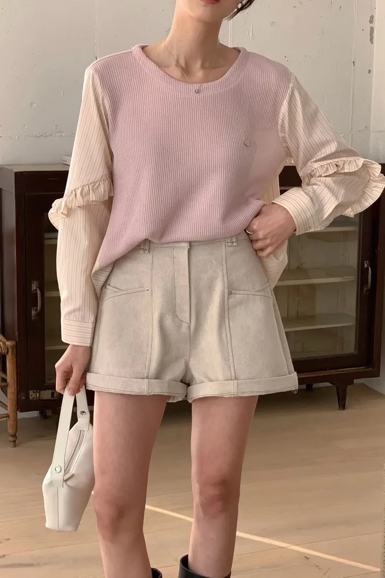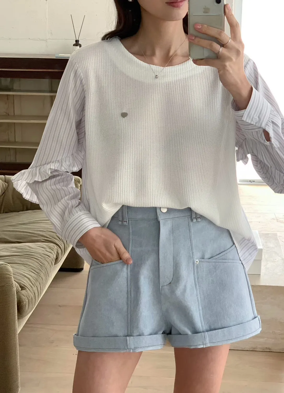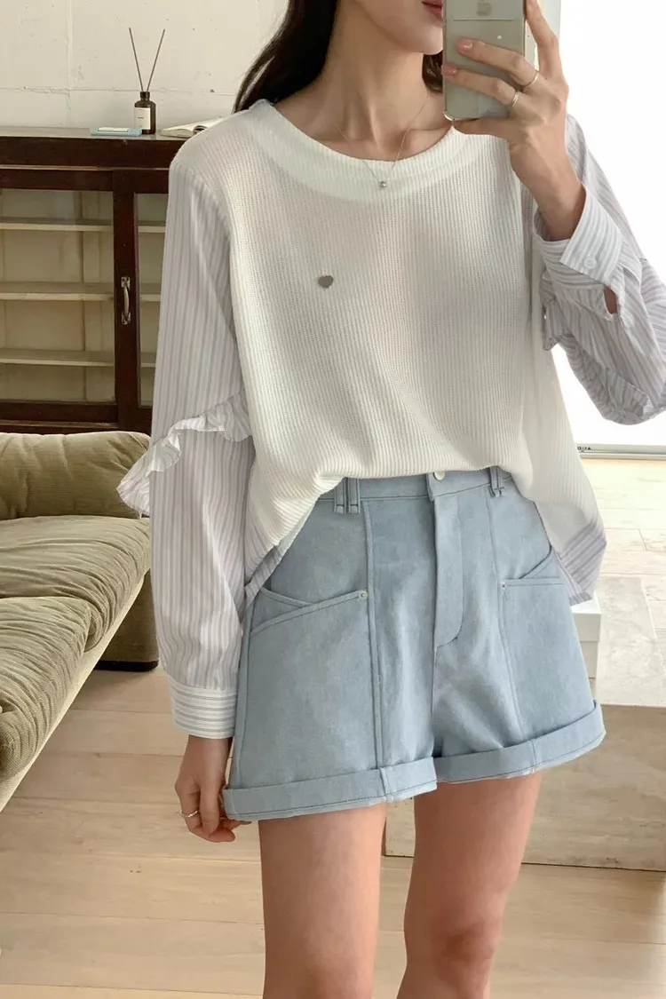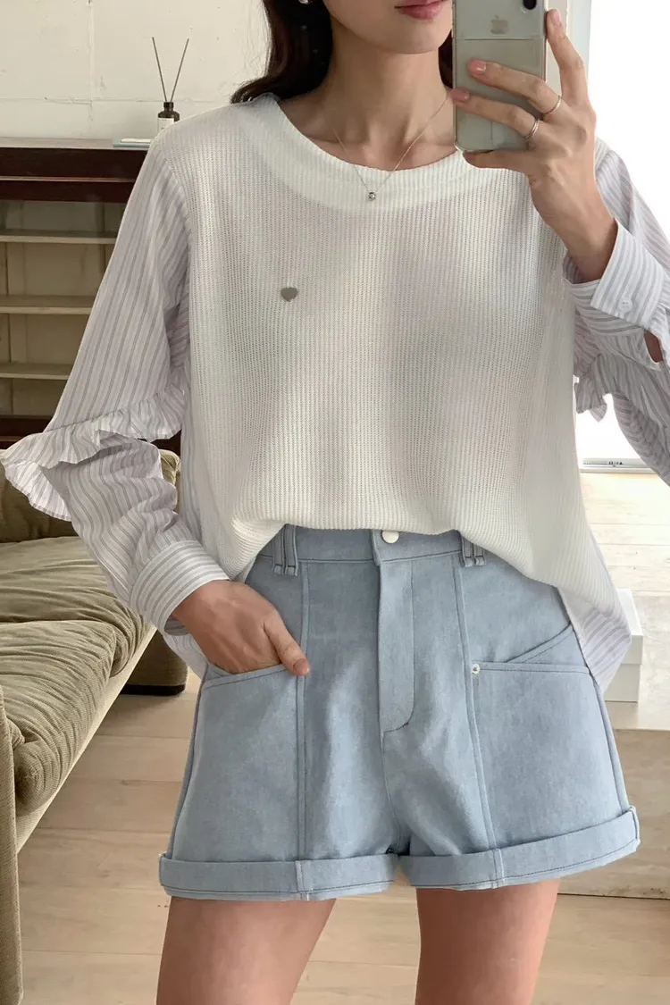 天絲+聚酯 親膚舒適 薄款坑條棉 細條紋理 荷葉手肘 小銀標