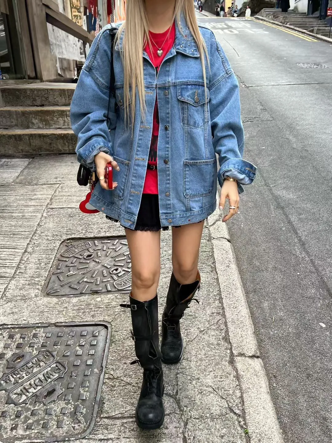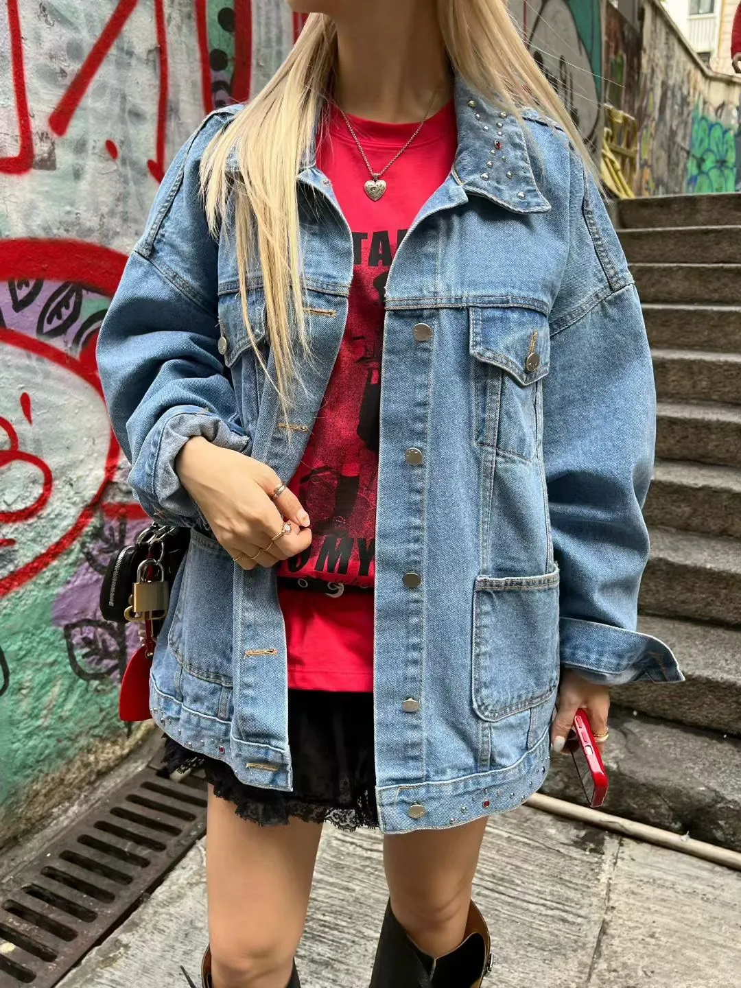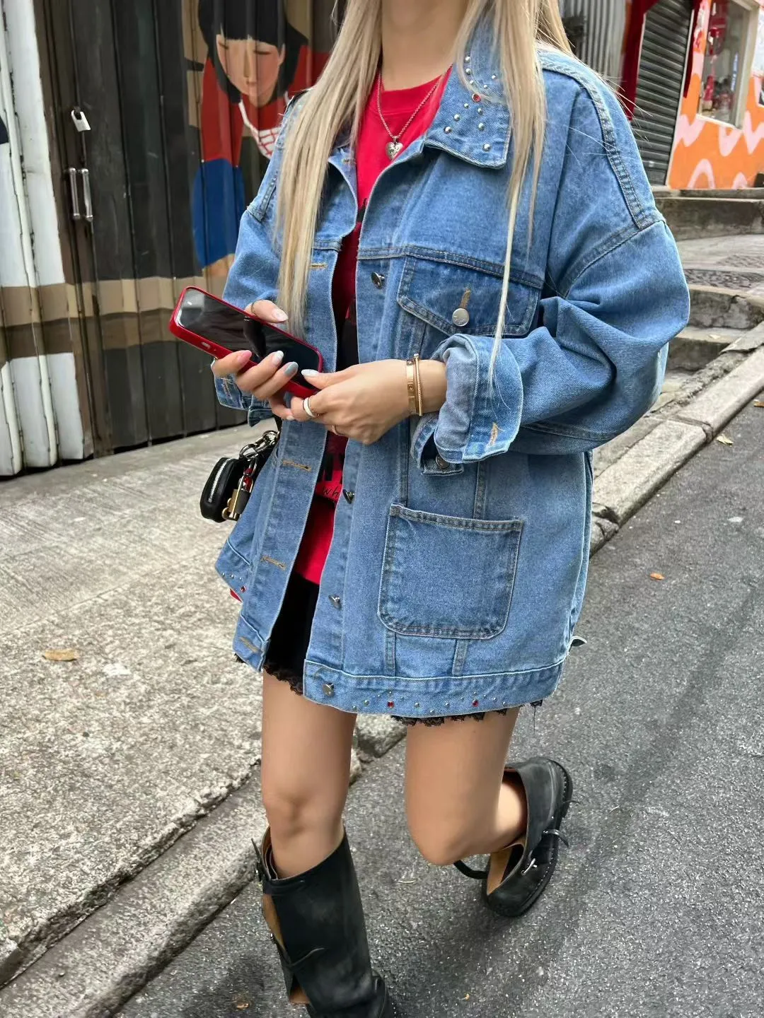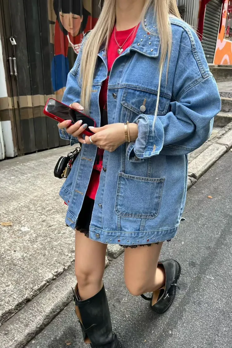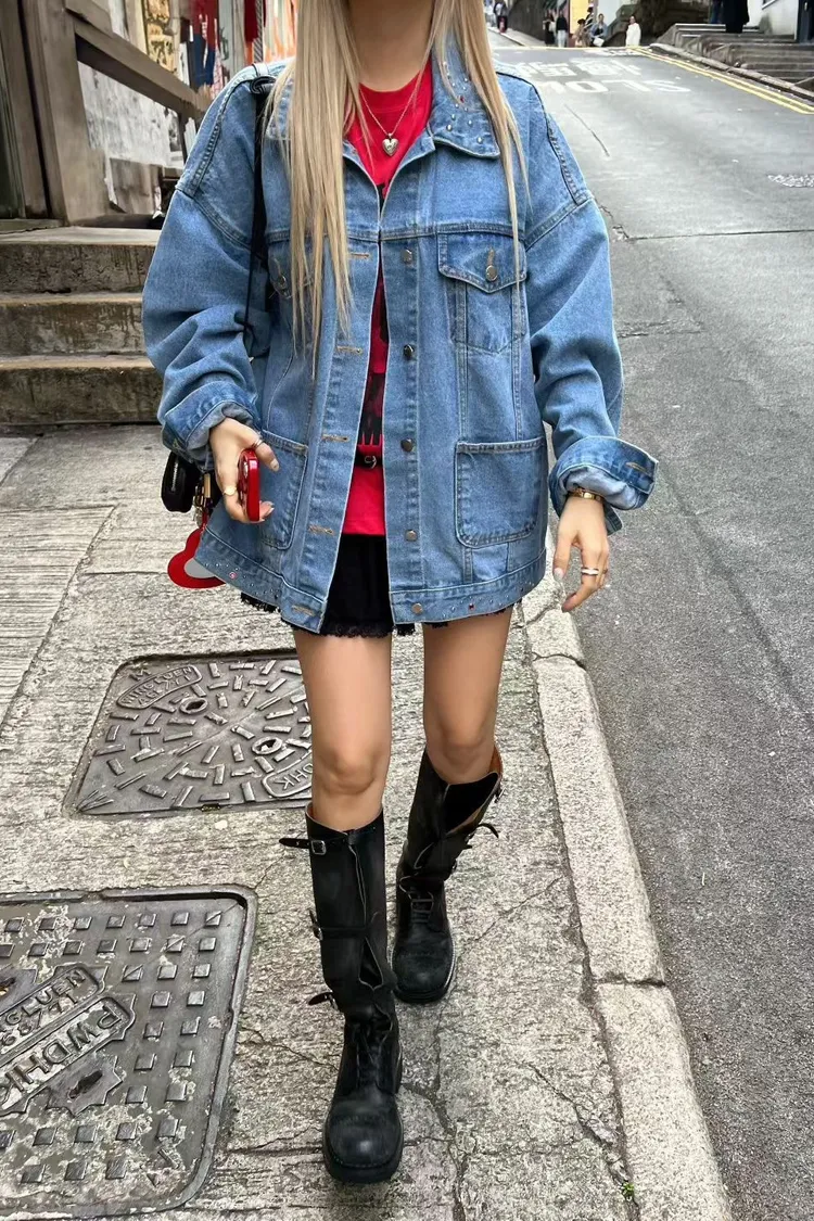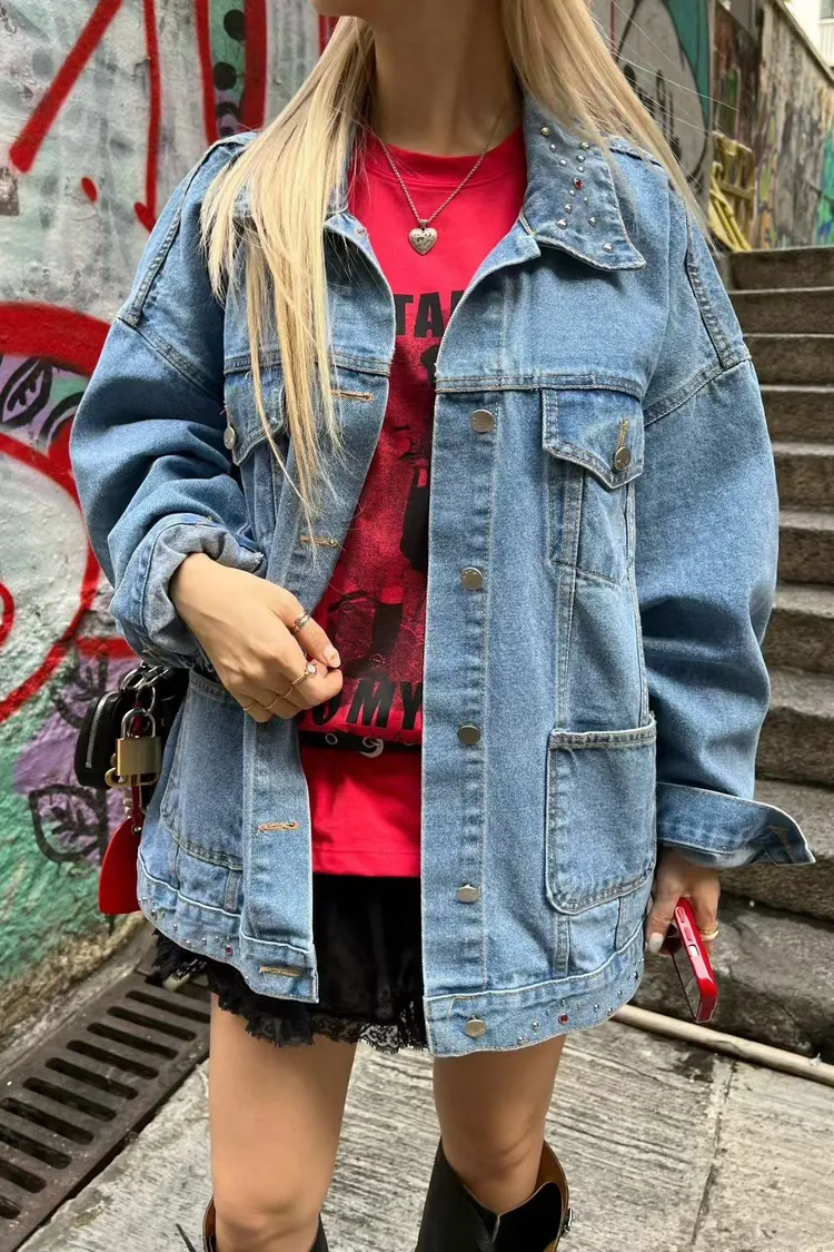 棉 個性款 鉚釘小寶石下擺 落肩款 oversize 有磅數 有口袋