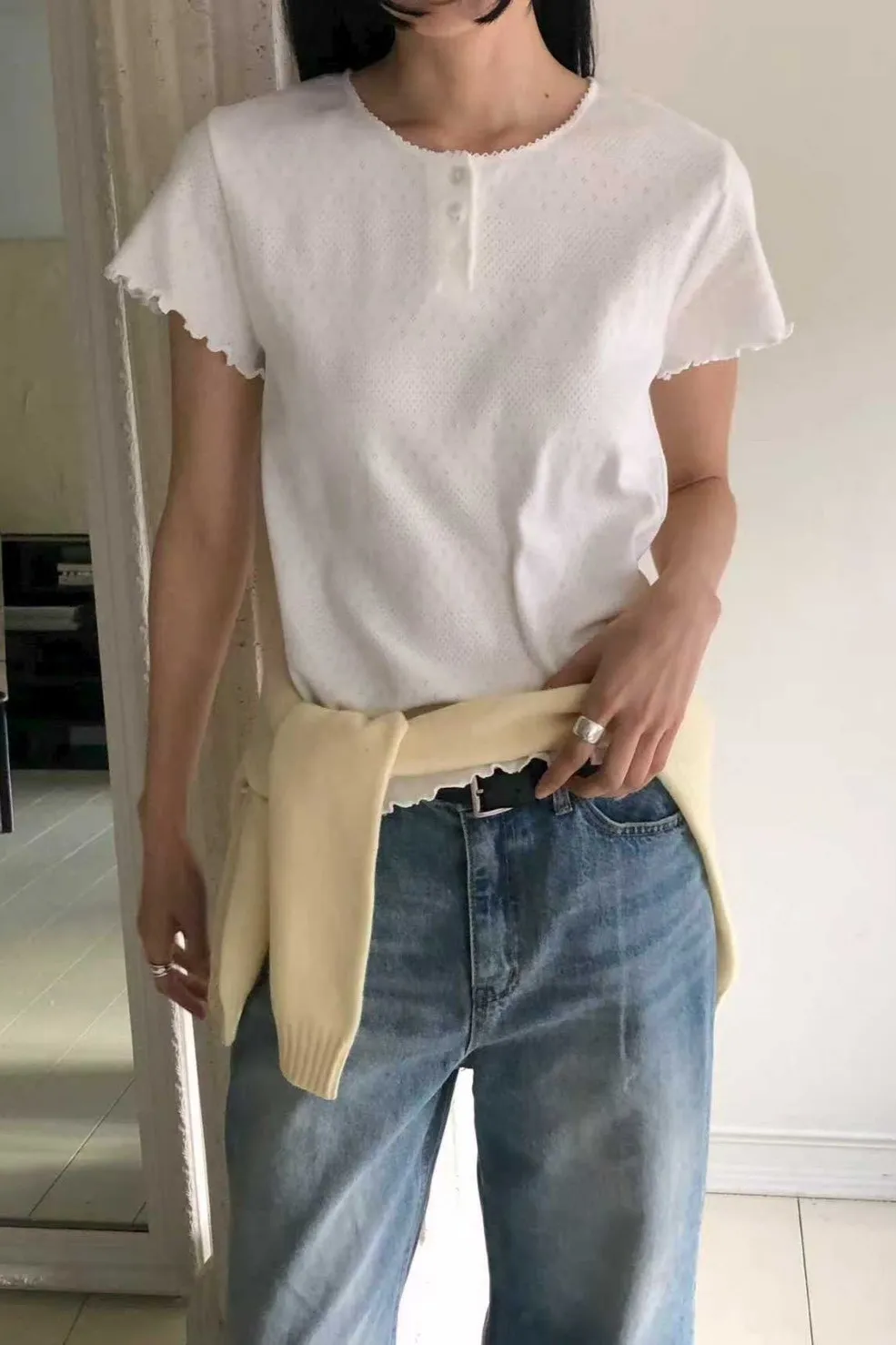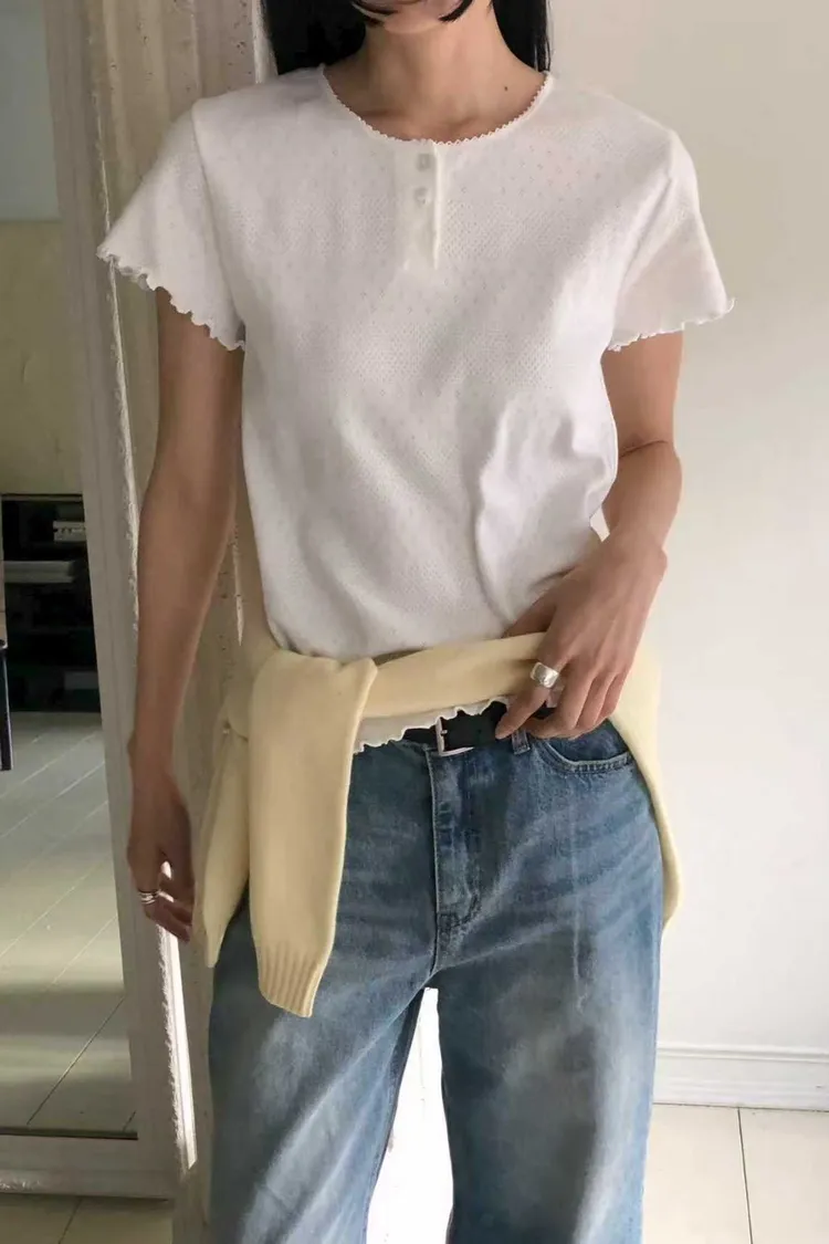 棉+彈力 燒花棉 精緻細洞 有彈性 木耳滾邊 胸前三釦