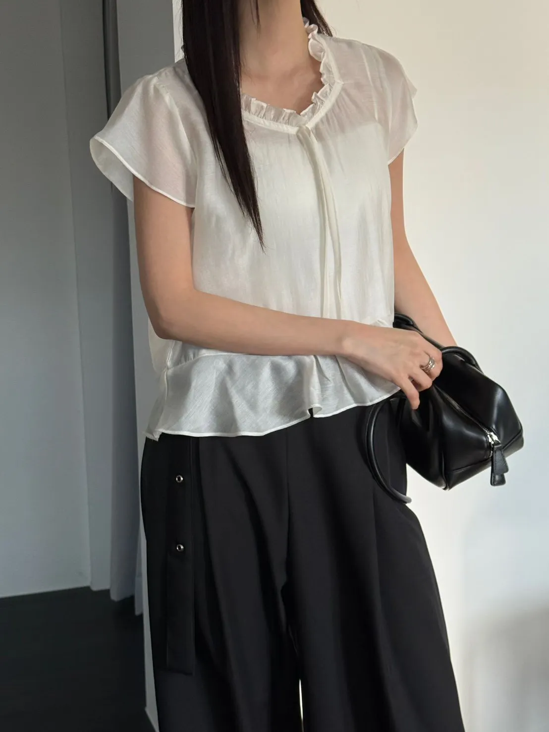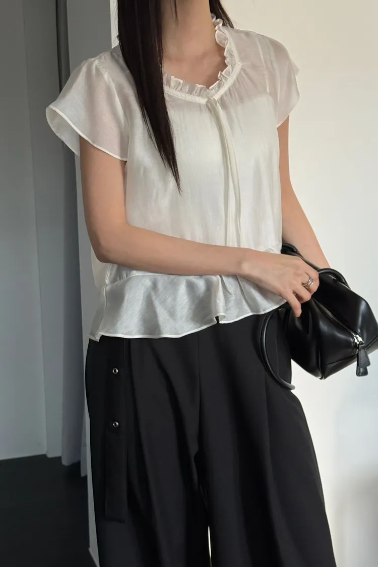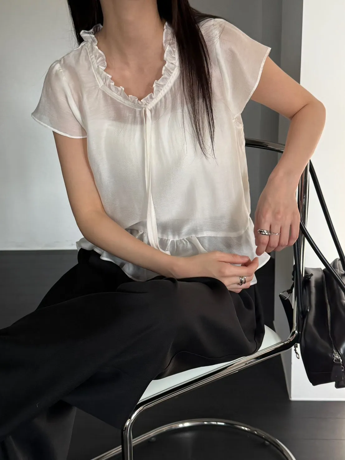 人造絲+聚酯 極度薄款輕盈 親膚柔軟 微光澤 荷葉領口下擺胸綁帶