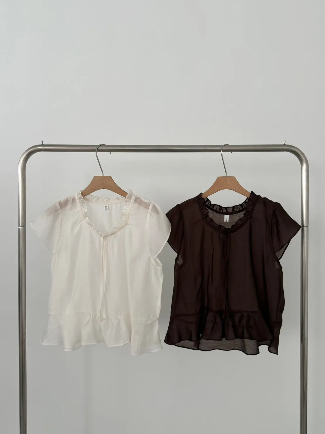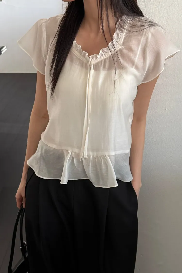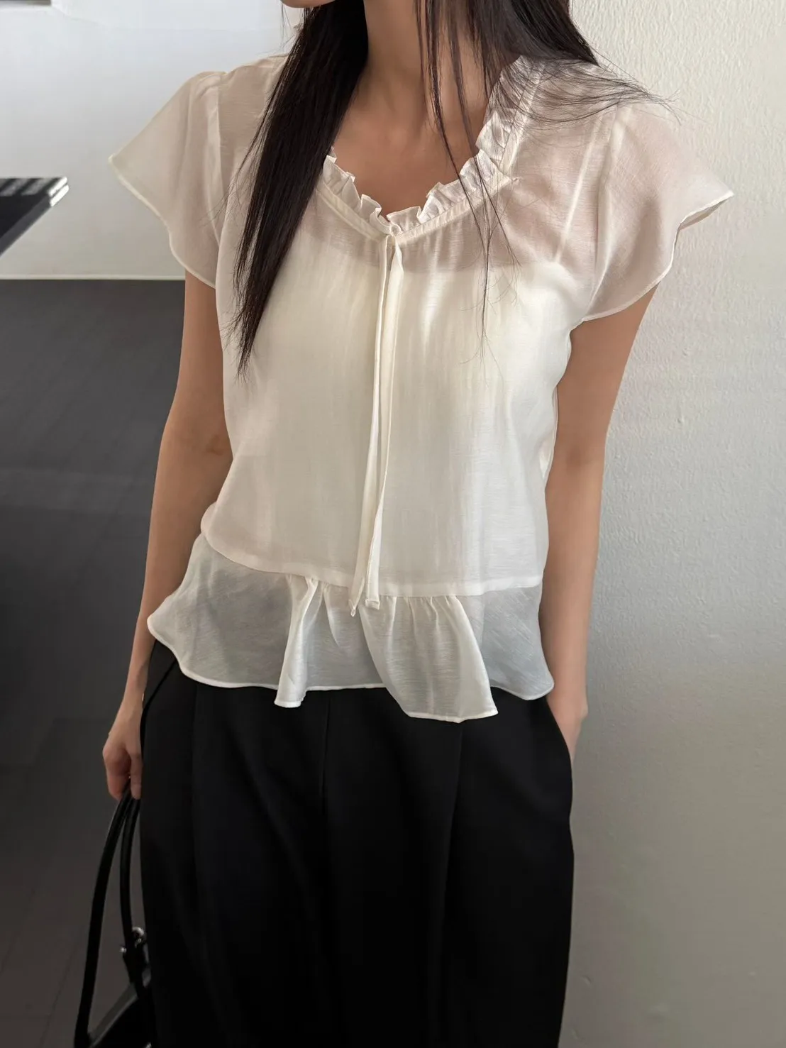 人造絲+聚酯 極度薄款輕盈 親膚柔軟 微光澤 荷葉領口下擺胸綁帶