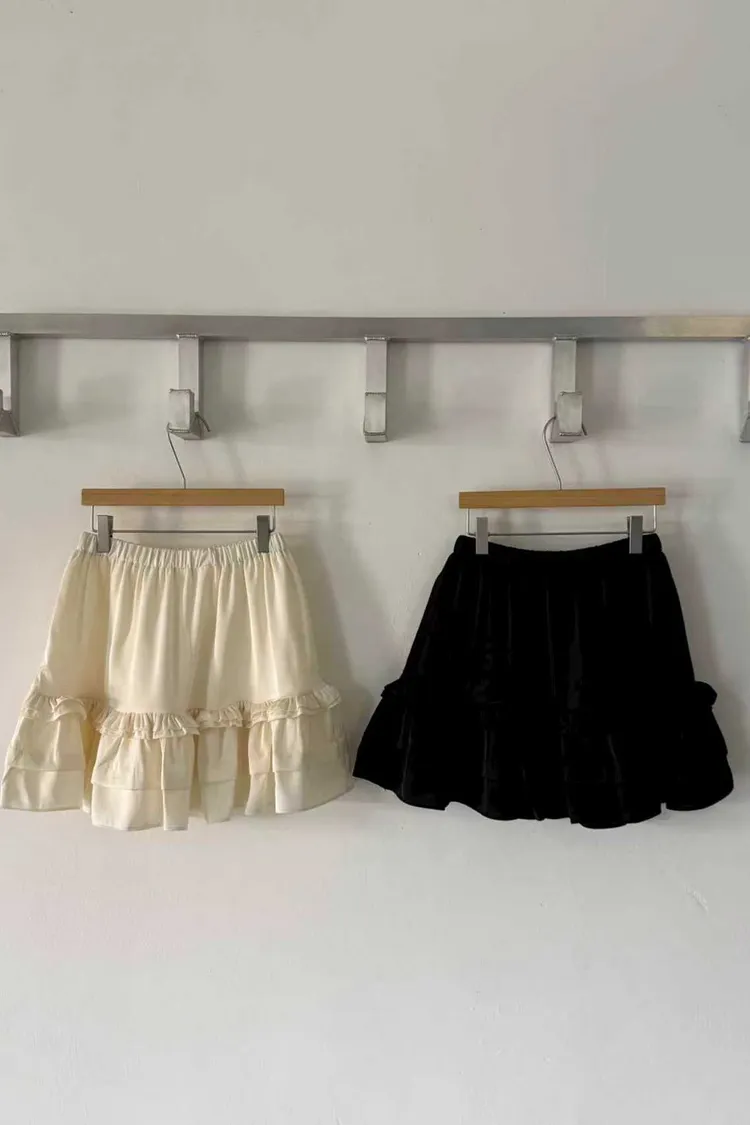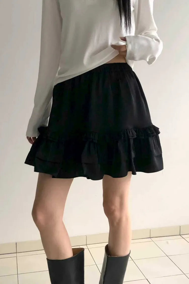 棉+聚酯+彈力 緞面光澤 全腰彈性 荷葉層次下擺