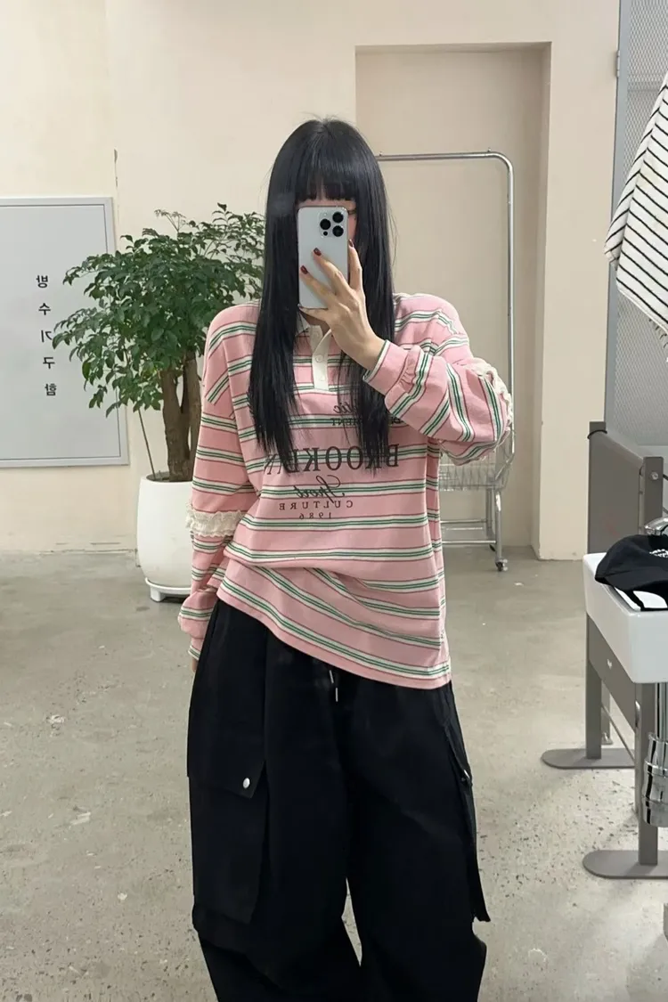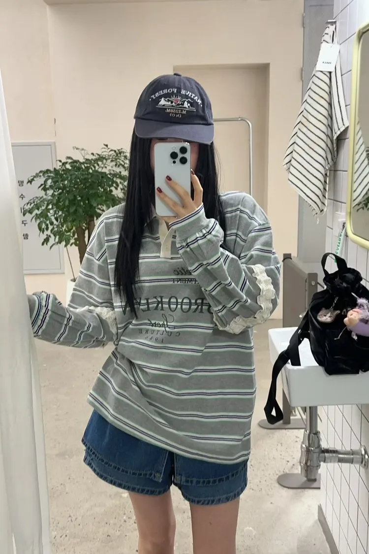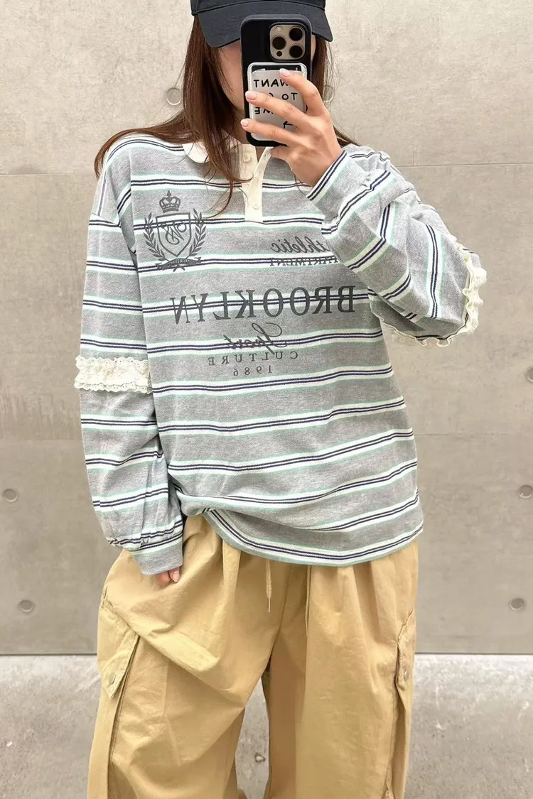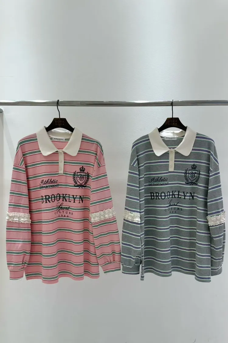 棉 蕾絲鑲嵌手袖 英倫logo 好看拚色橫條紋 bora