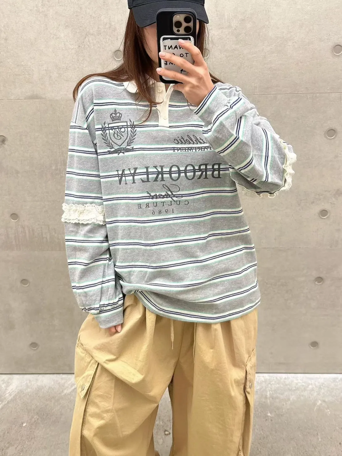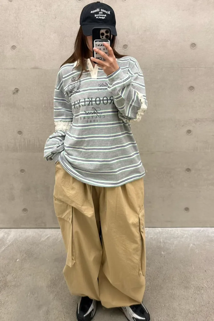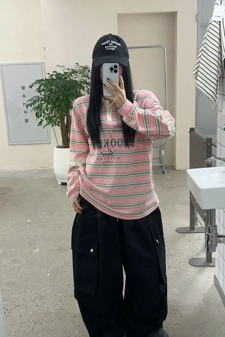 棉 蕾絲鑲嵌手袖 英倫logo 好看拚色橫條紋 bora