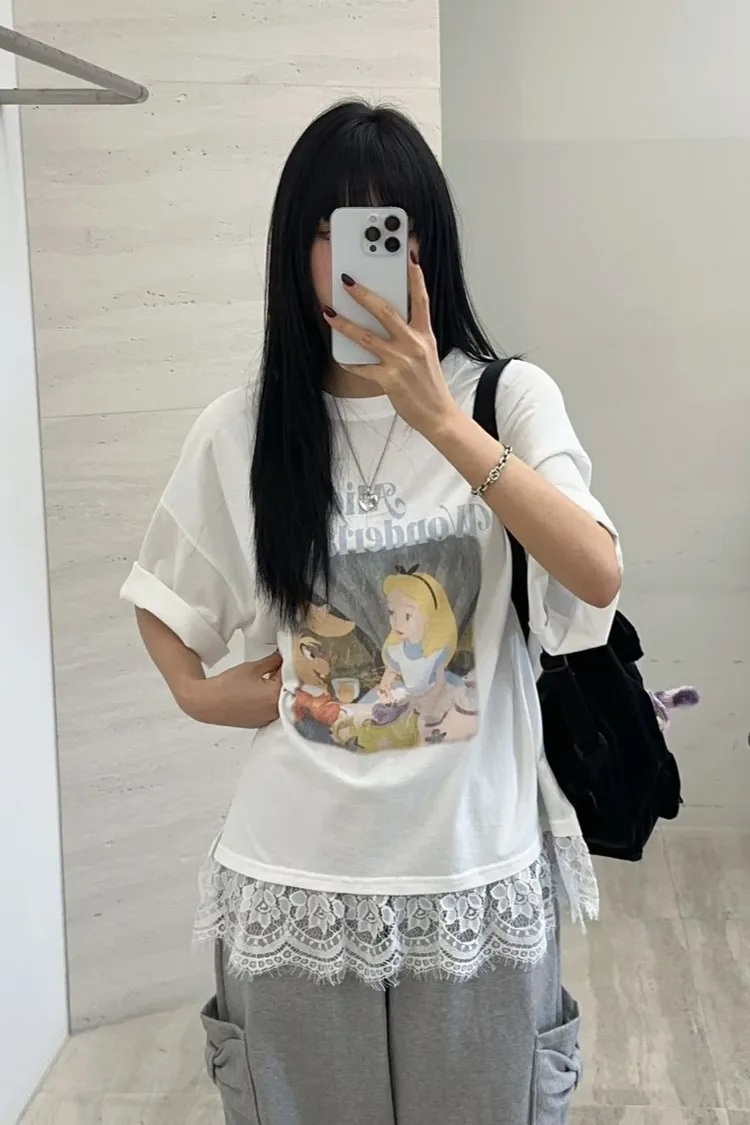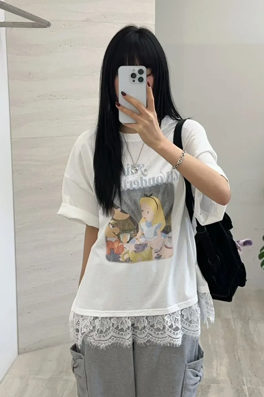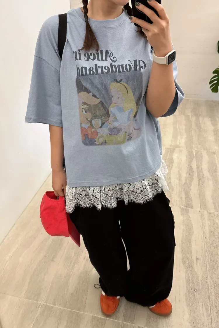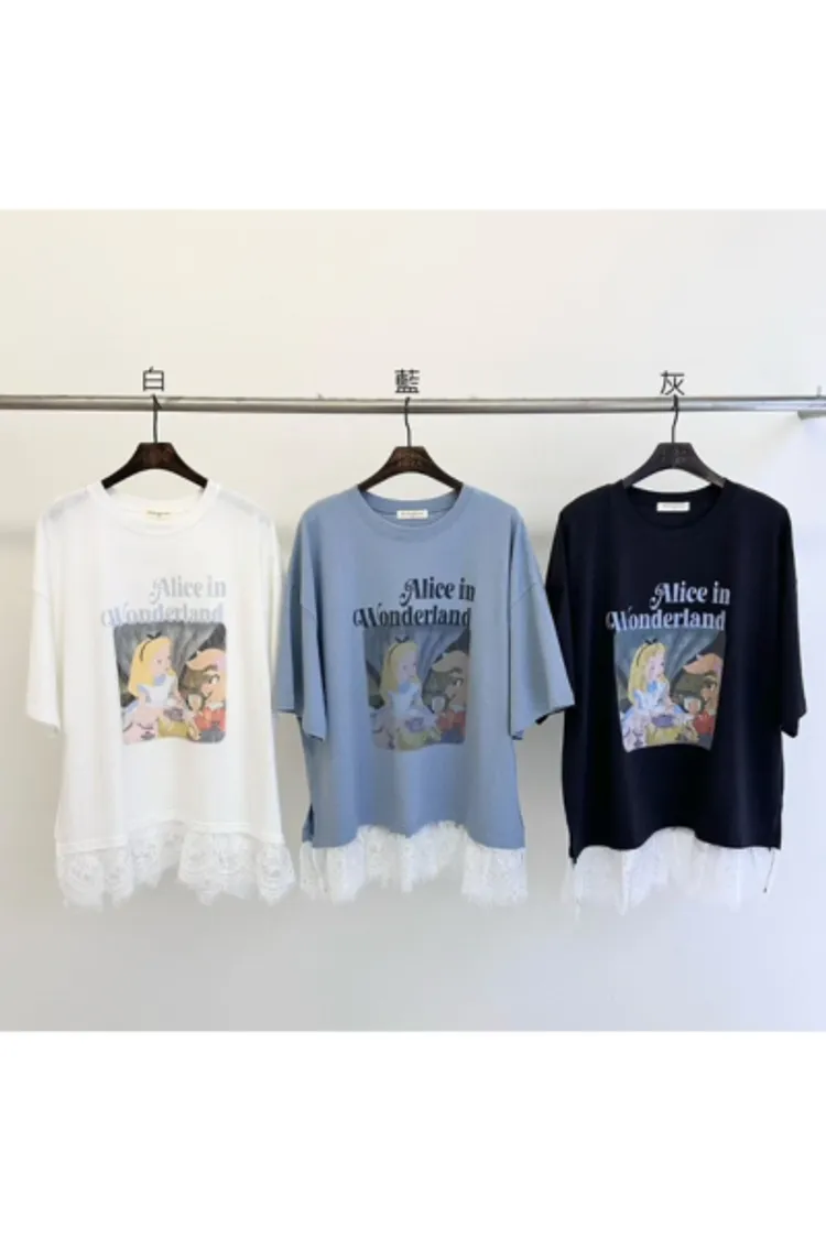 棉 薄款輕盈 柔軟透氣 復古斑駁印刷 下擺睫毛蕾絲 適合夏天 XXL友善 blue