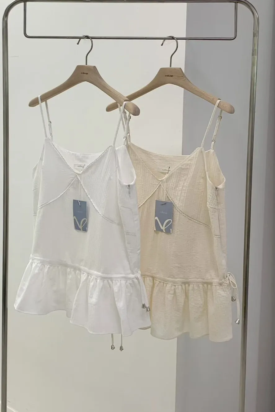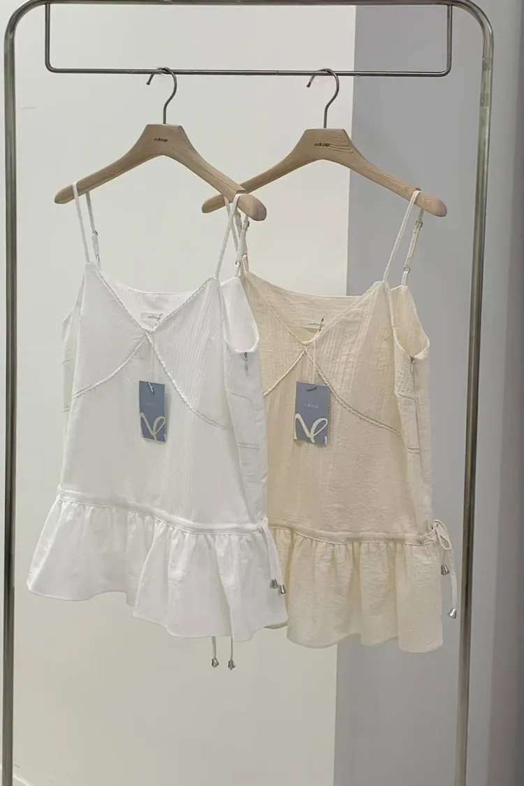 棉 細緻隱約直條紋 肩帶可調 無內裡 藏腹小裙擺 雙側腰抽繩