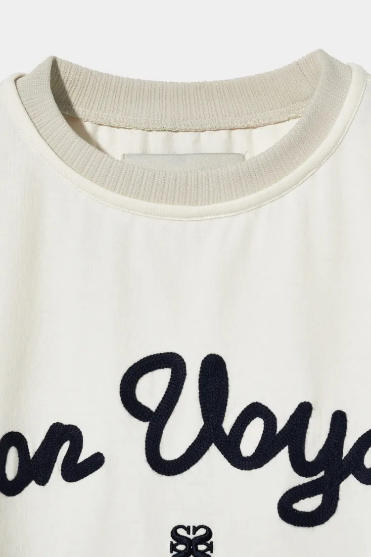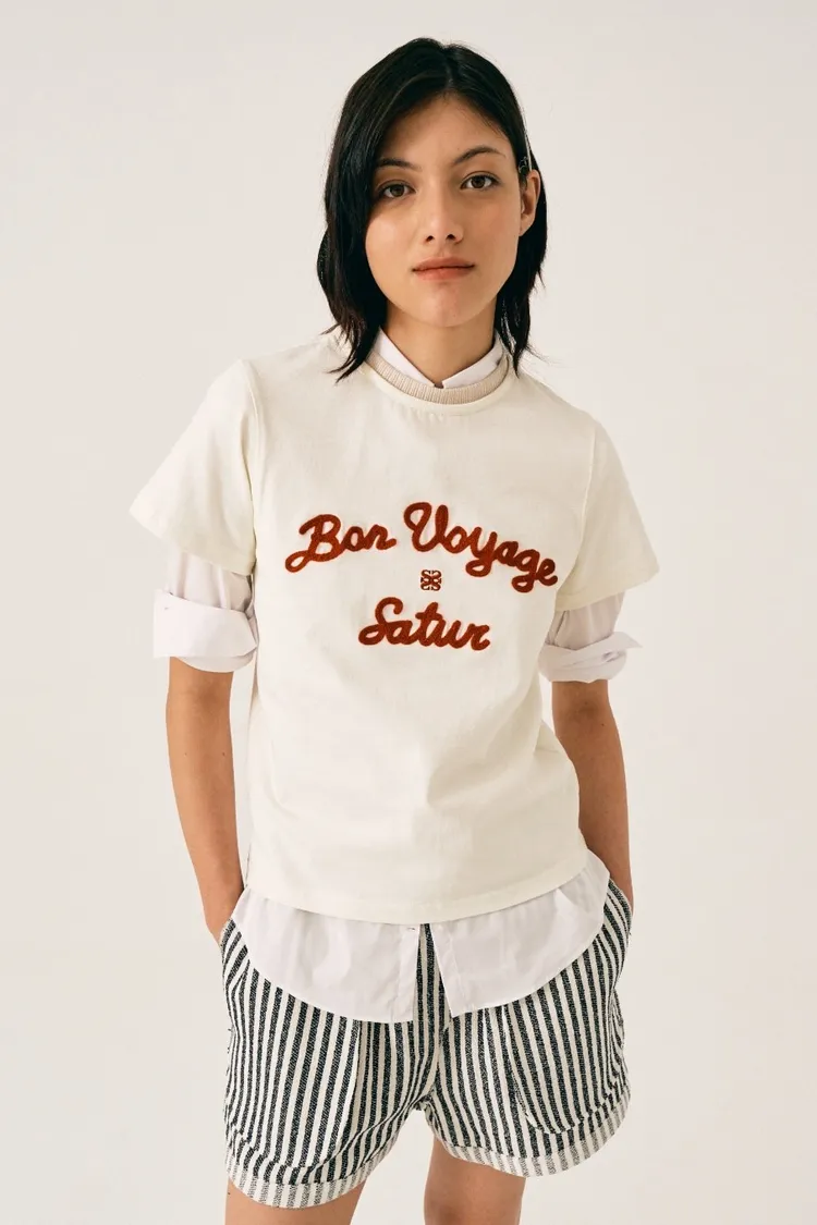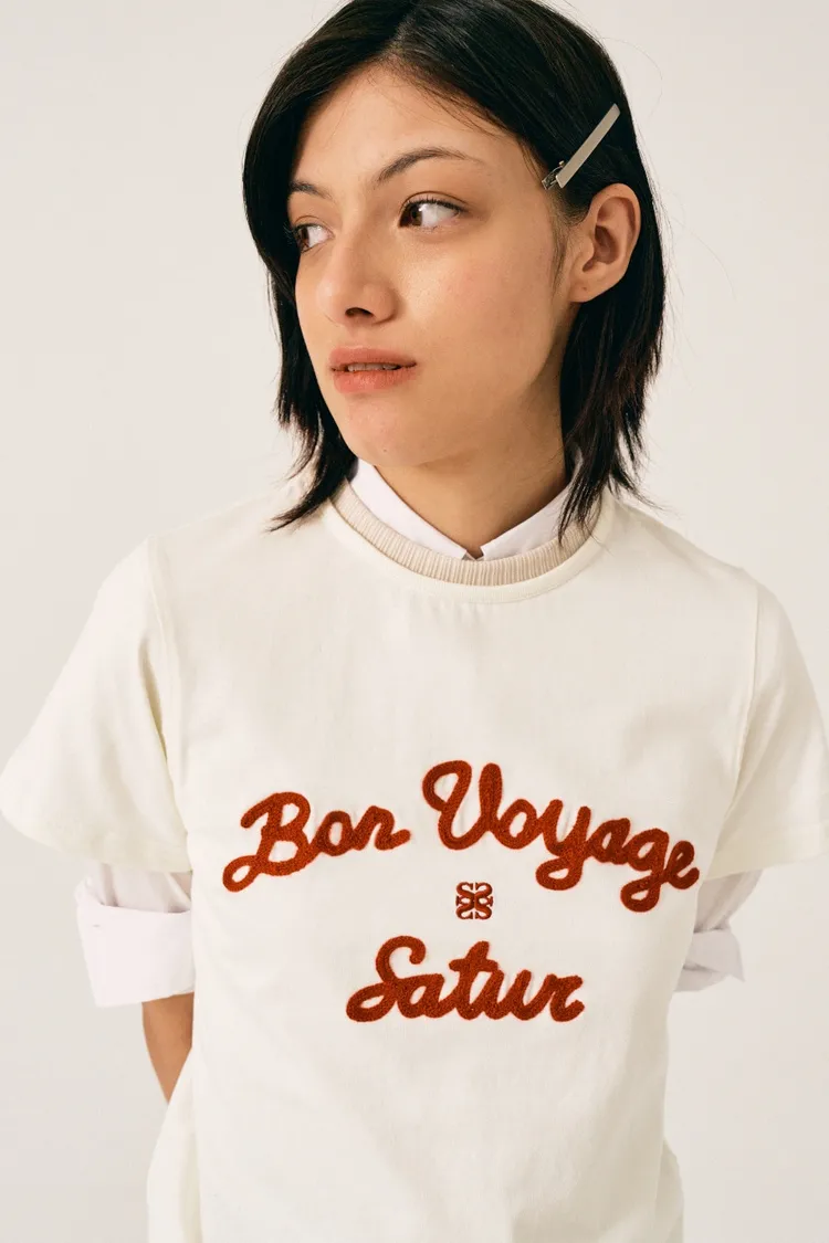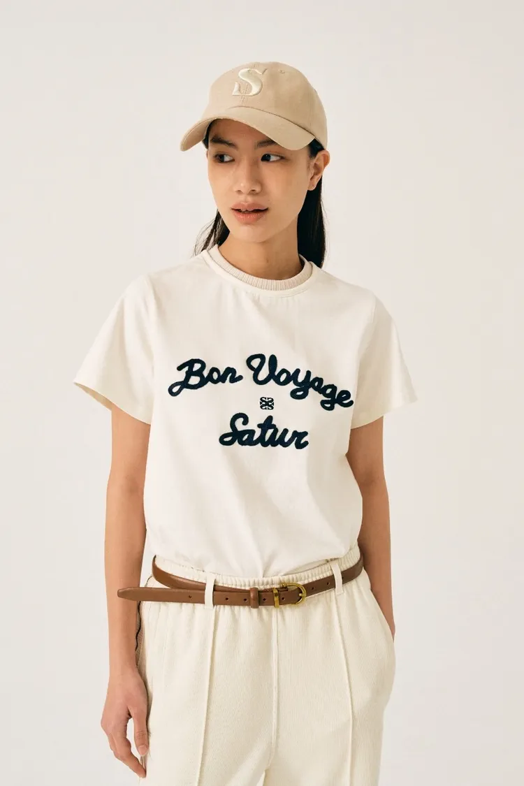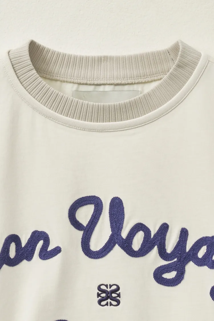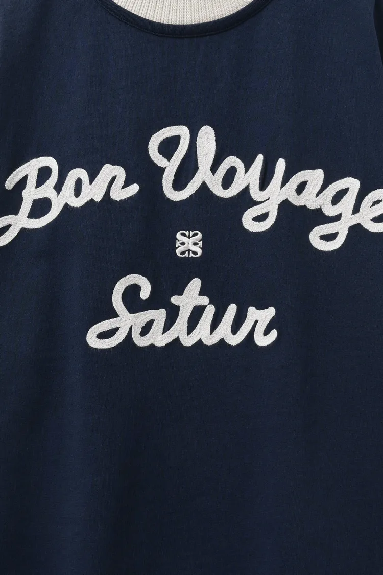 "BON VOYAGE" 字母圖案以精緻的鍊式刺繡工藝呈現增添高級感