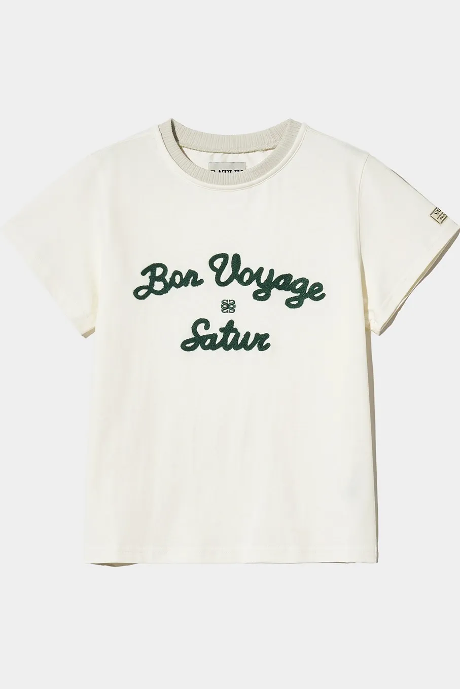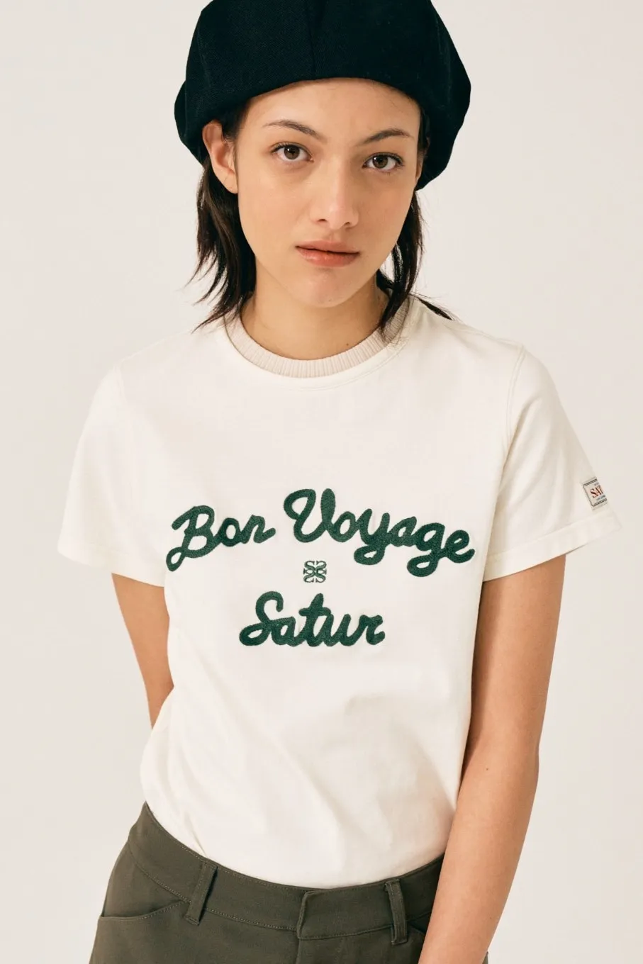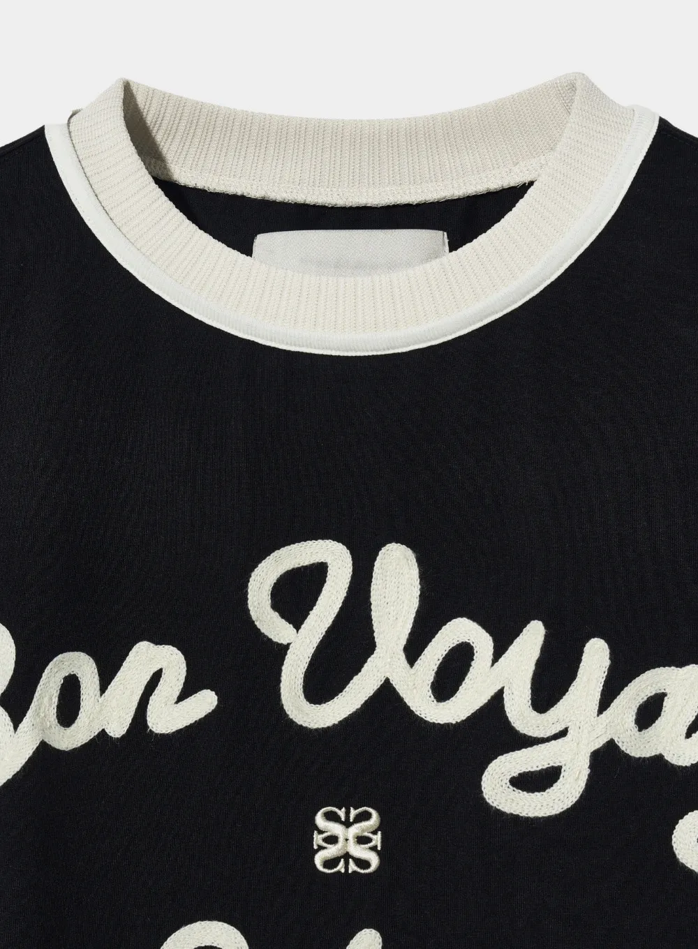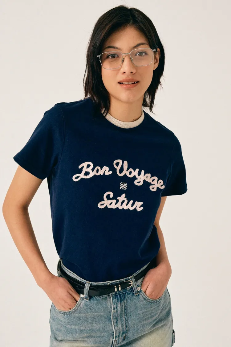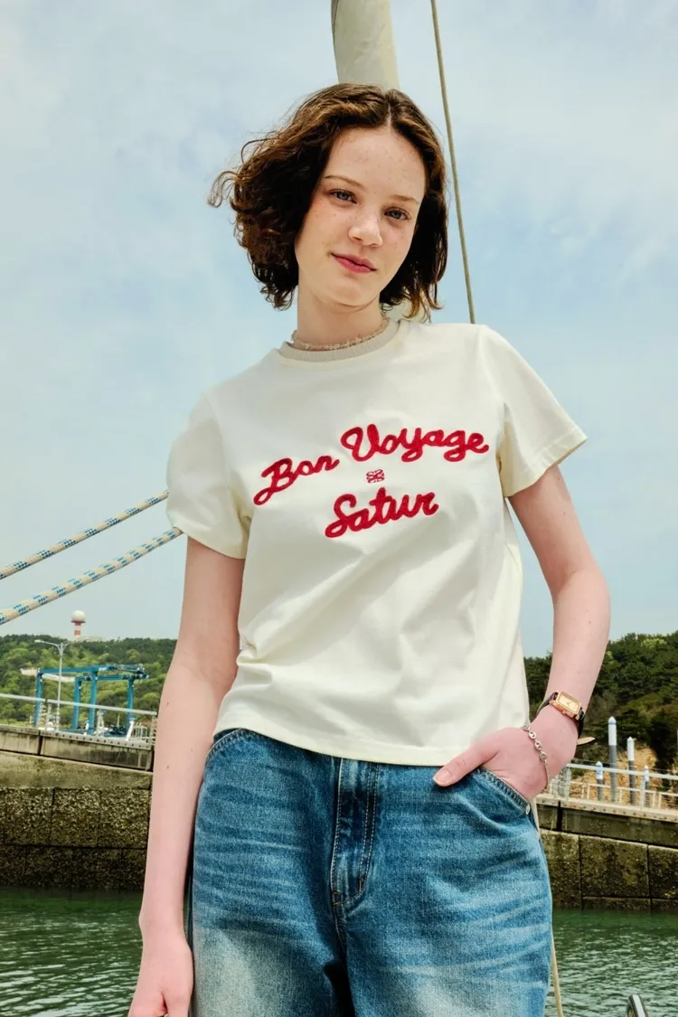 "BON VOYAGE" 字母圖案以精緻的鍊式刺繡工藝呈現增添高級感