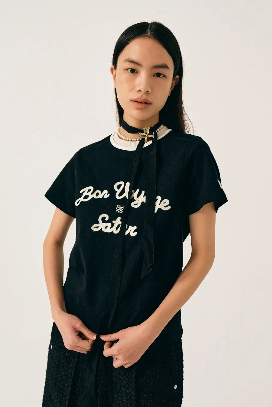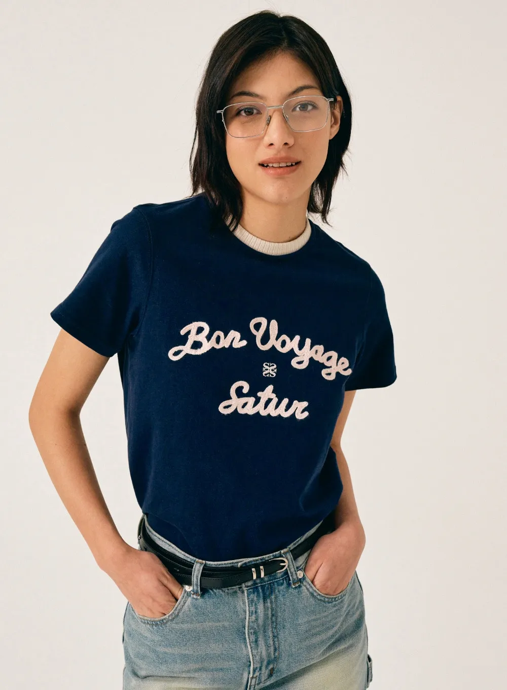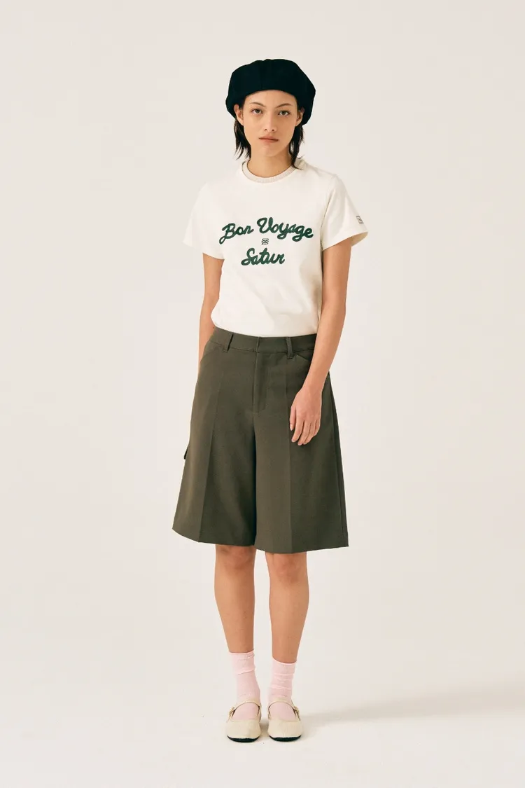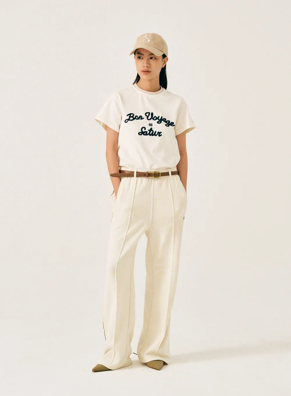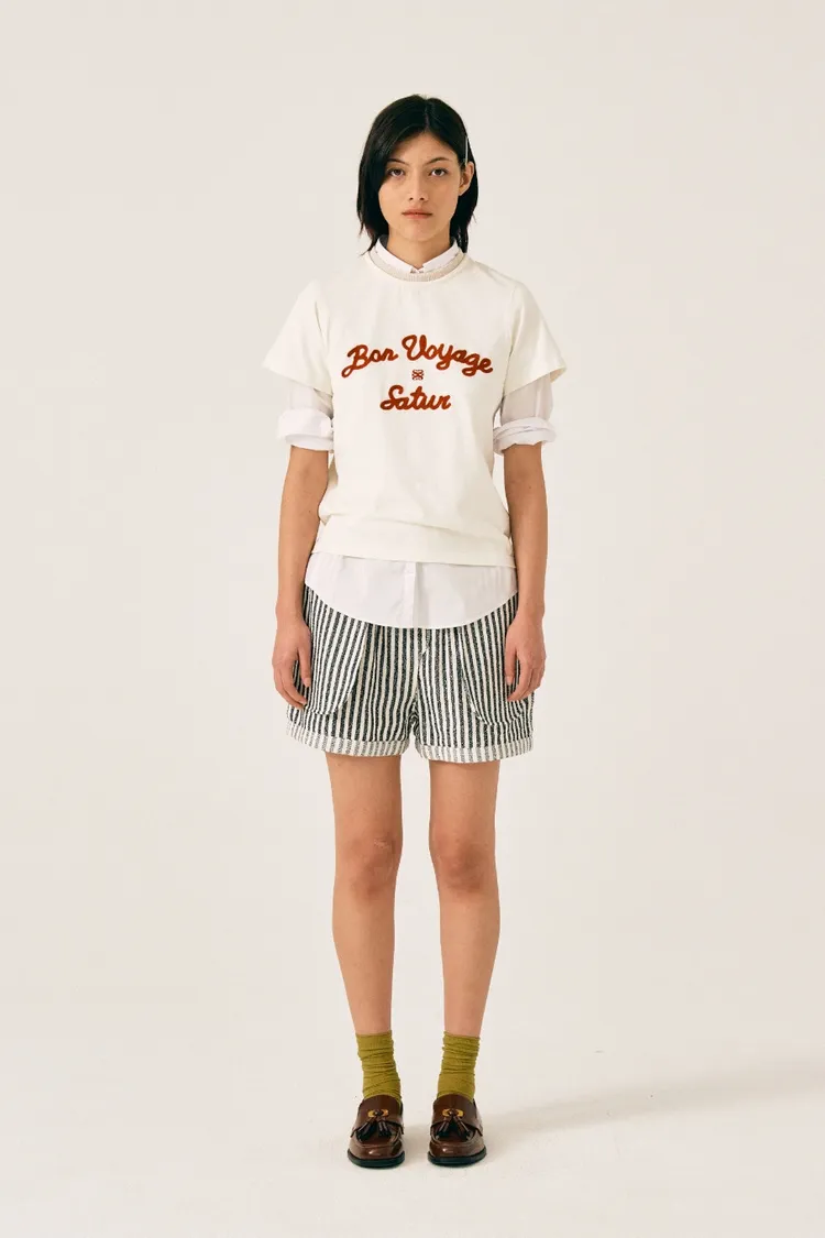 "BON VOYAGE" 字母圖案以精緻的鍊式刺繡工藝呈現增添高級感
