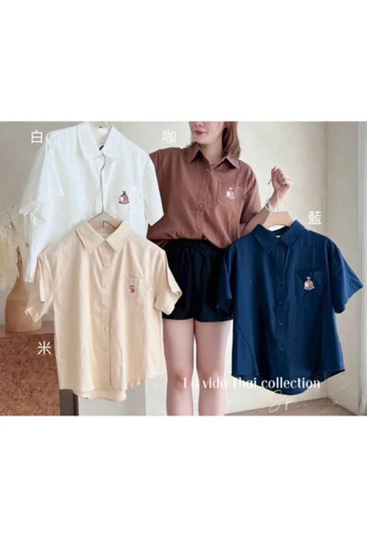 棉 涼感透氣舒適 可愛刺繡吐司 設計感口袋側邊鈕扣 適合夏天