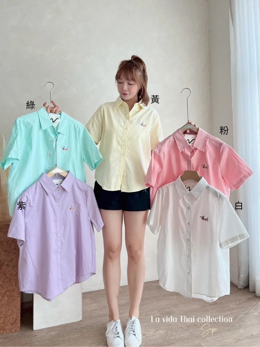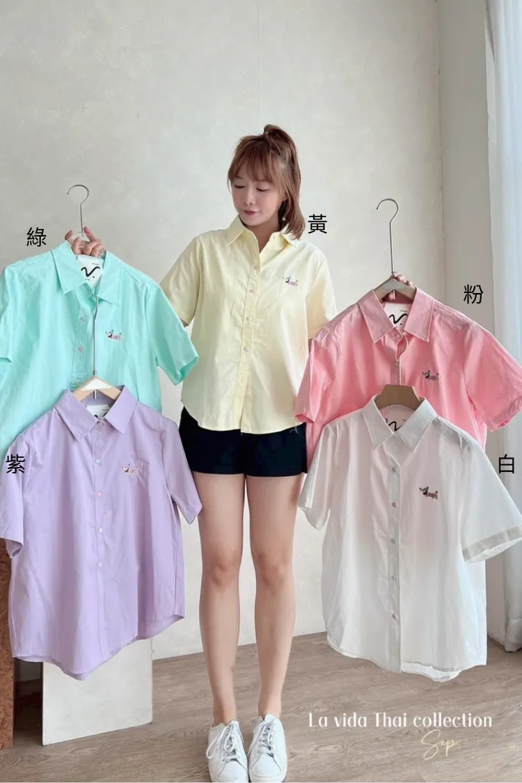 SG317可愛臘腸狗狗短袖襯衫 白 黃 綠 紫 粉 官網價$520 永恆甜甜價$490棉 涼感透氣舒適 可愛刺繡吐司 設計感口袋側邊鈕扣 適合夏天肩寬40胸寬56臂寬31袖長22袖口16全長59 以下顏色,如圖所示
