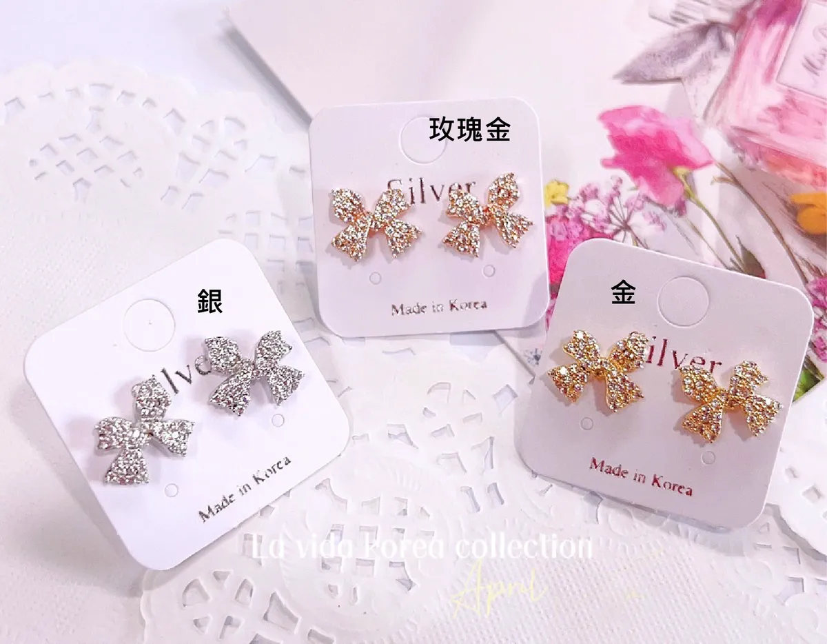 TA1111極美滿鑽蝴蝶結耳環 金 銀 玫瑰金 耳針$240 耳夾(螺旋夾)$260