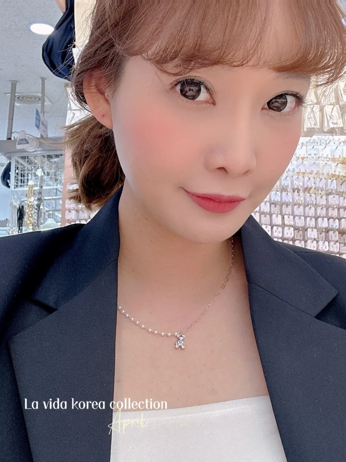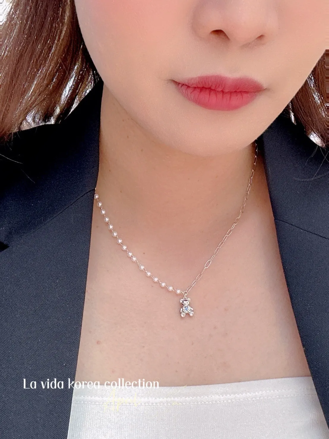 TA1159熊熊鍊條珍珠不對稱項鍊
