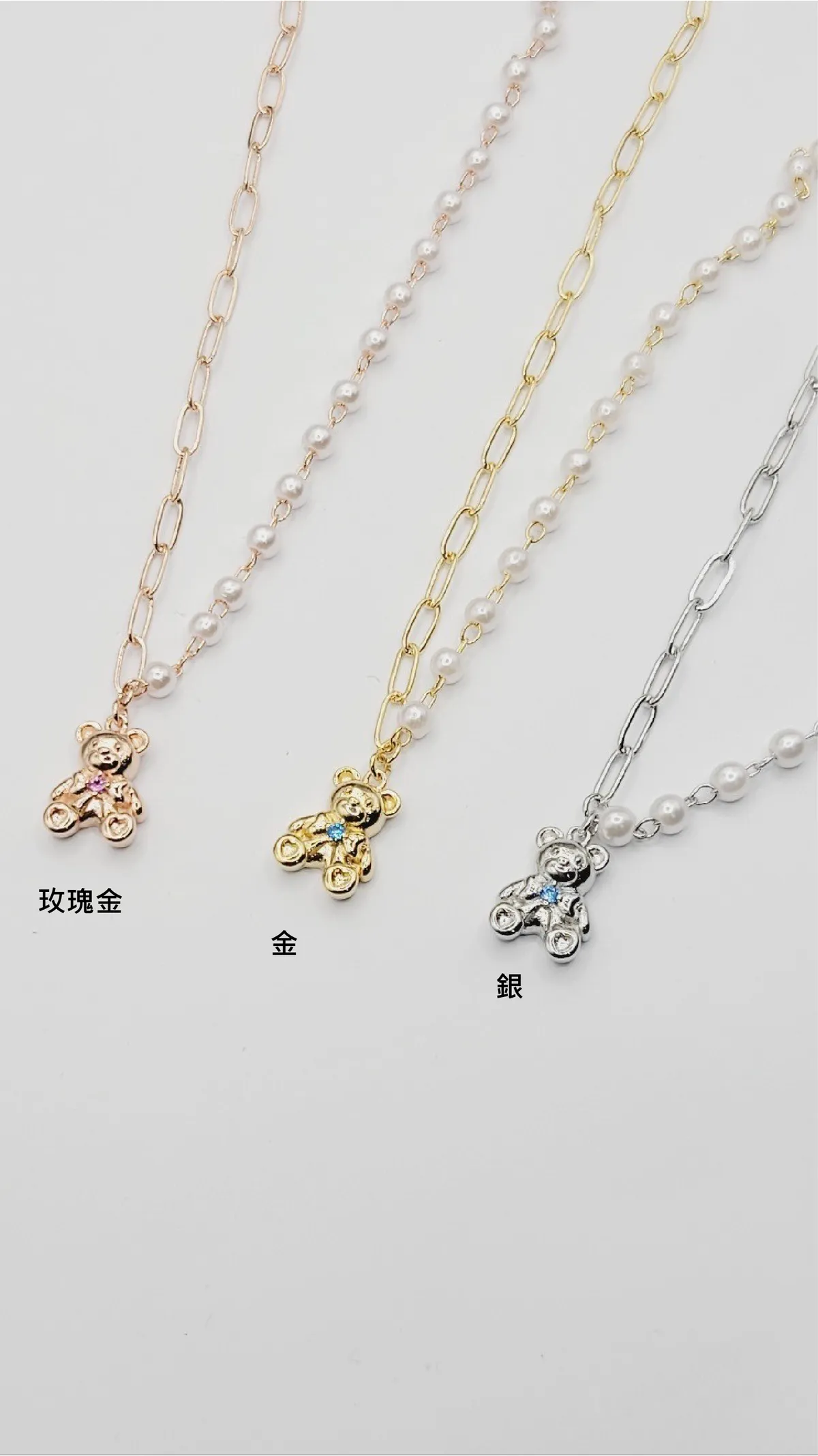 TA1159熊熊鍊條珍珠不對稱項鍊 金 銀 玫瑰金 $299
