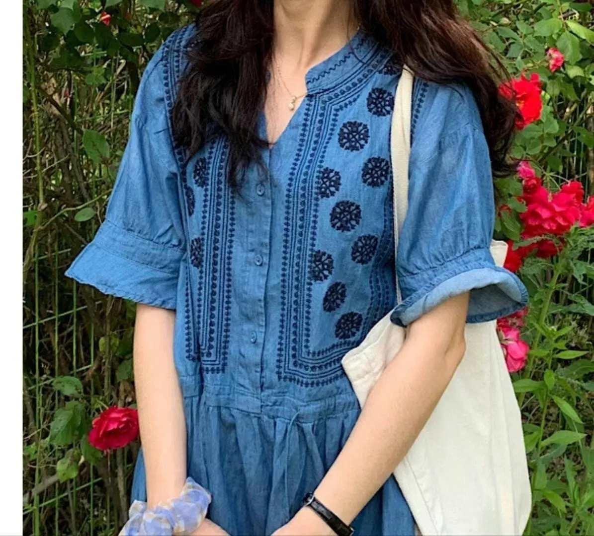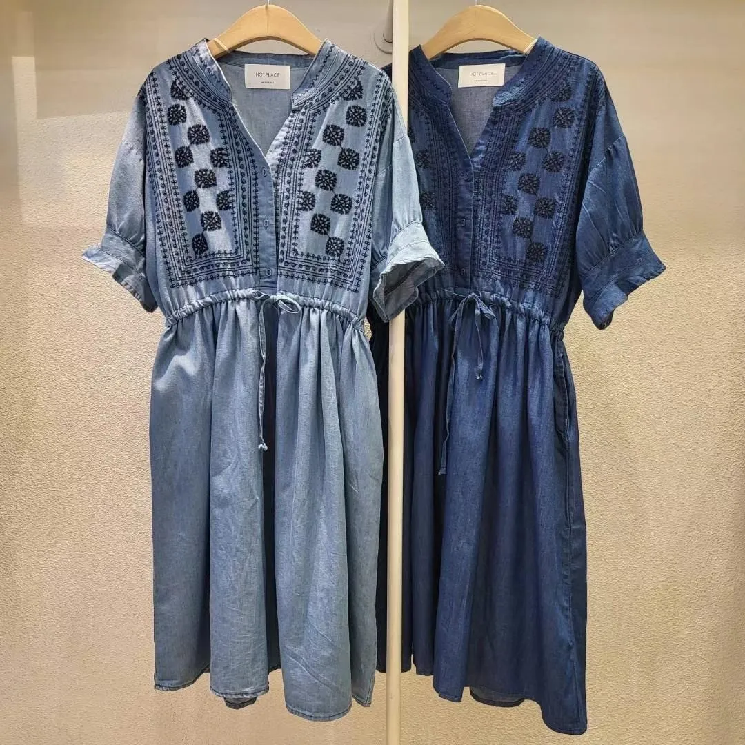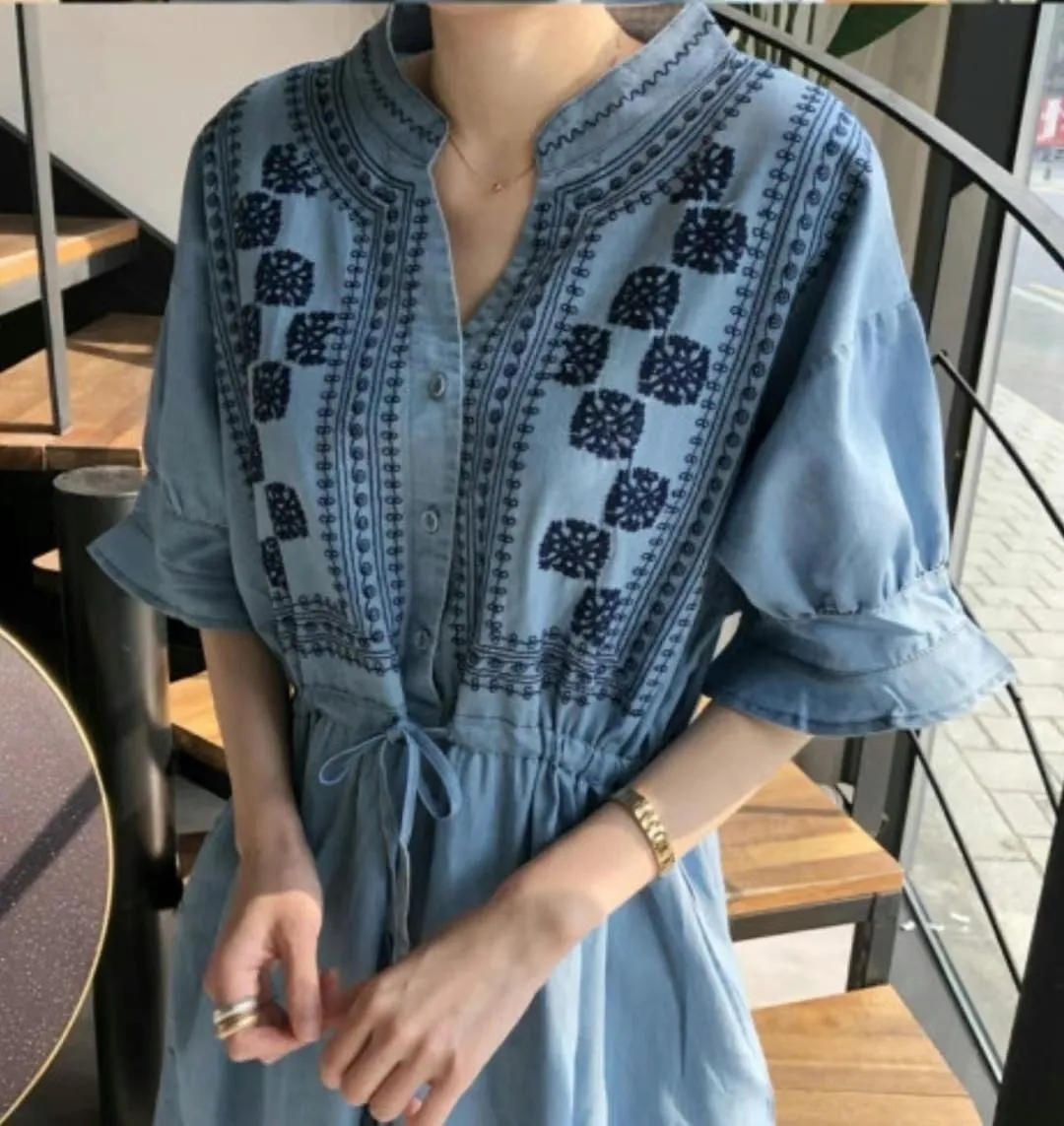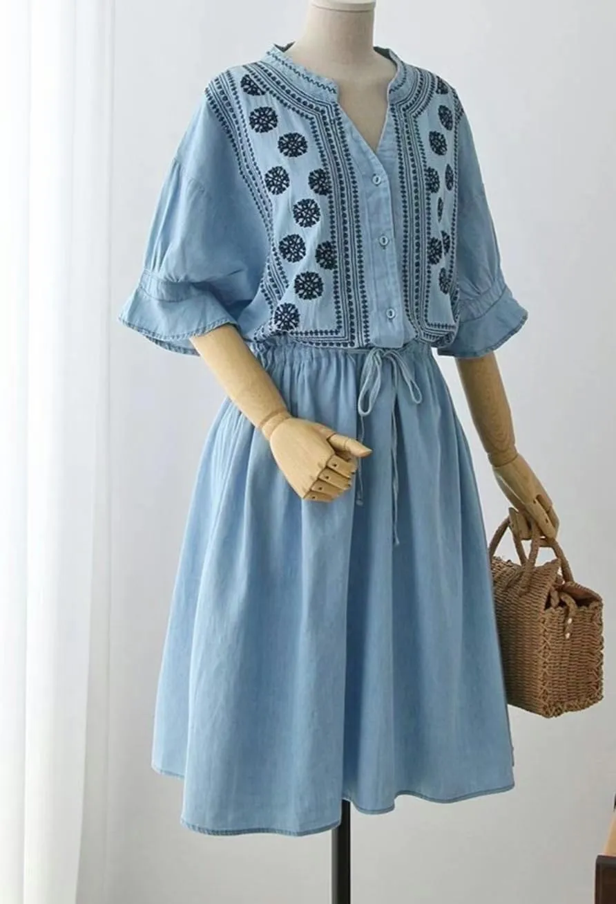 TA1408方塊刺繡荷葉袖洋裝 淺藍 深藍 官網價$950 線上價$920