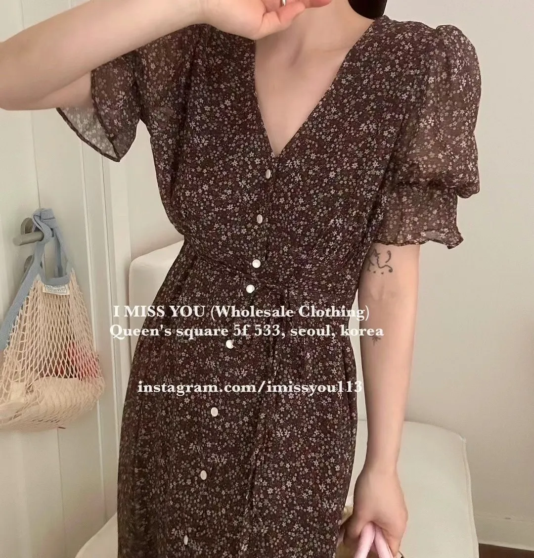 TA213復古文藝V領短袖洋裝(底色分色) 咖 黑 官網價$1590 線上價$1560
