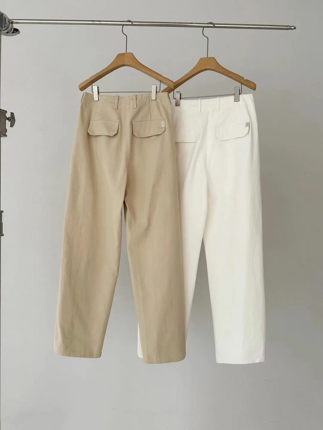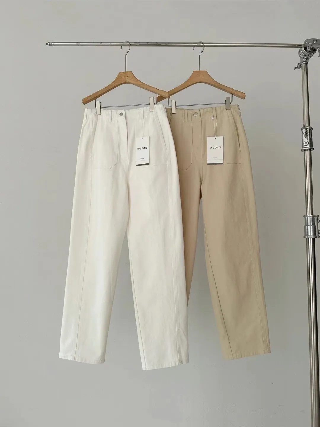 斜紋棉 釦鍊穿脫 有口袋 車線沿著褲管往前 後口袋有小布標