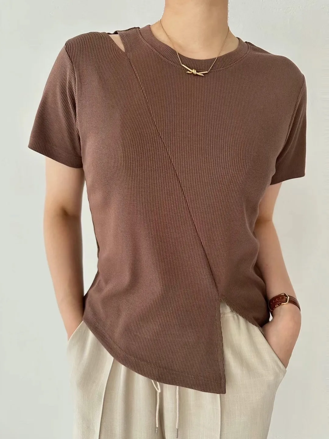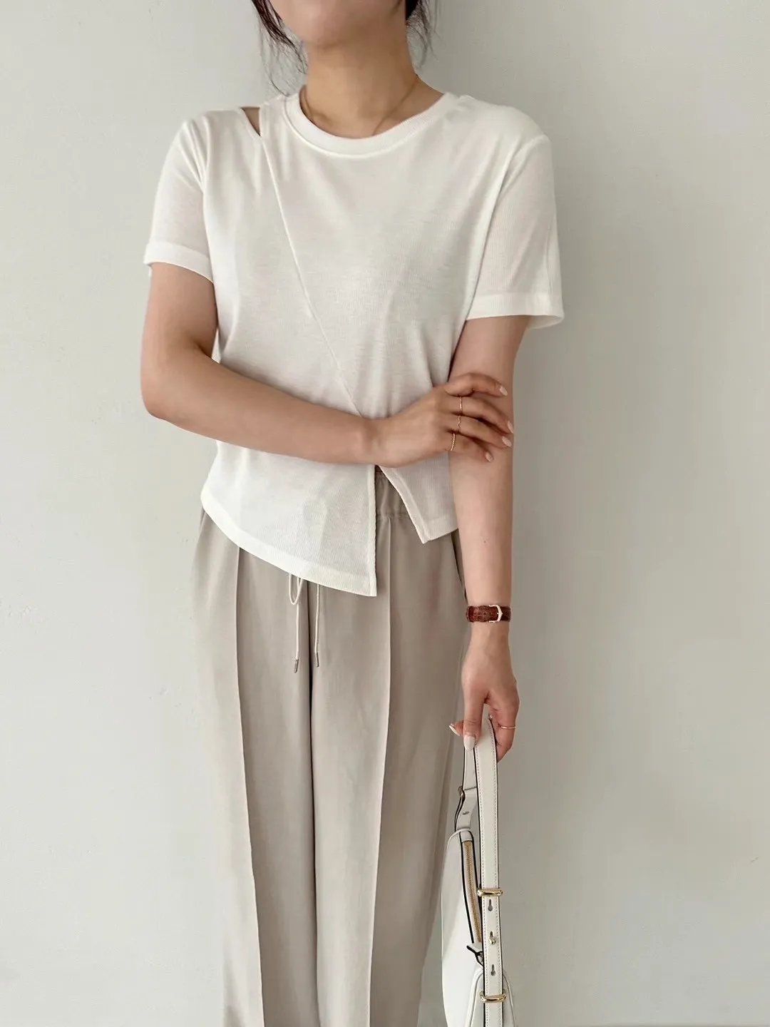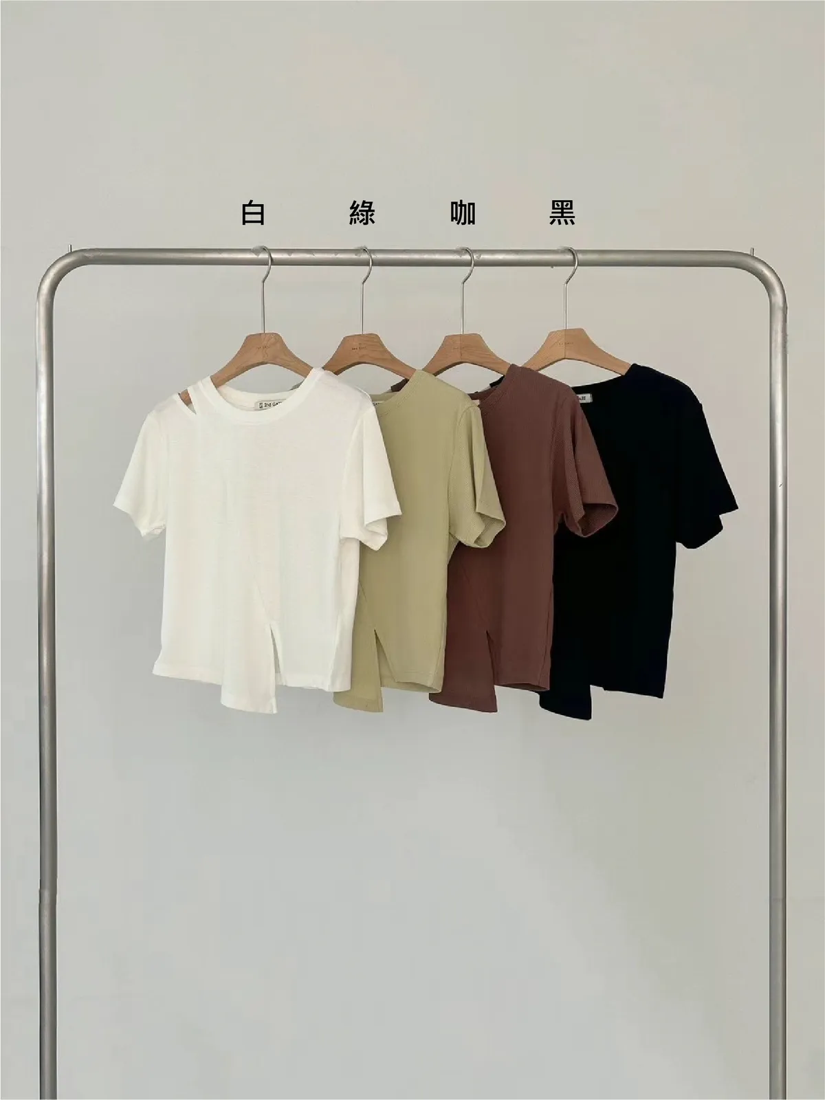 縲縈+聚酯+彈力,柔軟修身 切割車線側下擺開叉 單肩小簍空