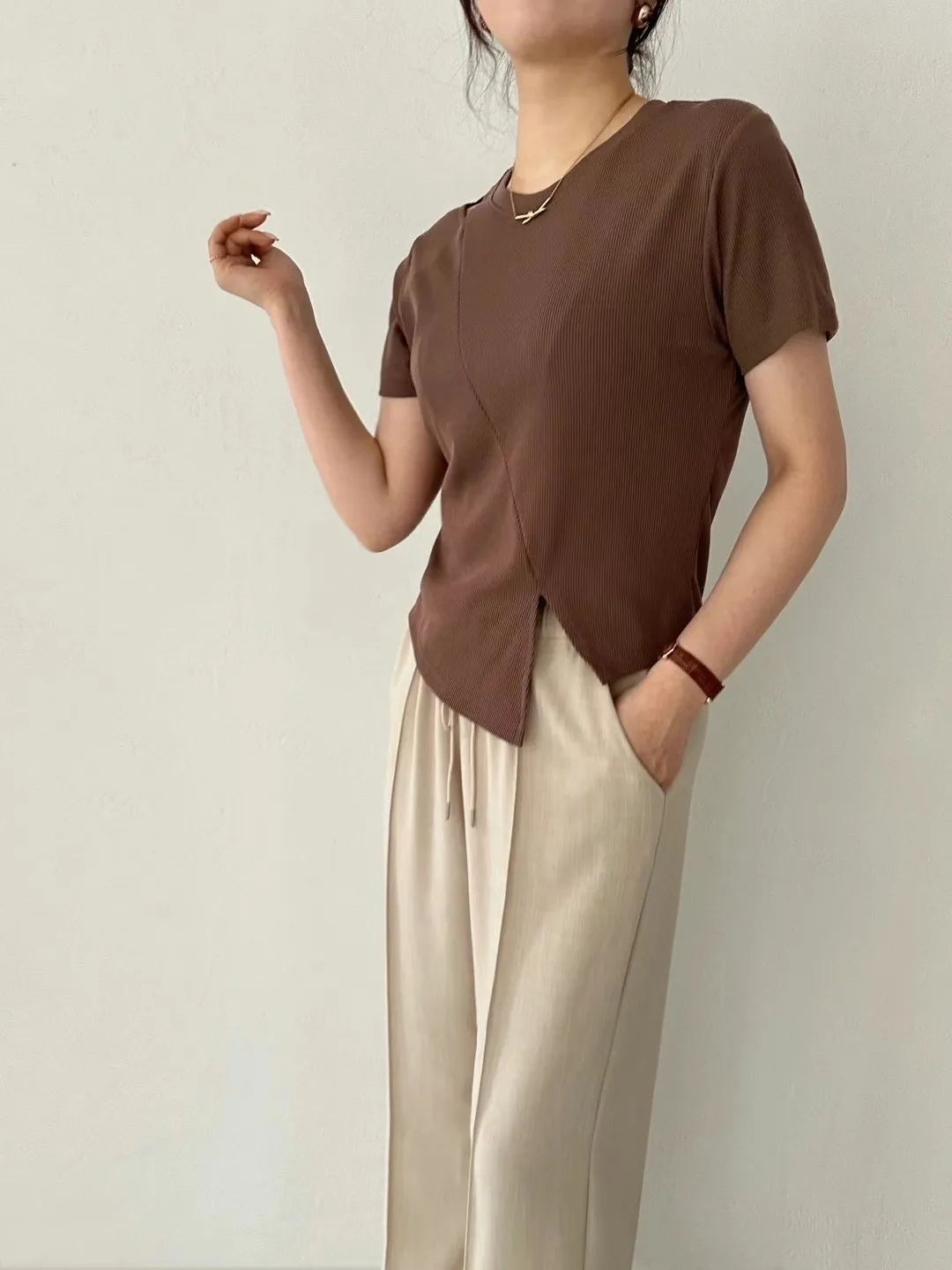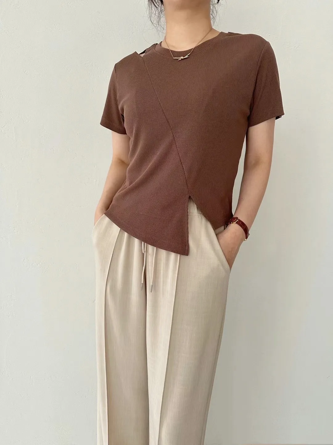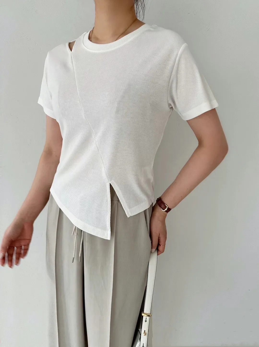 縲縈+聚酯+彈力,柔軟修身 切割車線側下擺開叉 單肩小簍空