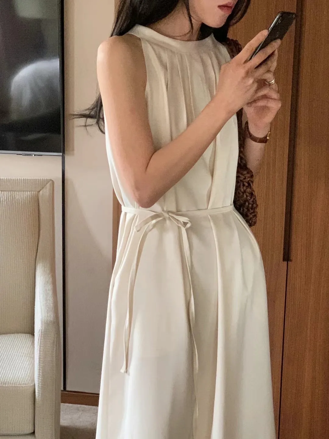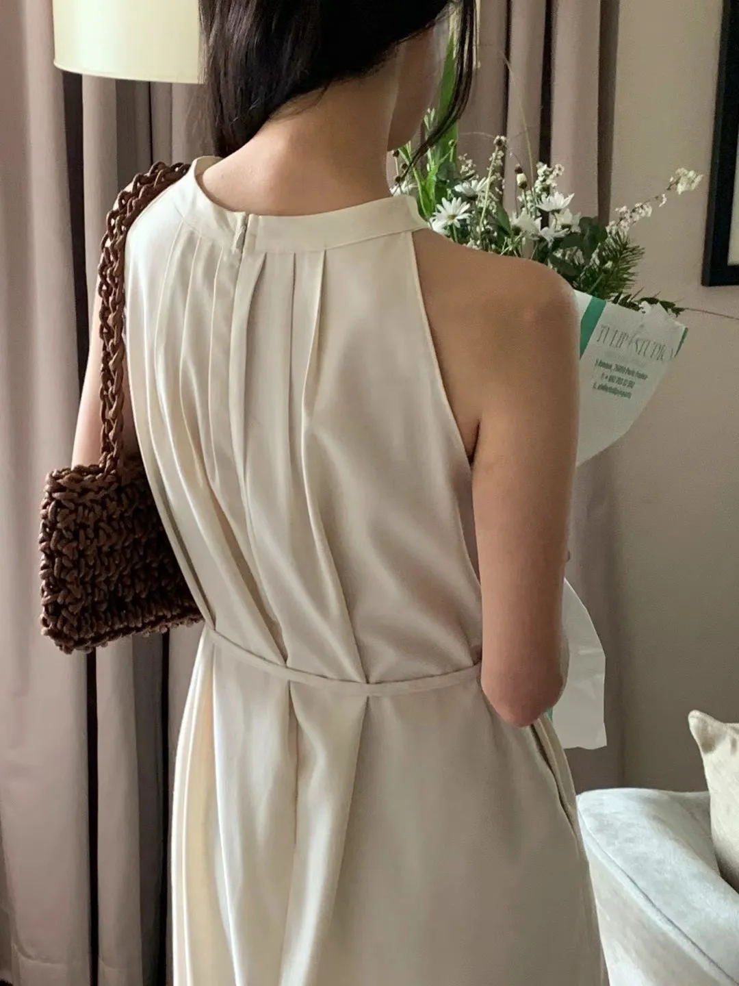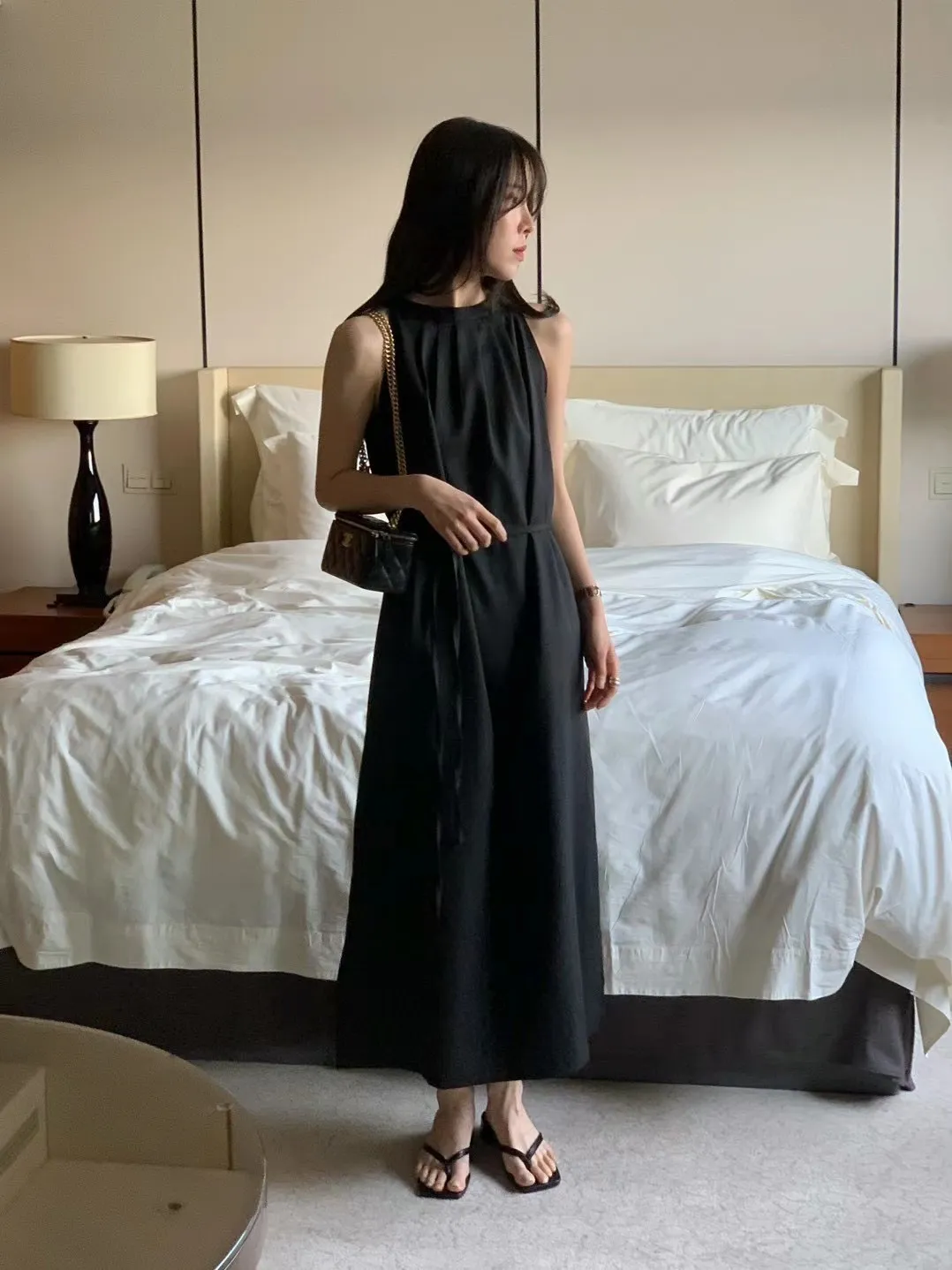 TA565女神無袖氣質洋裝(附綁帶) 米 黑 官網價$1410 線上價$1380