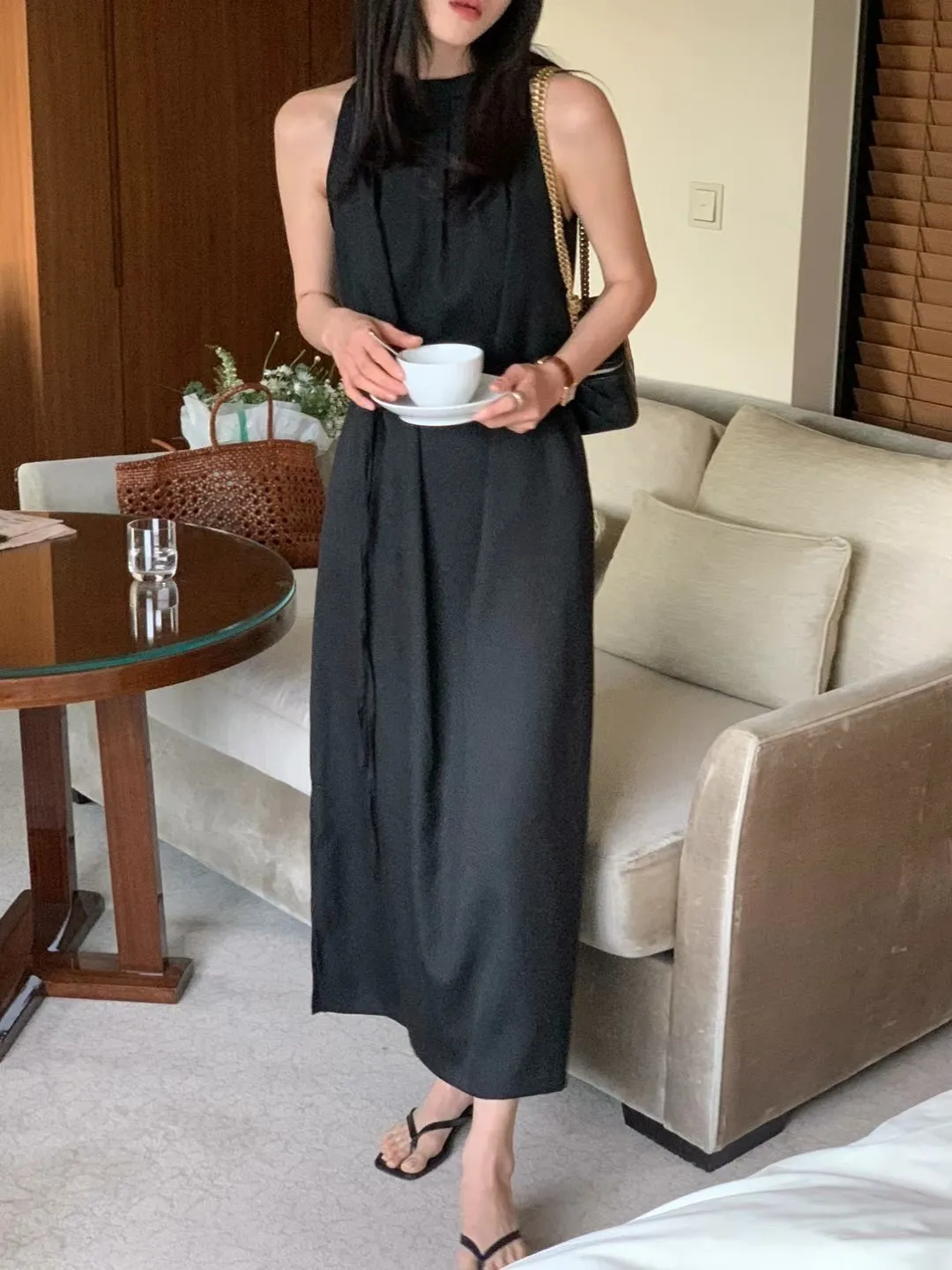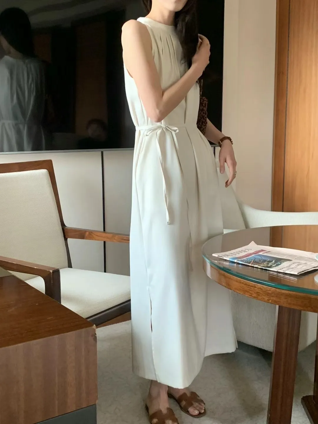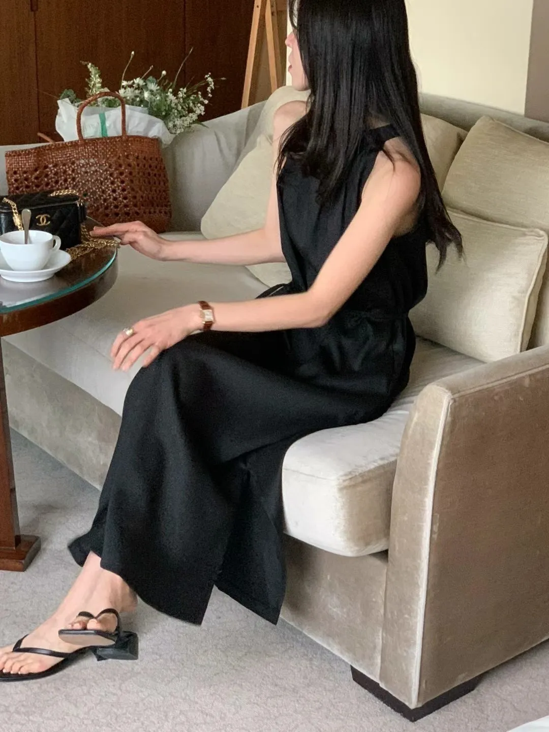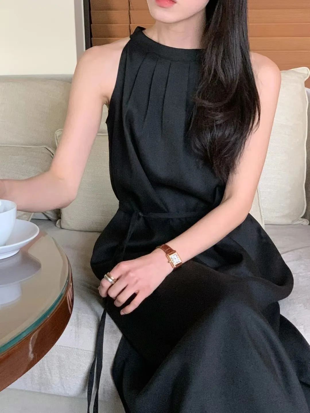 TA565女神無袖氣質洋裝(附綁帶) 米 黑 官網價$1410 線上價$1380