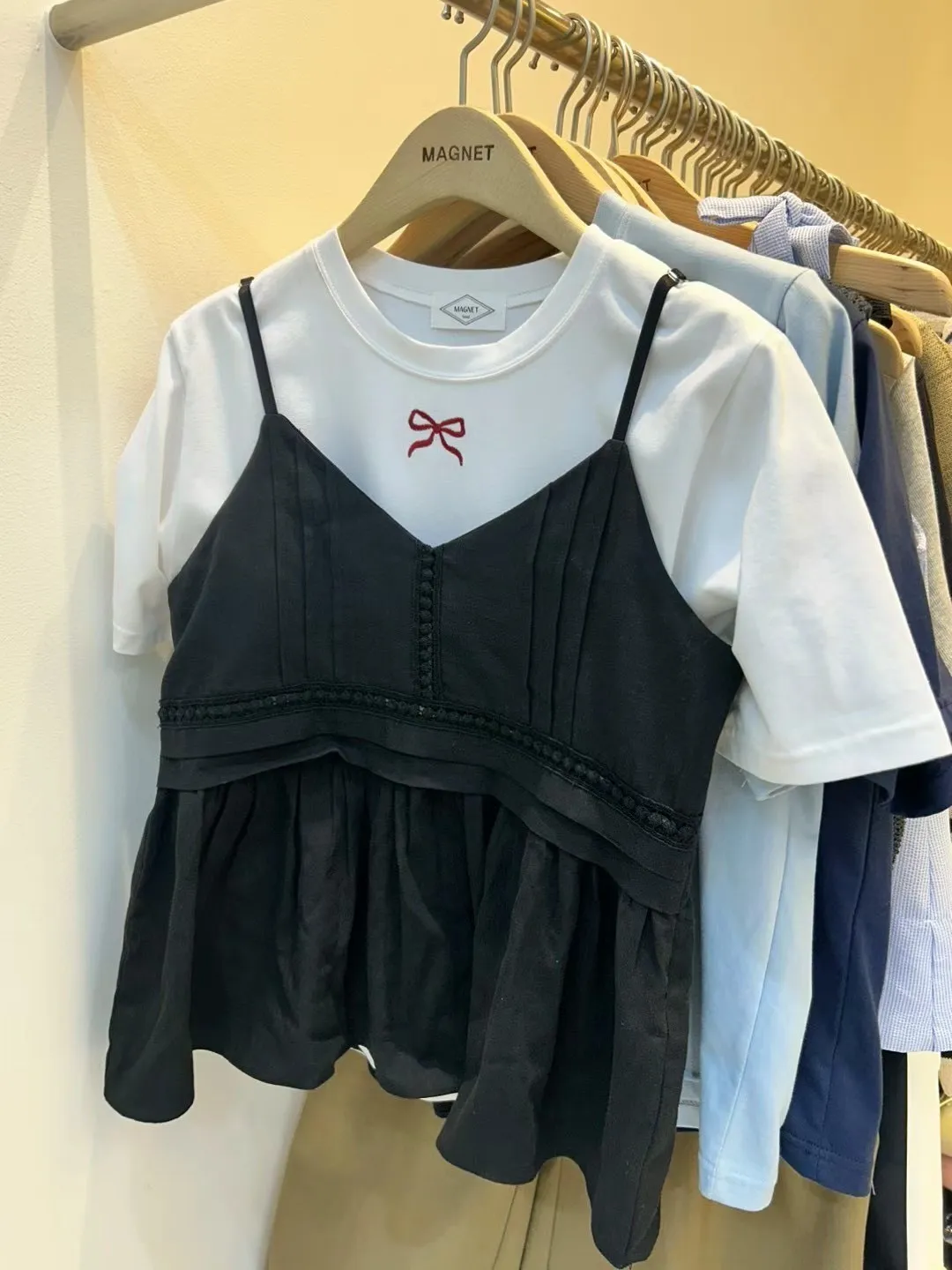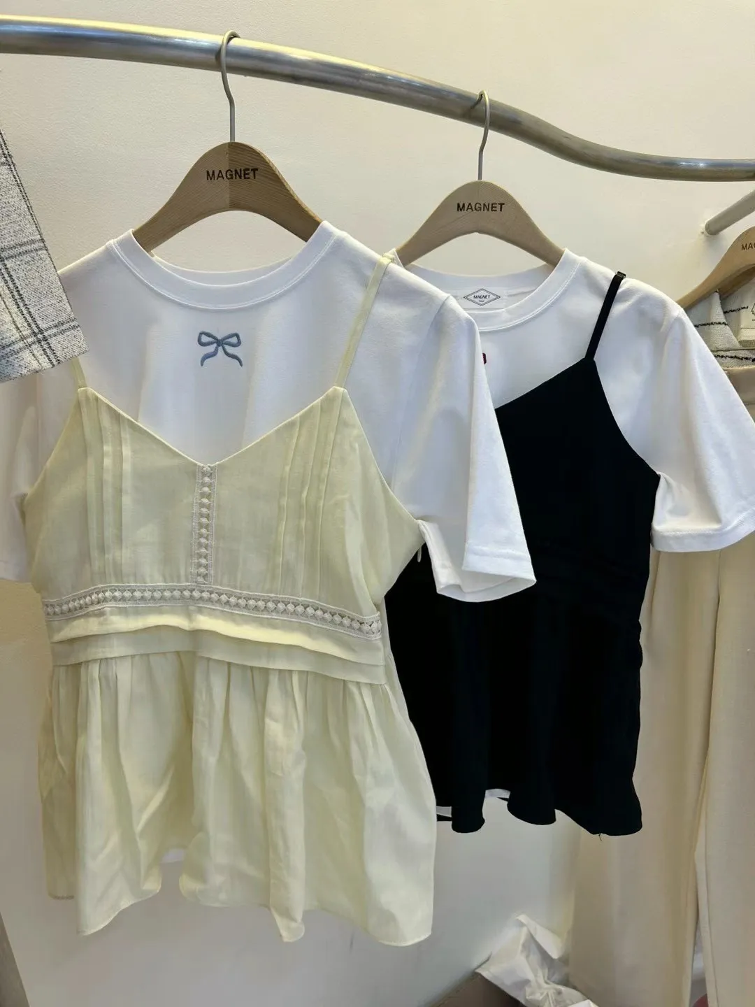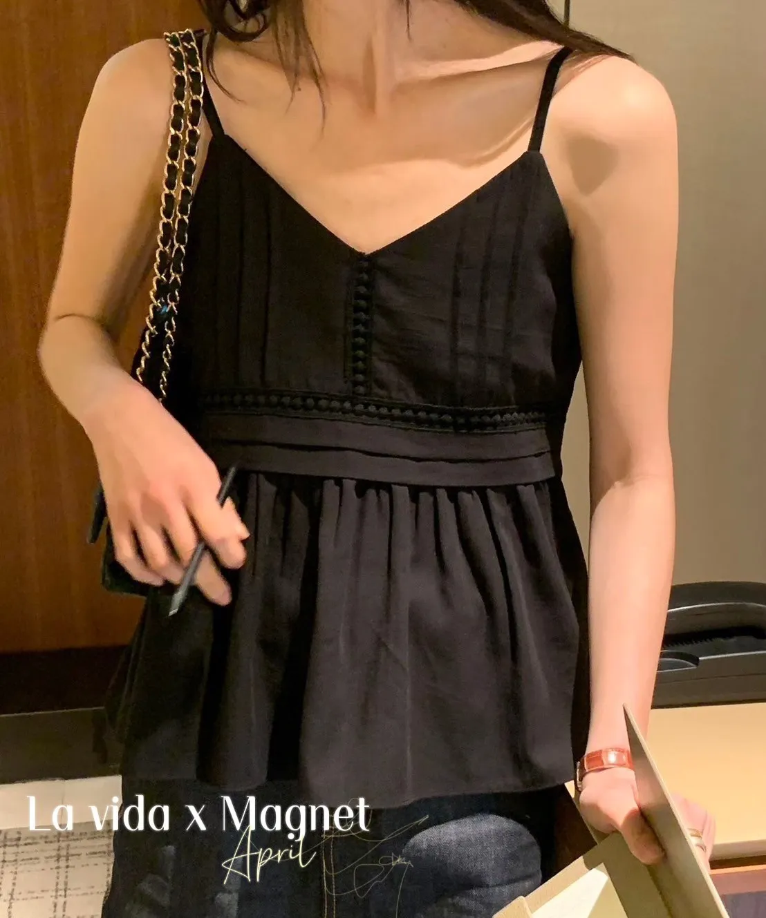 TA579蕾絲拼接娃娃裝細肩帶上衣 米 黑 官網價$899 線上價$869
