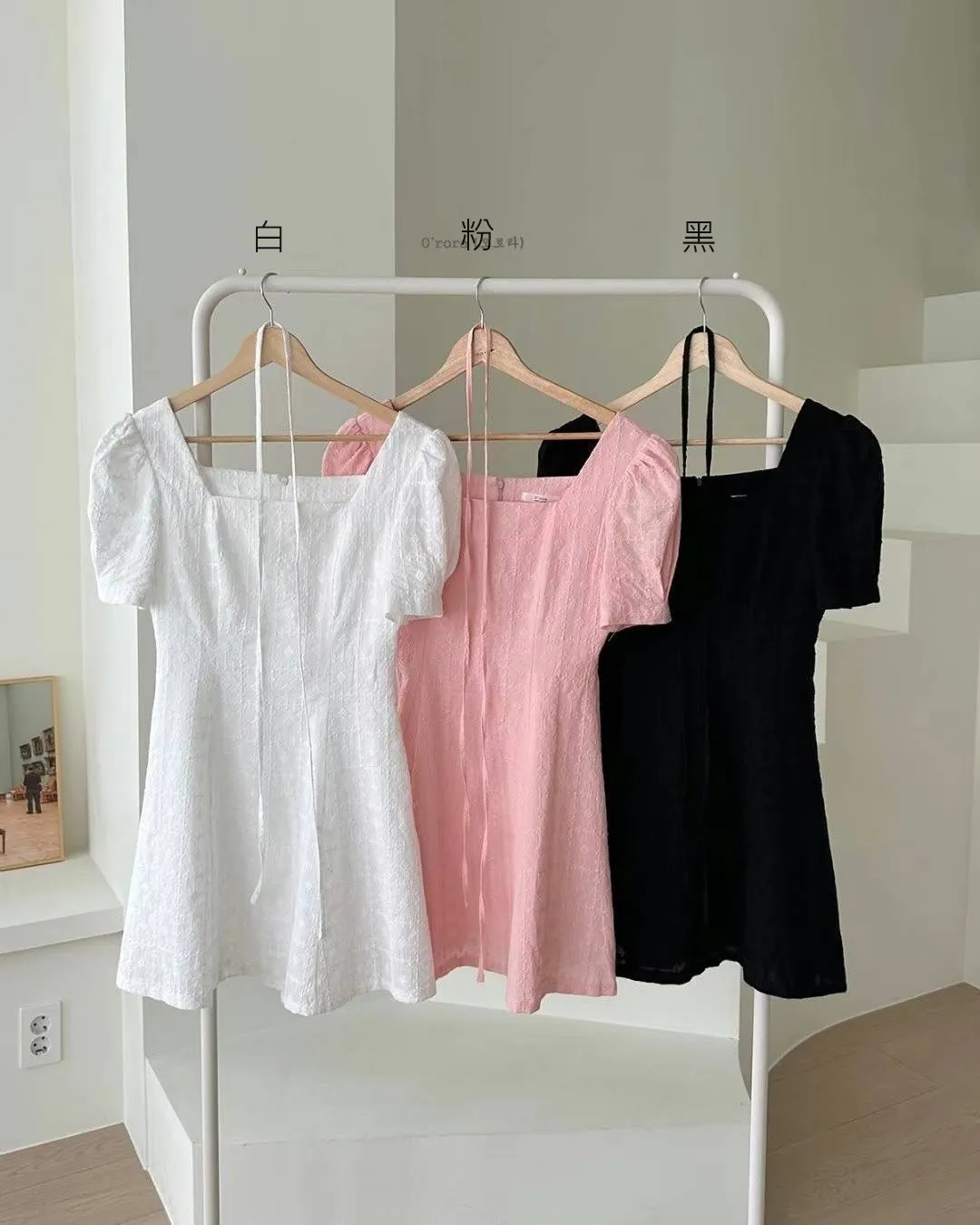 TA649方領精緻刺繡洋裝(附綁帶) 白 粉 黑 官網價$1190 線上價$1160